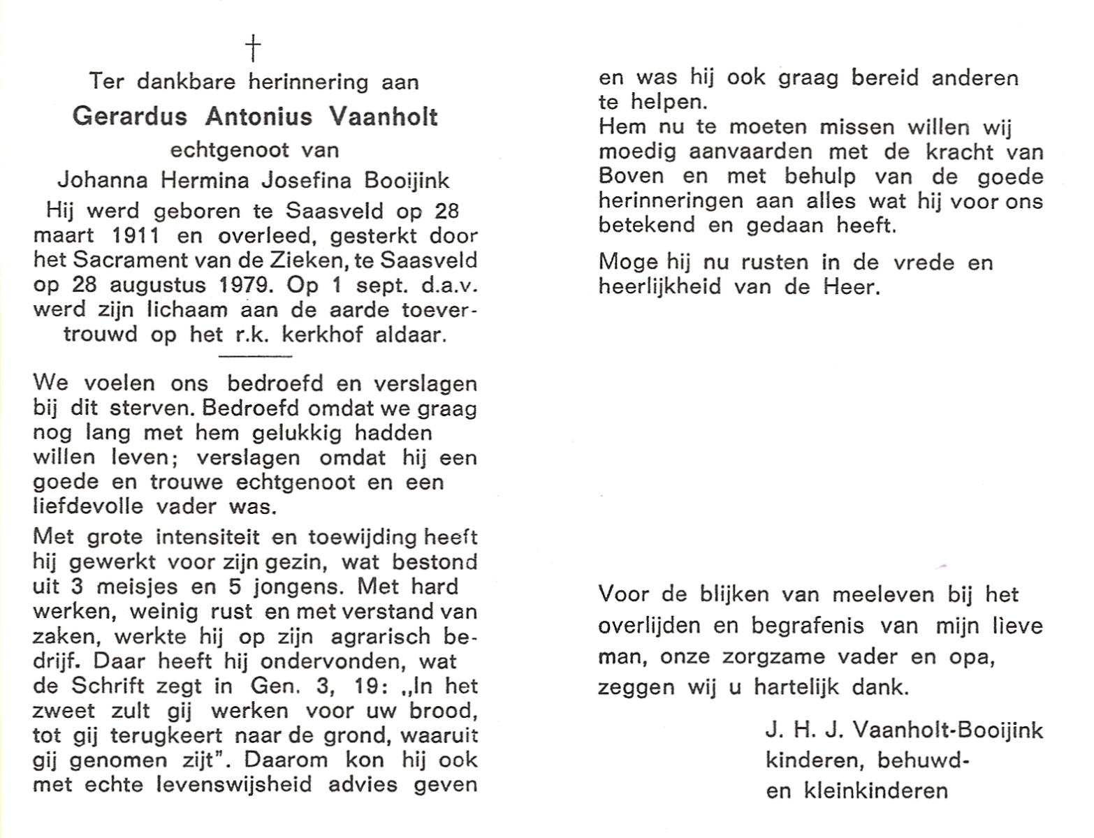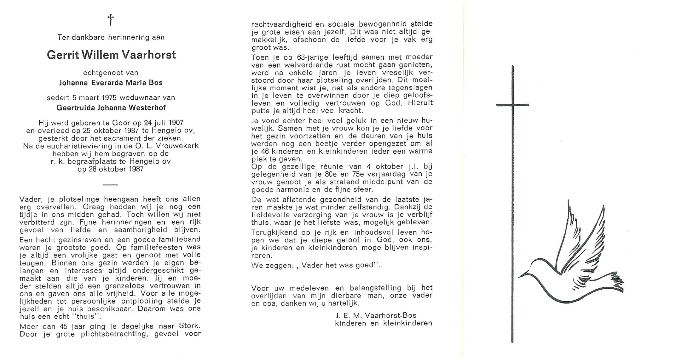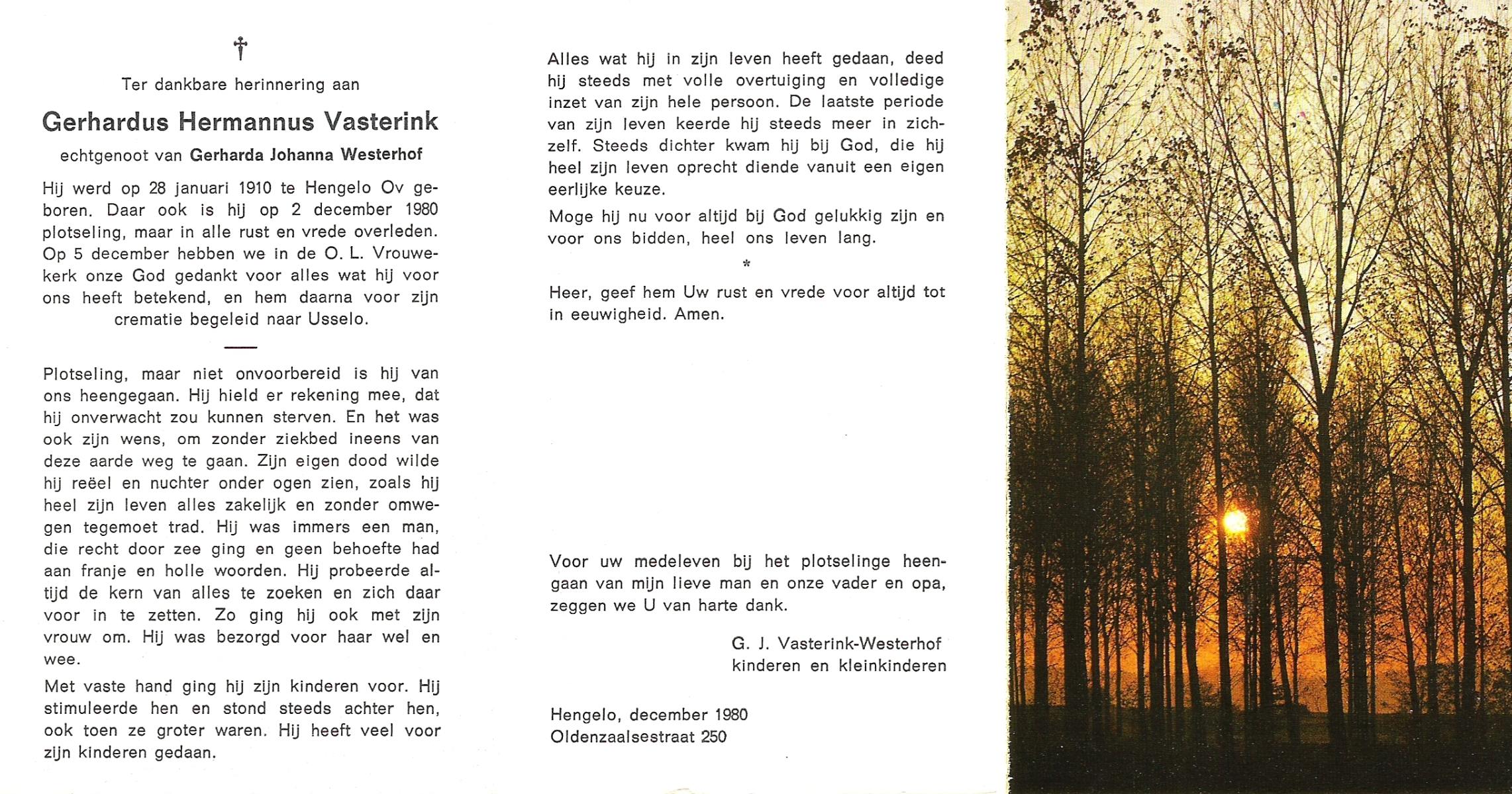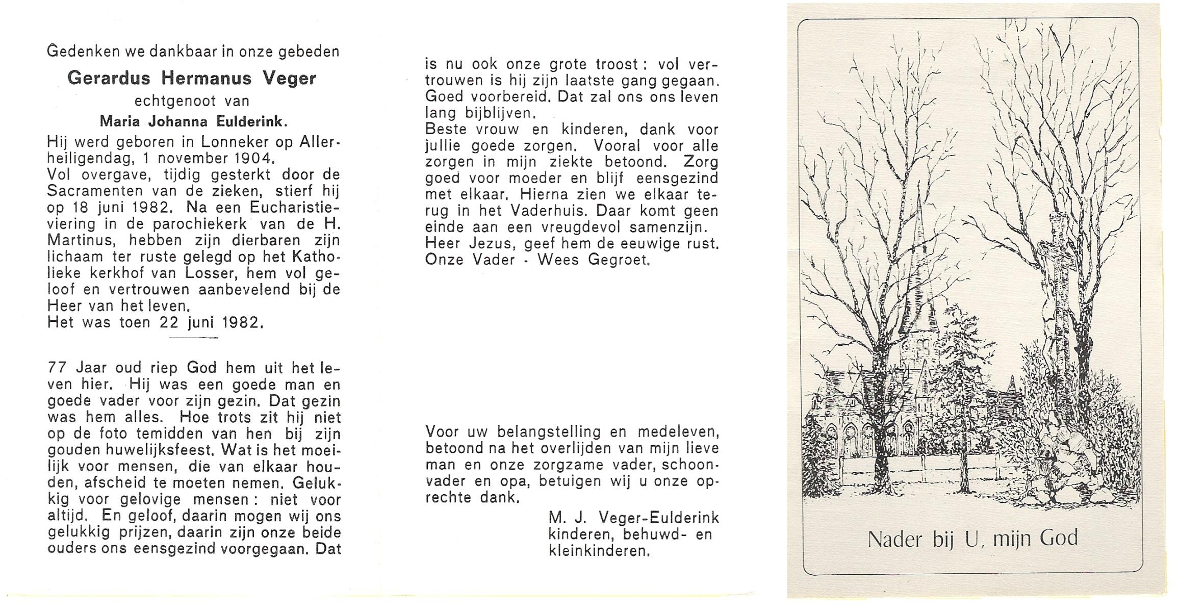 VEGER, Gerardus Hermanus, geboren op 1-11-1904 te Lonneker, overleden op 18-6-1982 op 77-jarige leeftijd, begraven op 22-6-1982 te Losser.