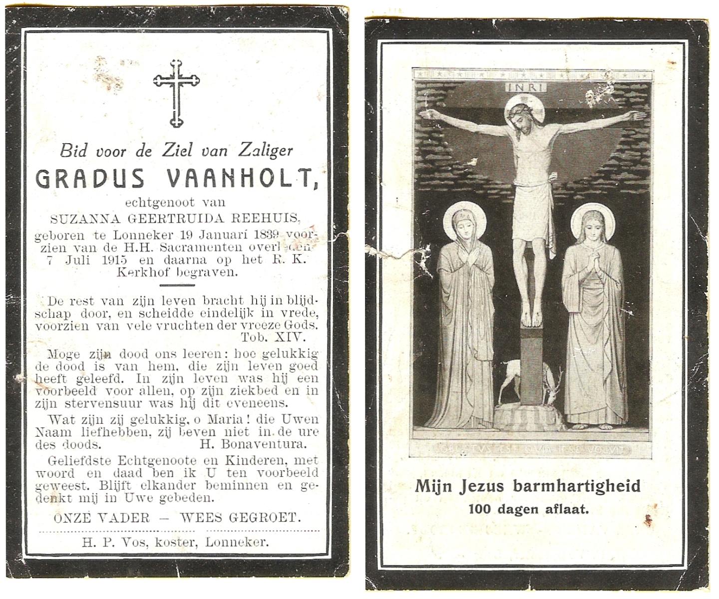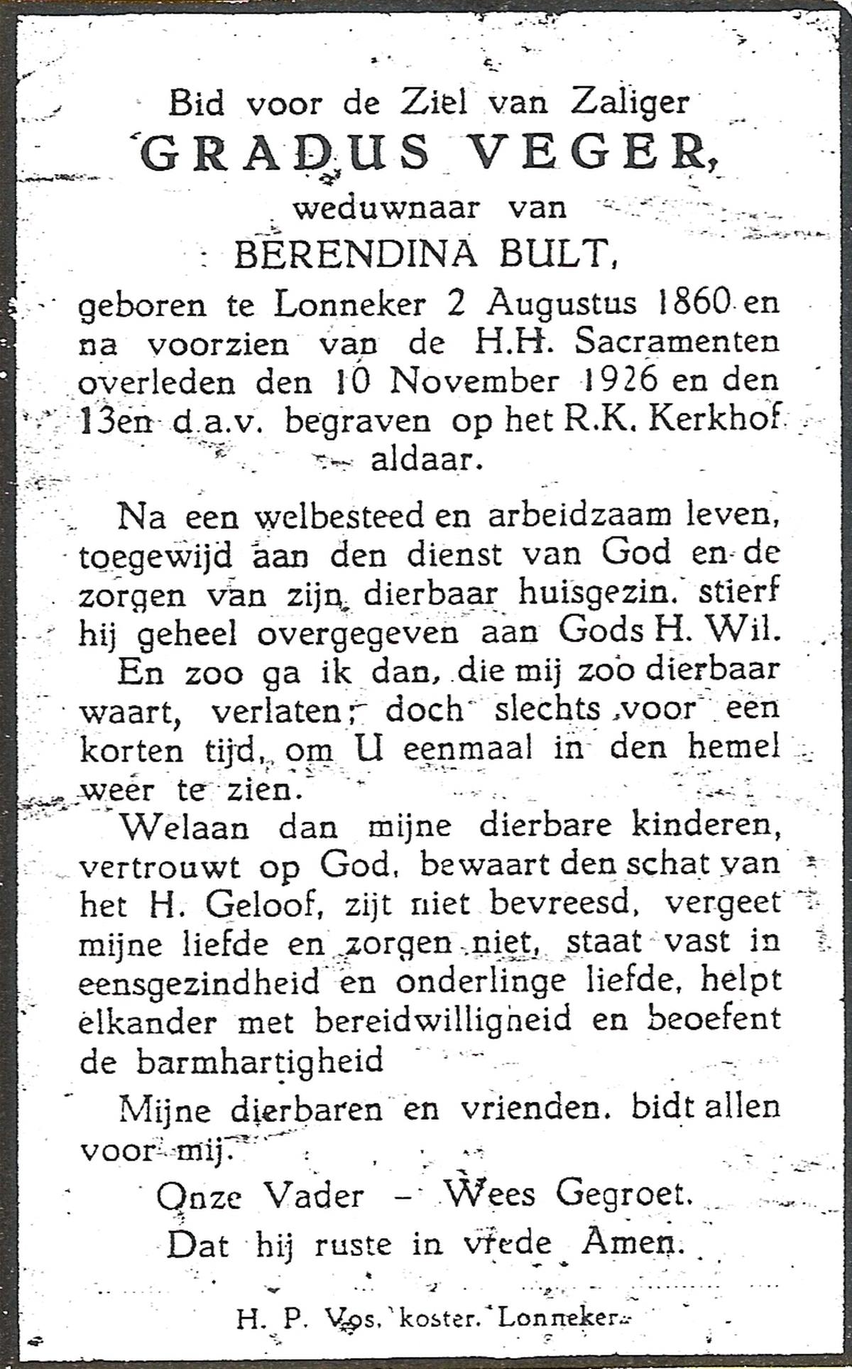 VEGER, Gradus, geboren op 02-08-1860 te Lonneker, overleden op 10-11-1926 te Lonneker op 66-jarige leeftijd, begraven op 13-11-1926 te Lonneker.