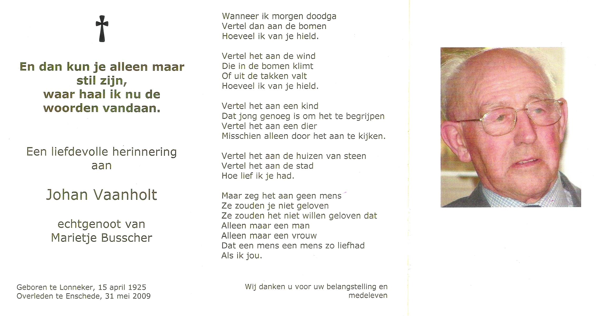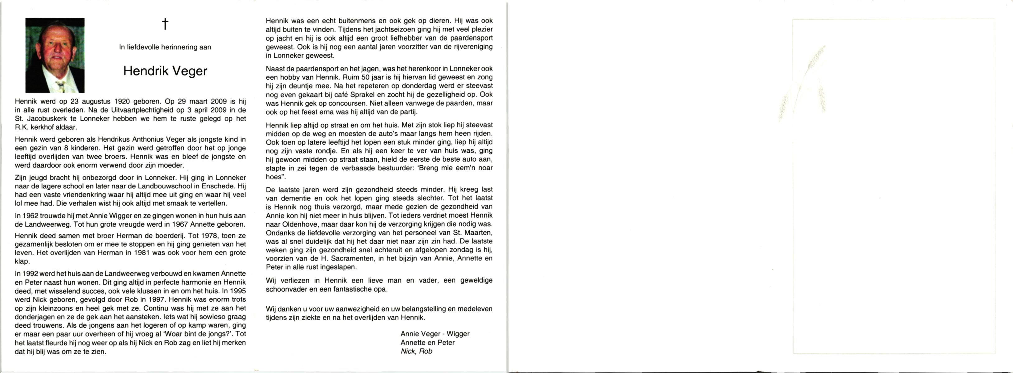 VEGER, , Hendrikus Anthonius (Hendrik), geboren op 23-8-1920, overleden op 29-3-2009 te Enschede op 88-jarige leeftijd, begraven op 3-4-2009 te Lonneker.