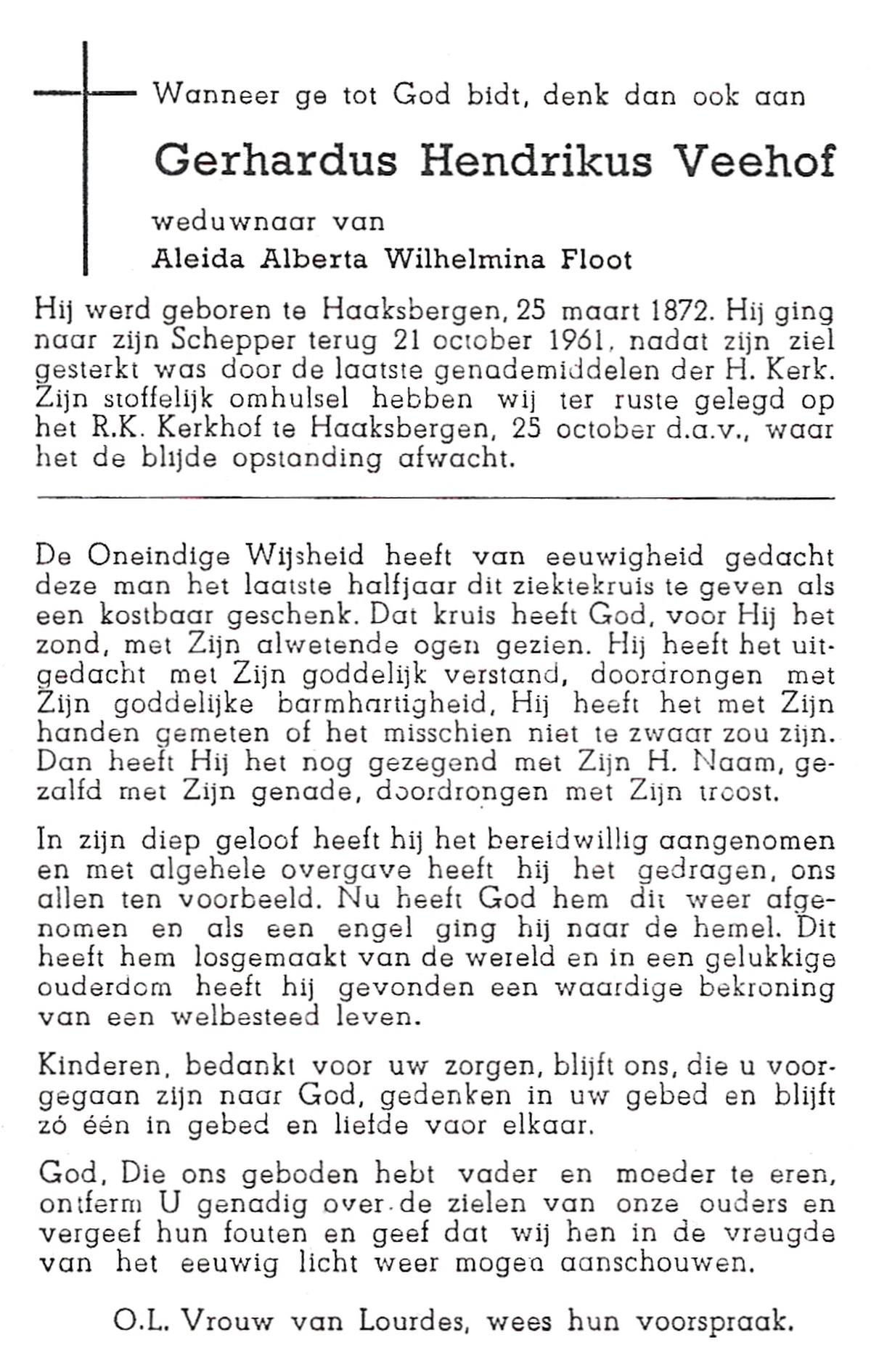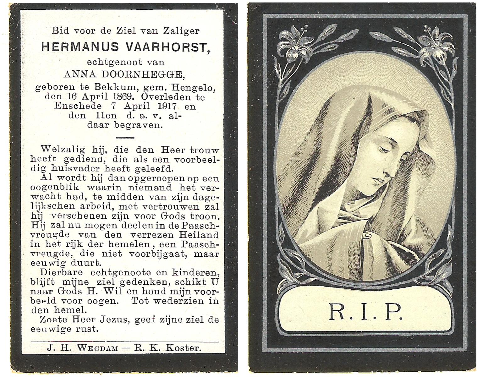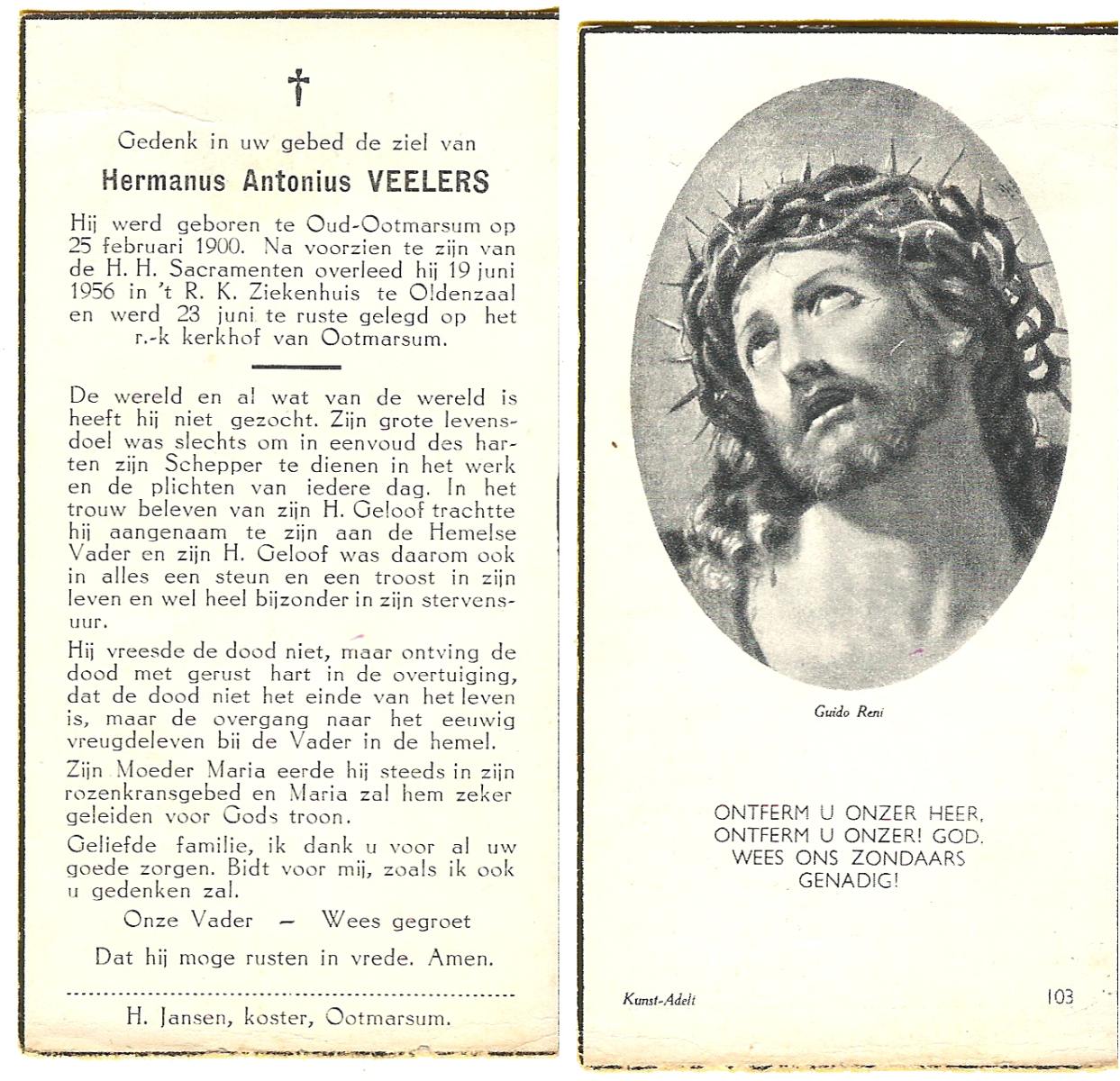 VEELERS, Hermanus Antonius, geboren op 25-2-1900 te Oud Ootmarsum, overleden op 19-6-1956 te Oldenzaal op 56-jarige leeftijd, begraven op 23-6-1956 te Ootmarsum.