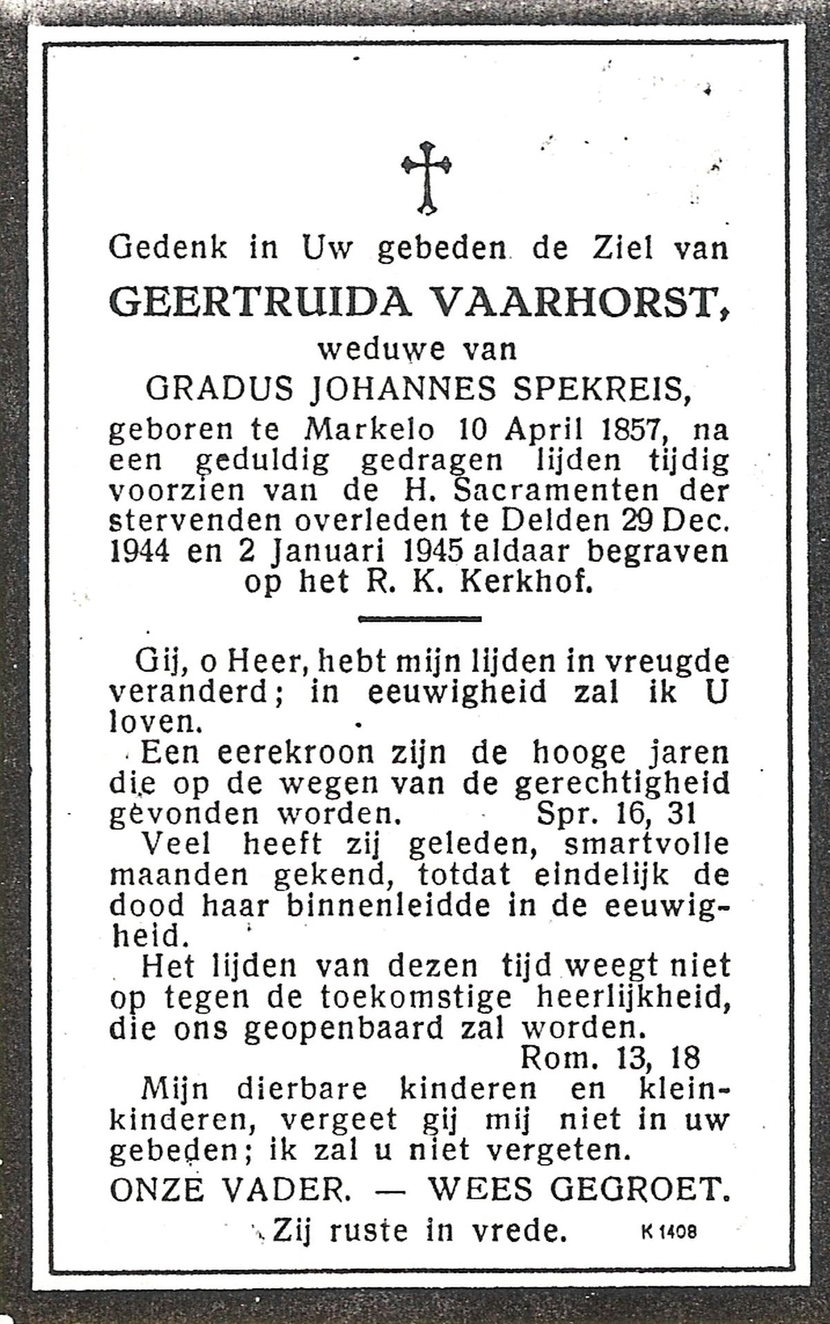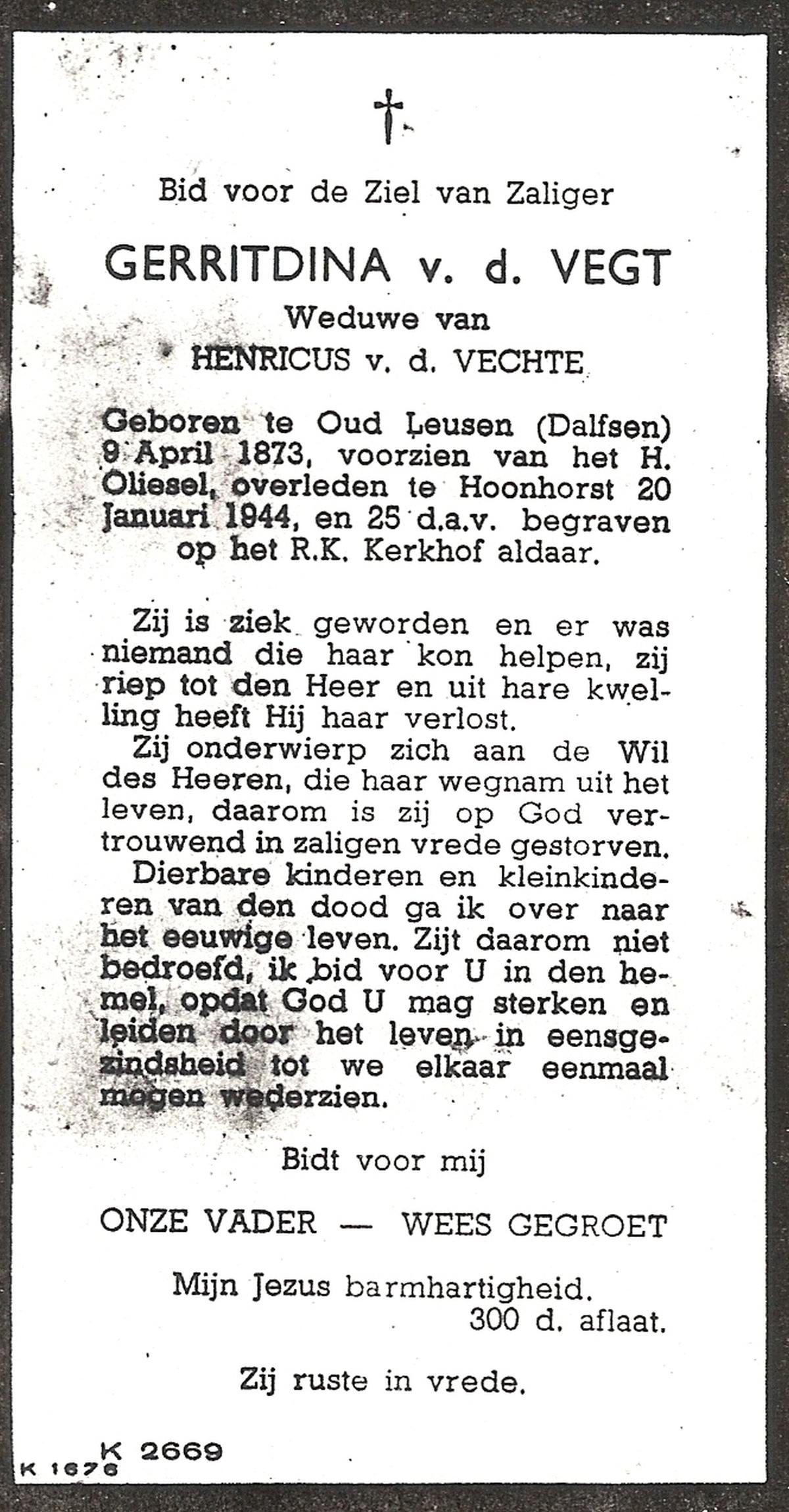 VEGT, v.d., Gerritdina, geboren op 09-04-1873 te Oud-Leusen, overleden op 20-1-1944 te Hoonhorst op 70-jarige leeftijd, begraven op 25-1-1944 te Hoonhorst.