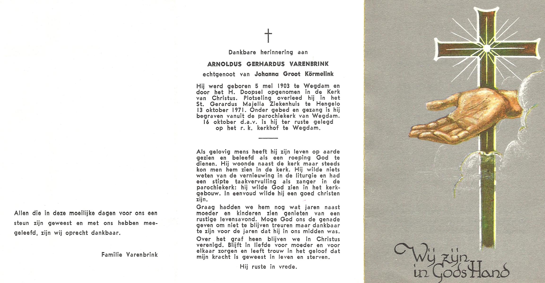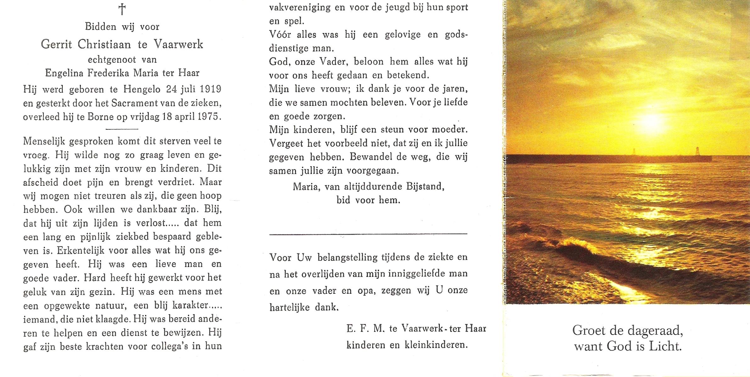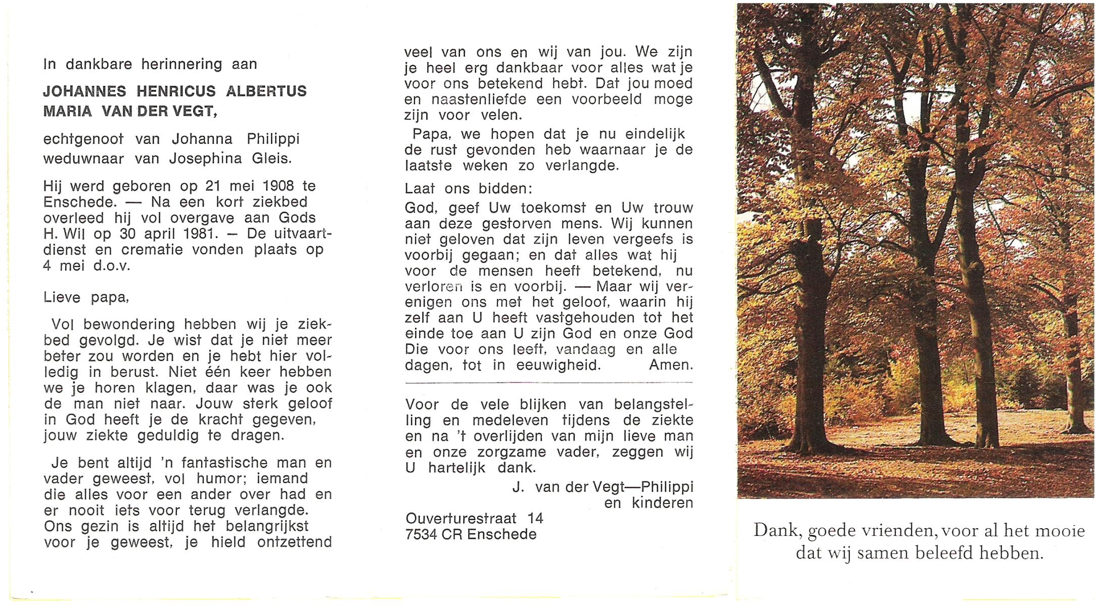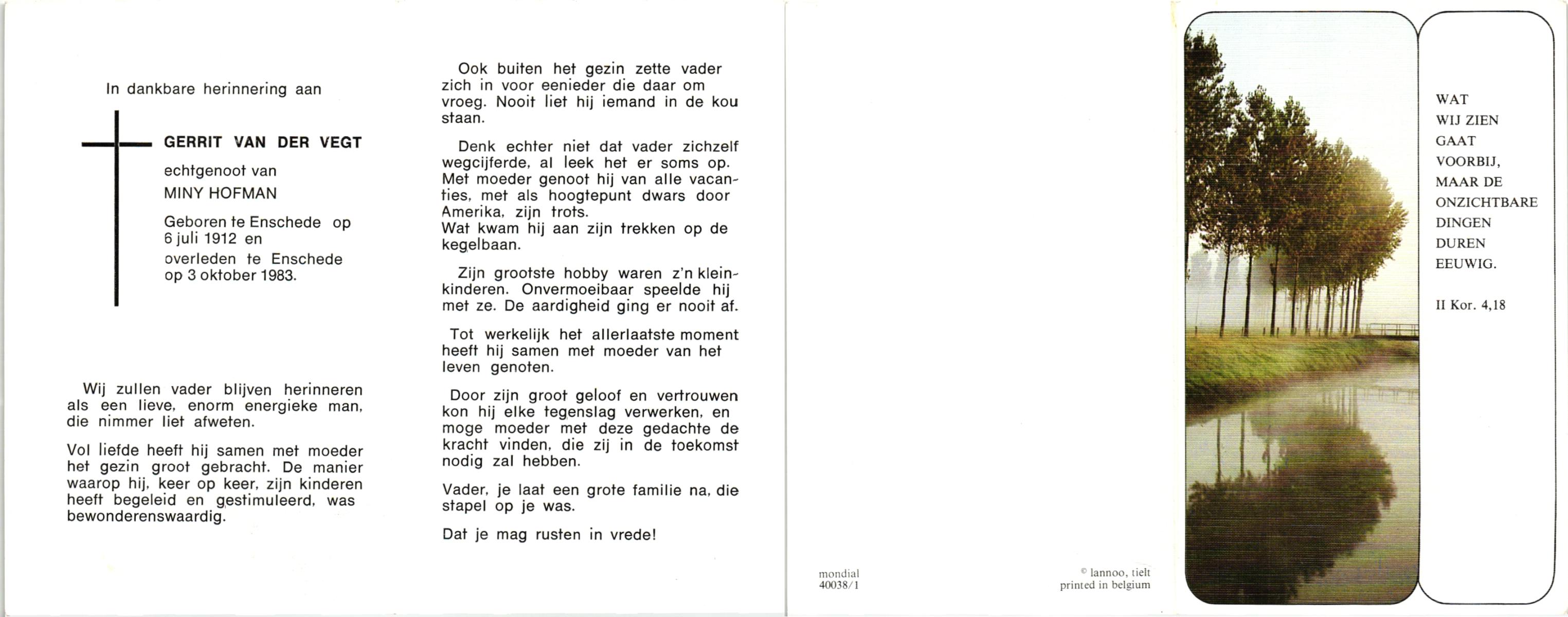 VEGT, van der, Gerrit, geboren op 6-7-1912 te Enschede, overleden op 3-10-1983 te Enschede op 71-jarige leeftijd.
