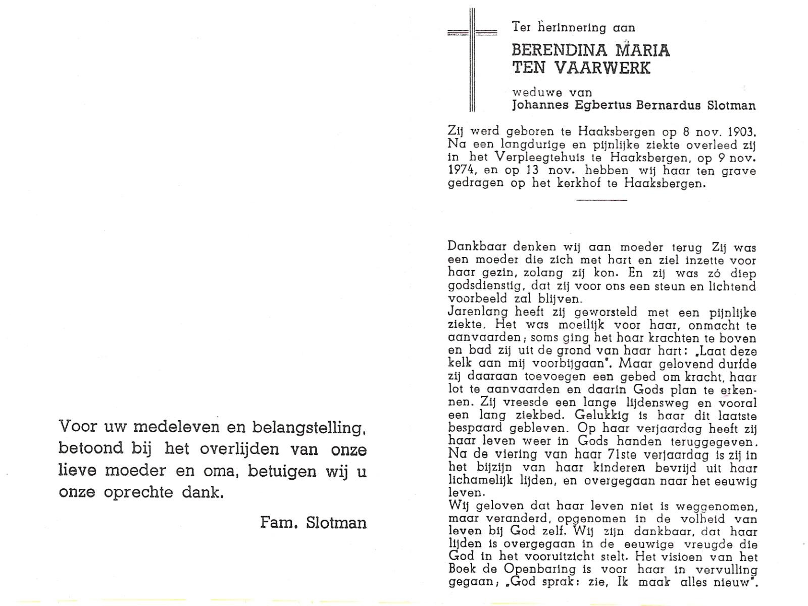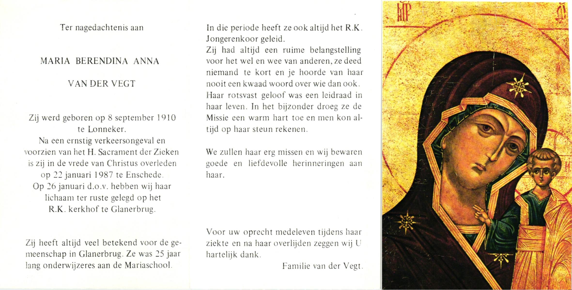 VEGT, van der, Maria Berendina Anna, geboren op 8-9-1910 te Lonneker, overleden op 22-1-1987 te Enschede op 76-jarige leeftijd, begraven op 26-1-1987 te Glanerbrug.