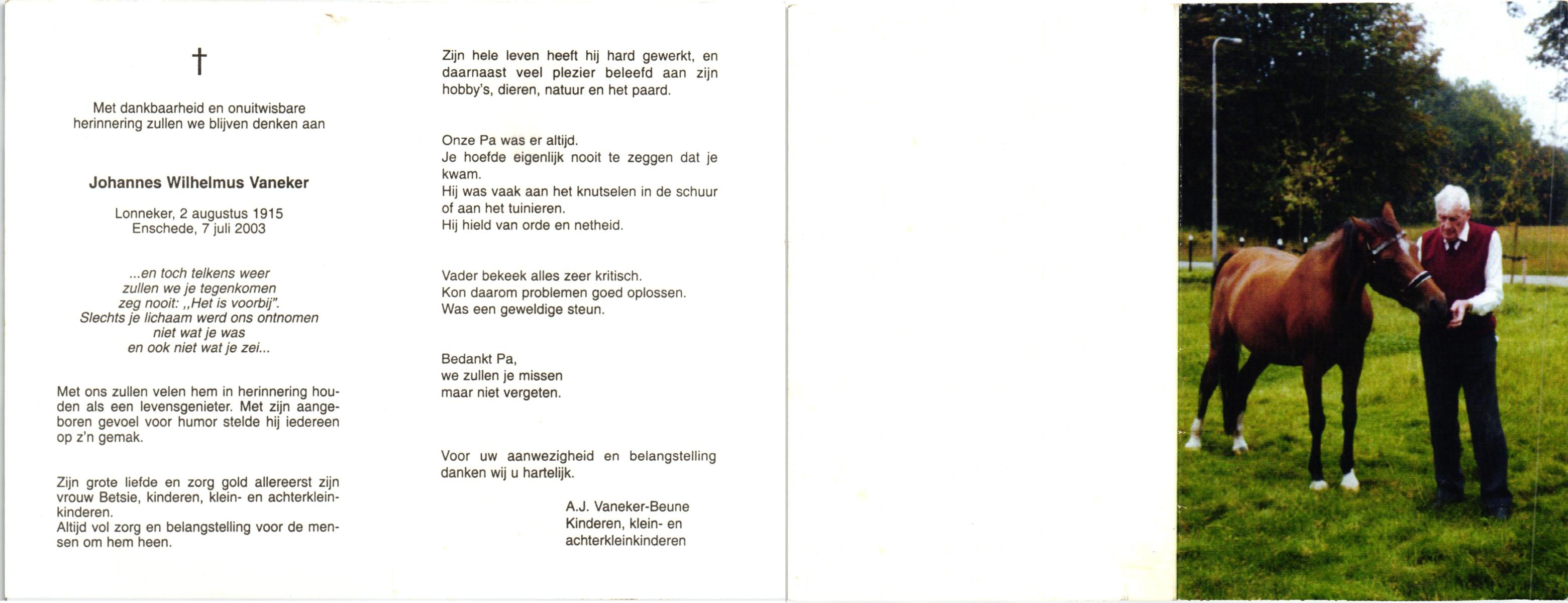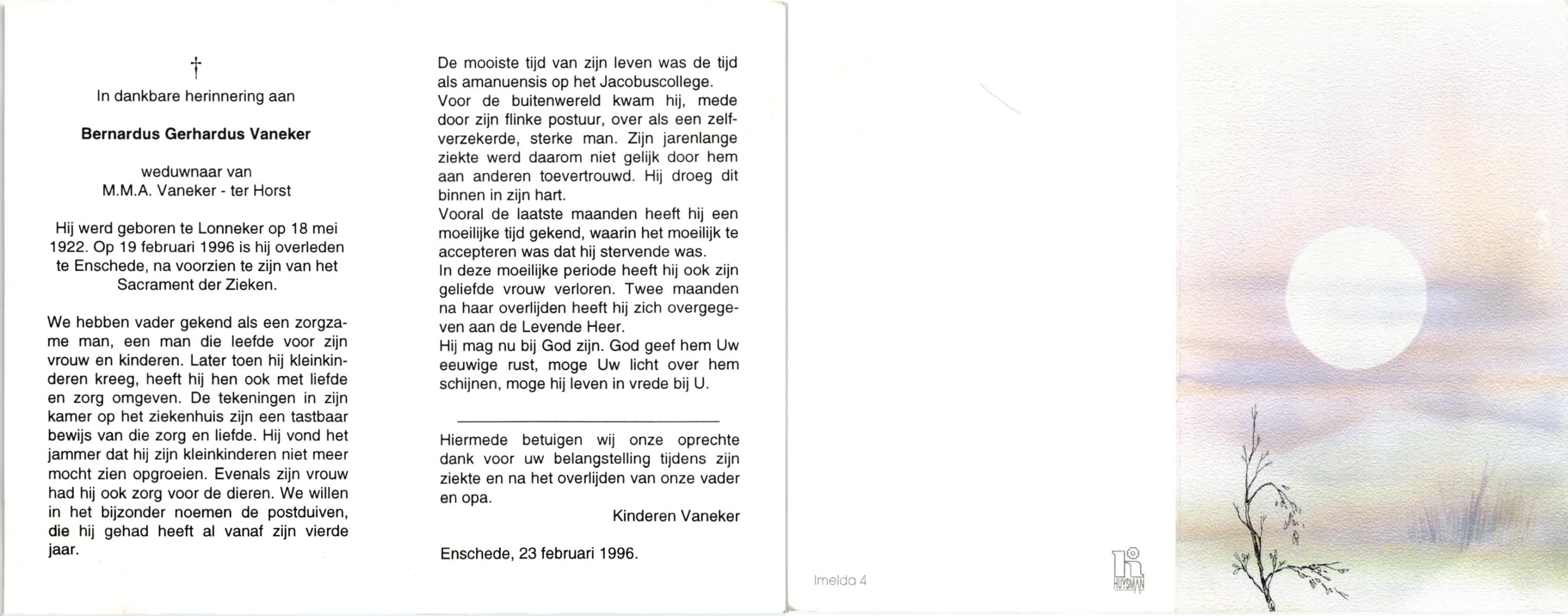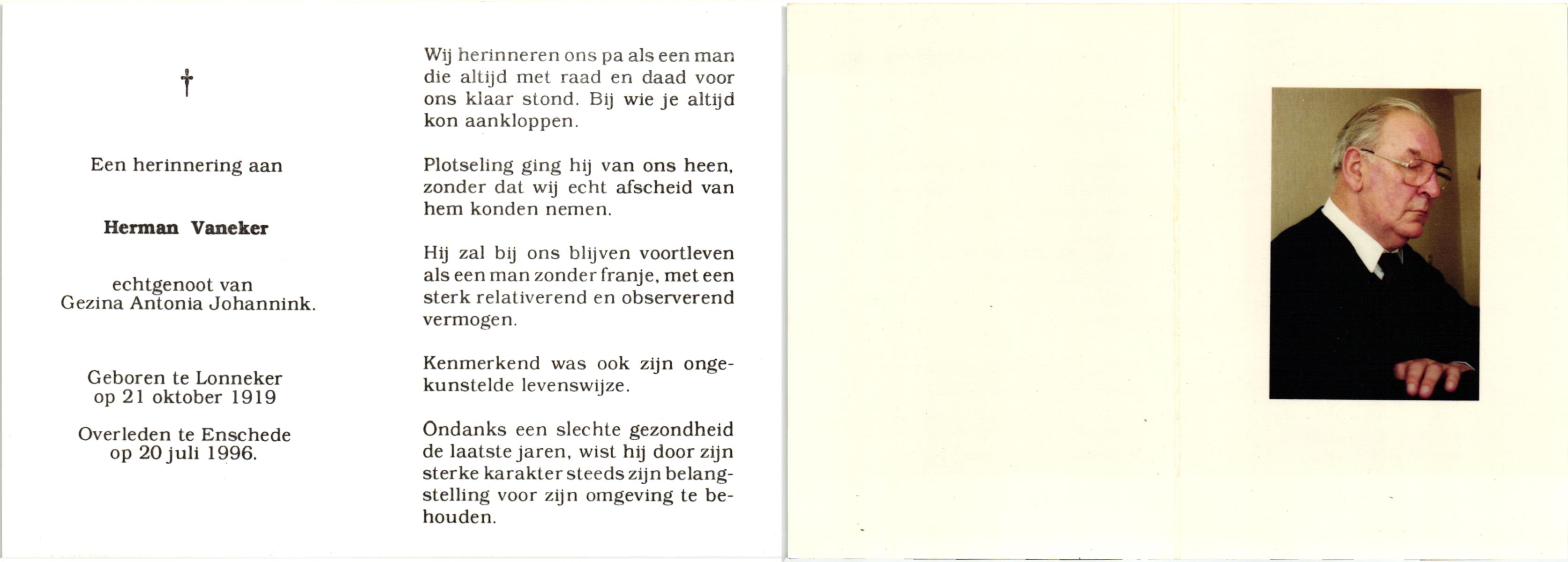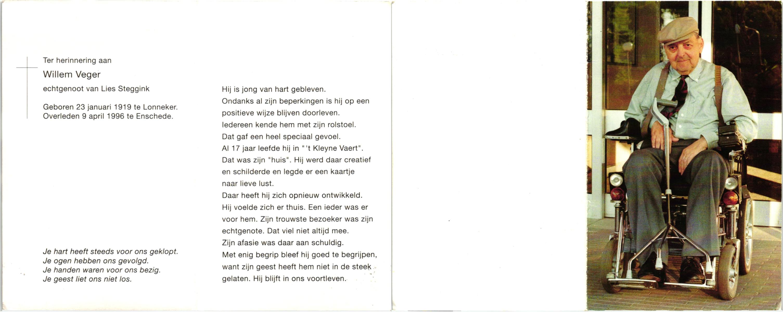 VEGER, , Willem, geboren op 23-1-1919 te Lonneker, overleden op 9-4-1996 te Enschede op 77-jarige leeftijd.