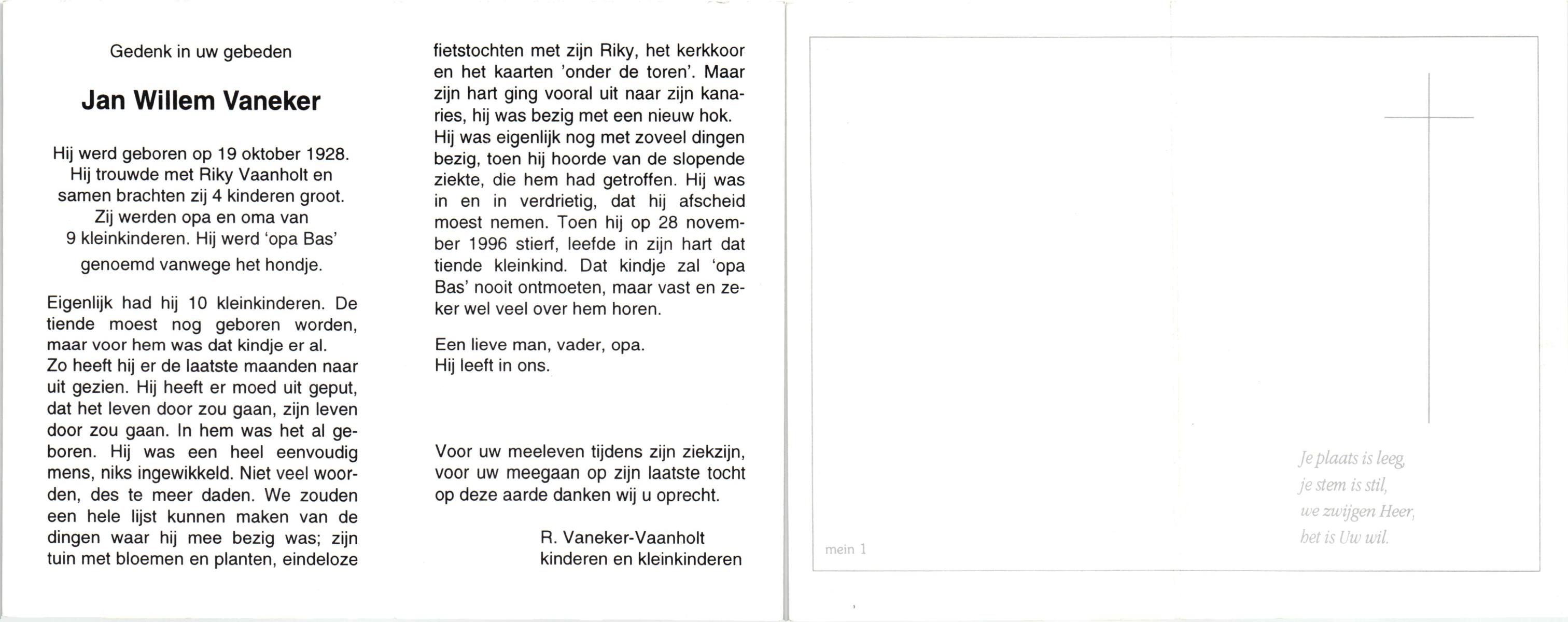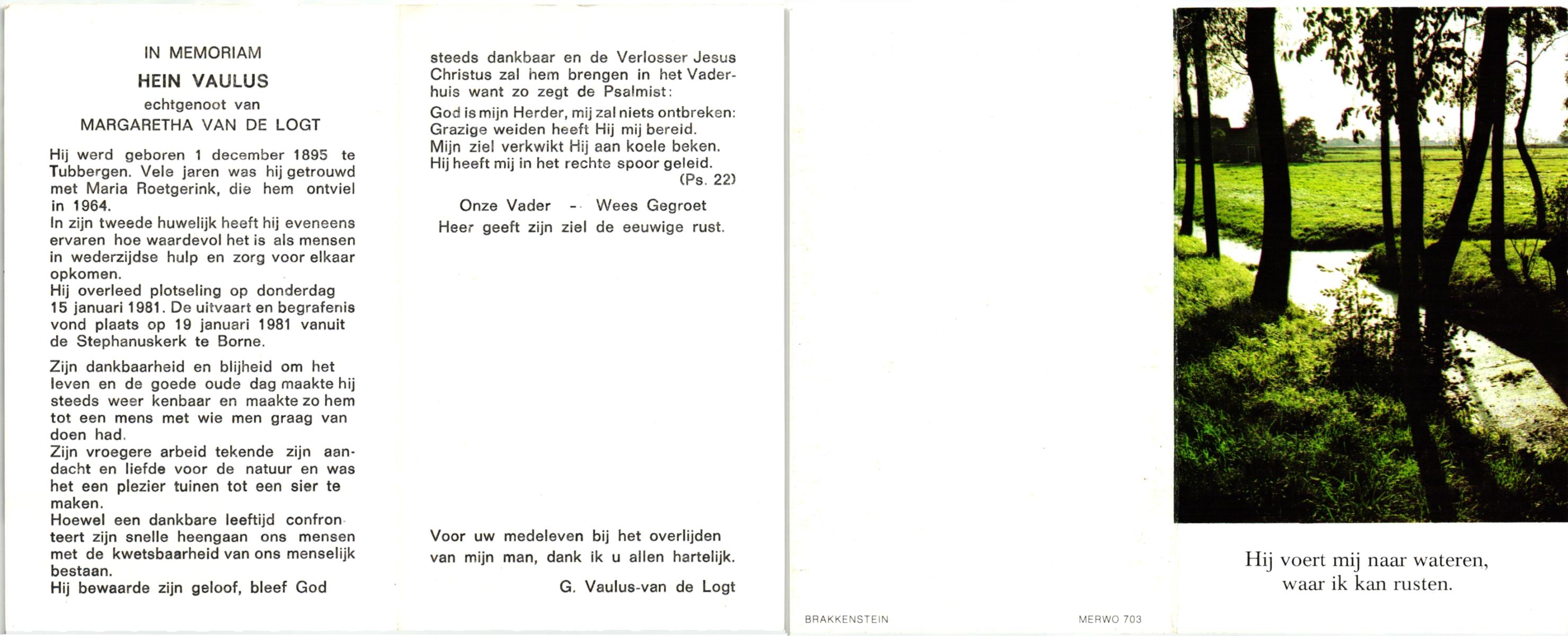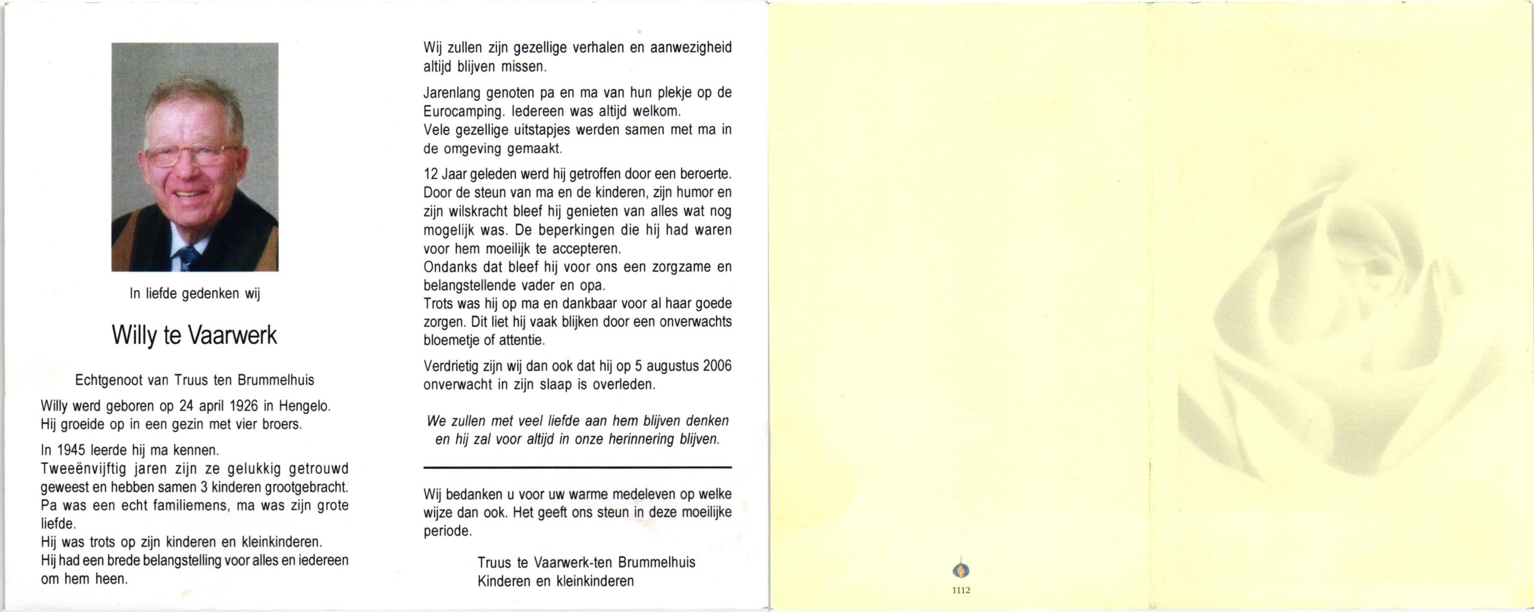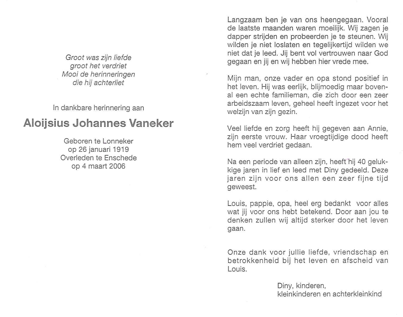 VEGER, , Willem, geboren op 23-1-1919 te Lonneker, overleden op 9-4-1996 te Enschede op 77-jarige leeftijd.