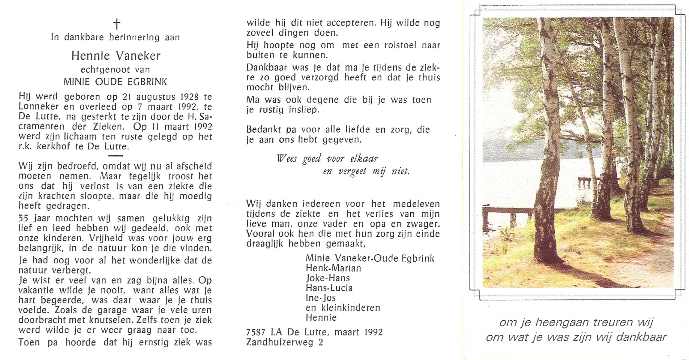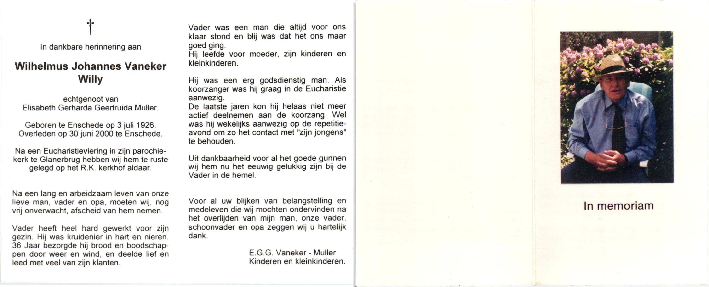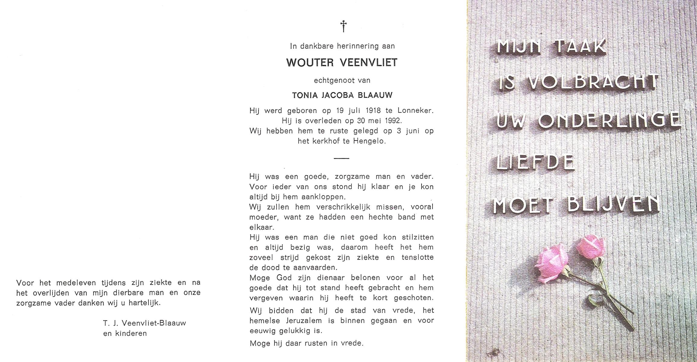 VEENVLIET, Wouter, geboren op 19-7-1918 te Lonneker, overleden op 30-5-1992 op 73-jarige leeftijd, begraven op 3-6-1992 te Hengelo (Ov.).