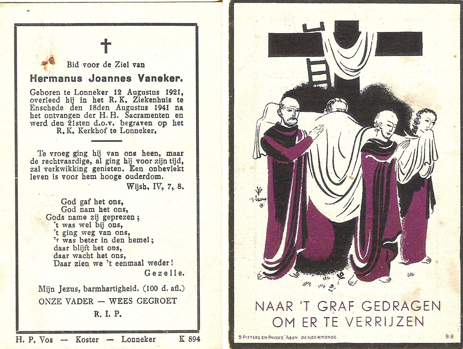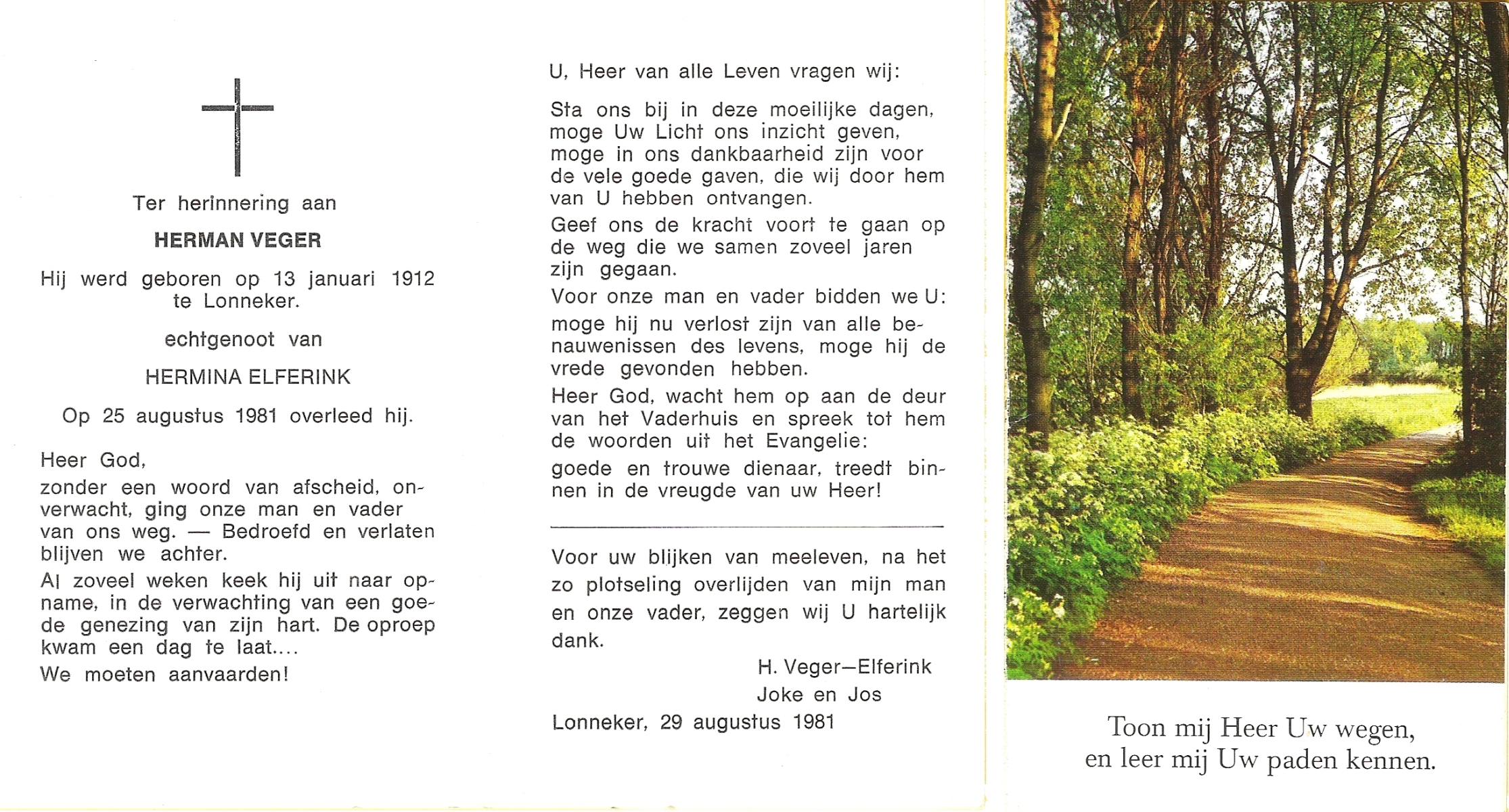 VEGER, Herman, geboren op 13-1-1912 te Lonneker, overleden op 25-8-1981 op 69-jarige leeftijd.