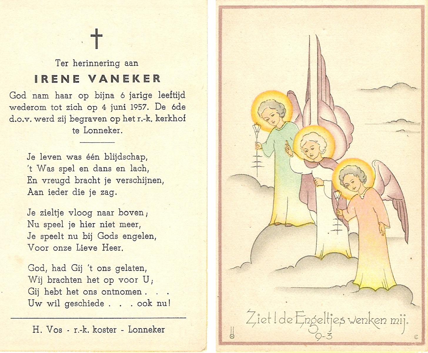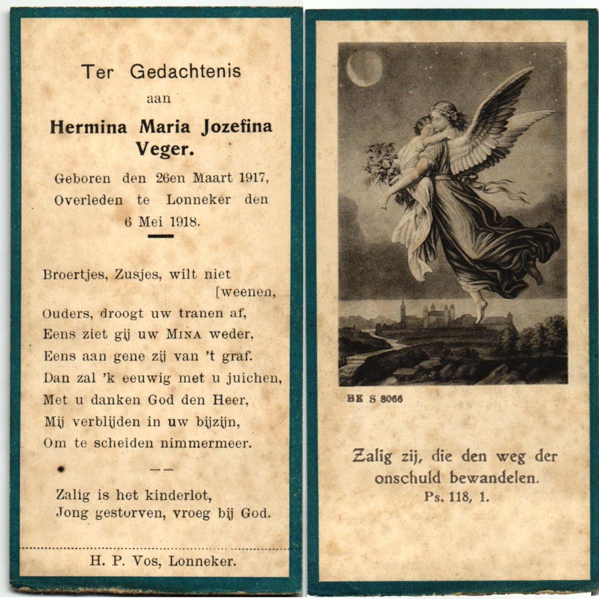 VEGER, Hermina Maria Jozefina, geboren op 26-3-1917 te Lonneker, overleden op 6-5-1918 te Lonneker op 1-jarige leeftijd.