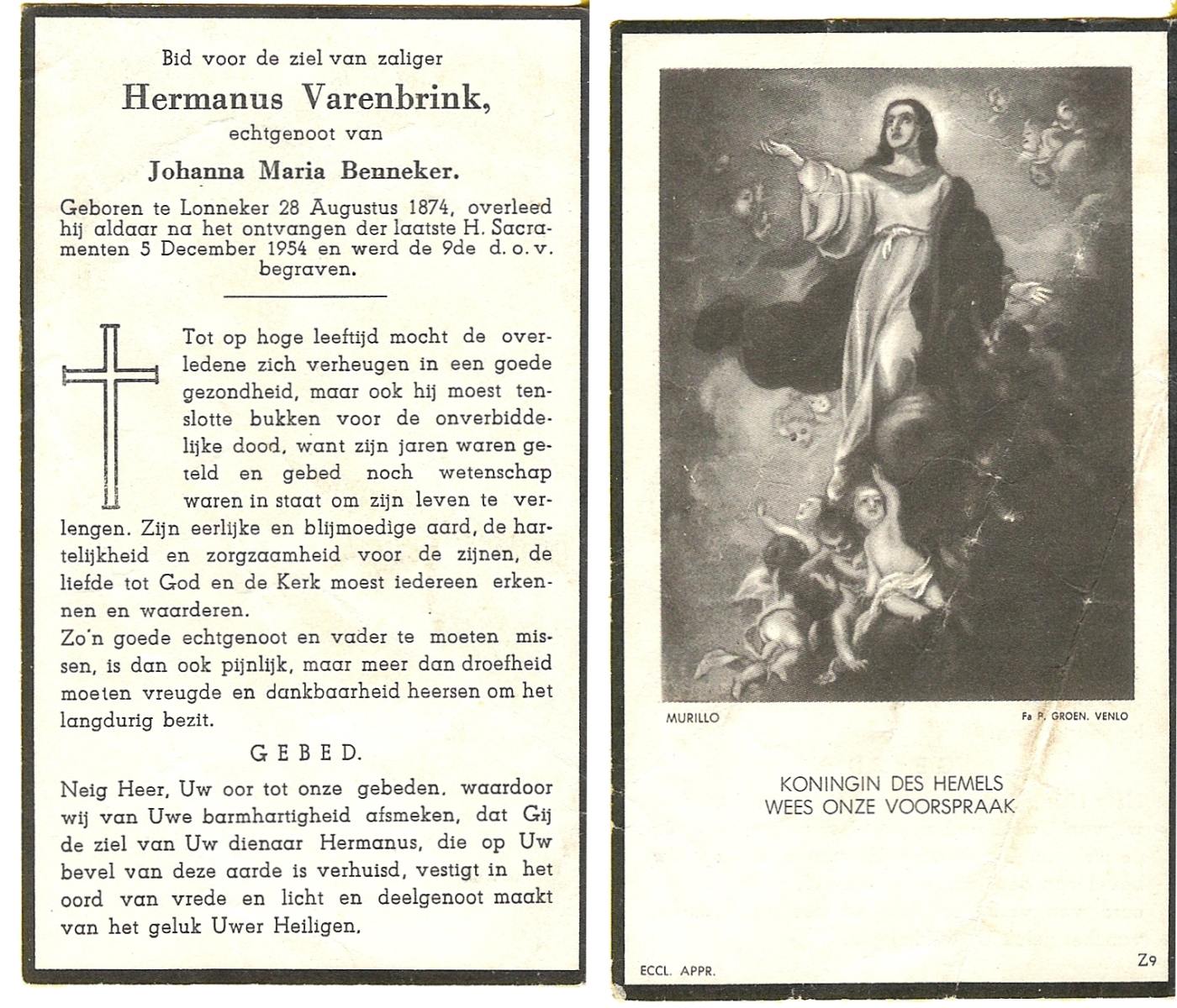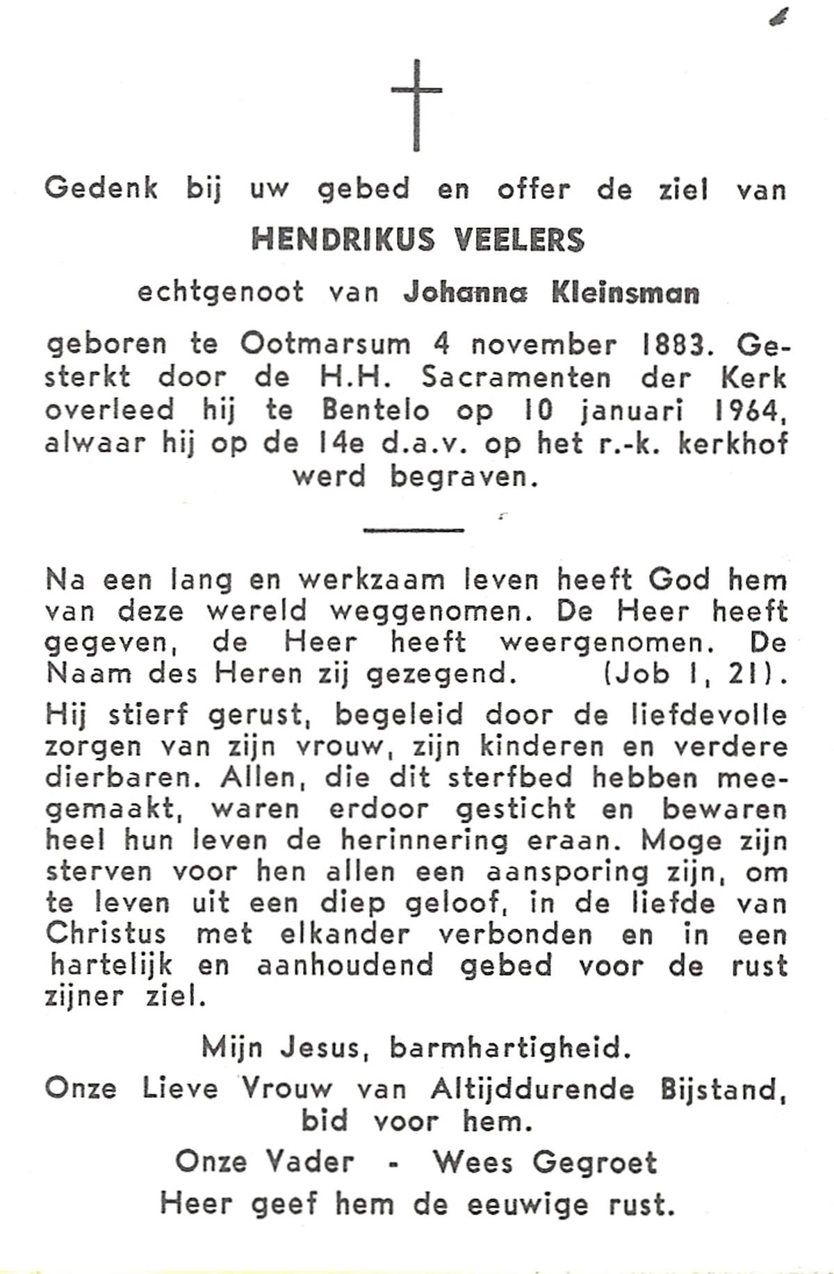 VEELERS, Hendrikus, geboren op 04-11-1883 te Ootmarsum, overleden op 10-1-1964 te Bentelo op 80-jarige leeftijd, begraven op 14-1-1964 te Bentelo.