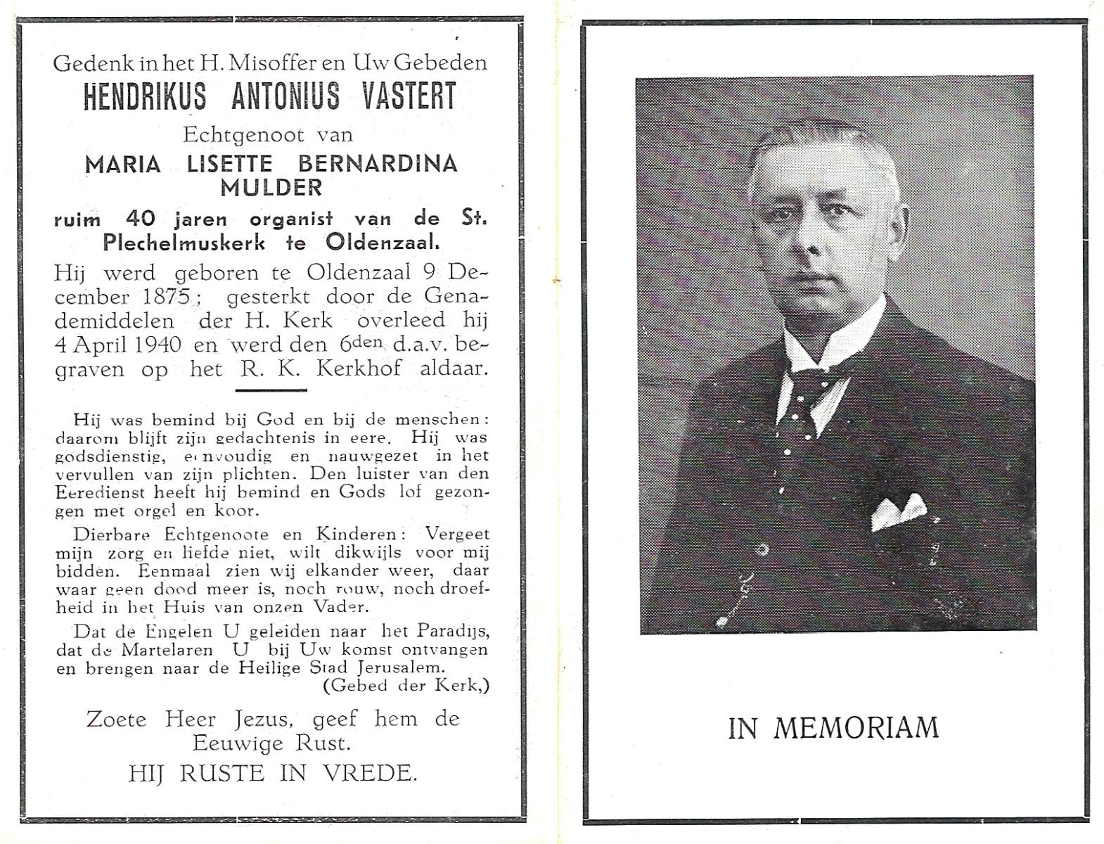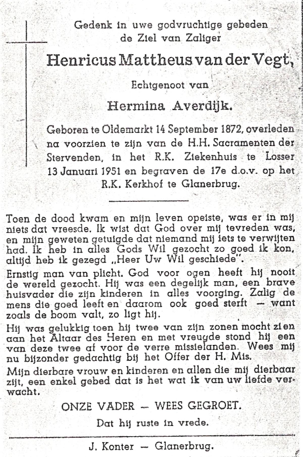 VEGT, van der, Henricus Mattheus, geboren op 14-09-1872 te Oldemarkt, overleden op 13-1-1951 te Losser op 78-jarige leeftijd, begraven op 17-1-1951 te Glanerbrug.