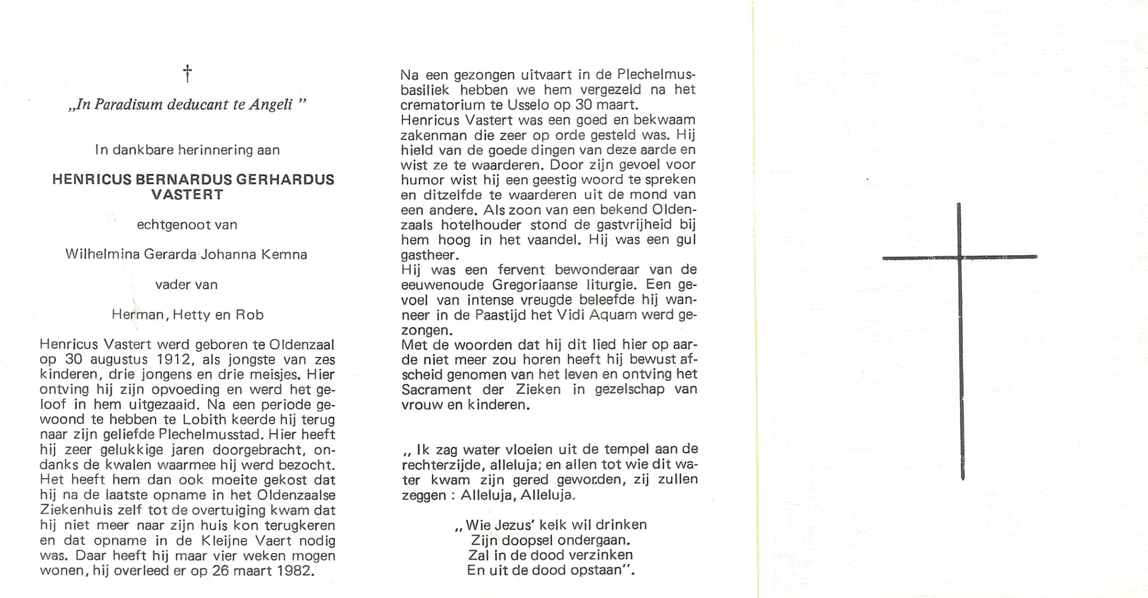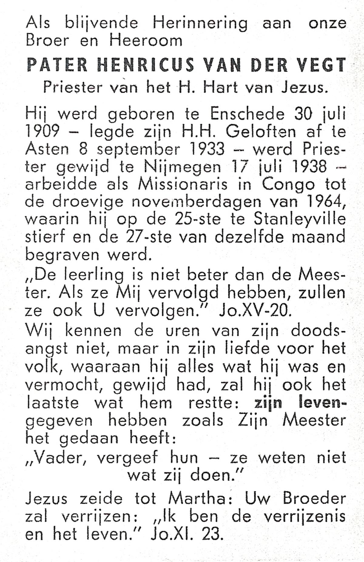 VEGT, van der, Henricus, geboren op 30-7-1909 te Enschede, overleden op 25-11-1964 te Stanleyville, Congo op 55-jarige leeftijd, begraven op 27-11-1964 te Congo.