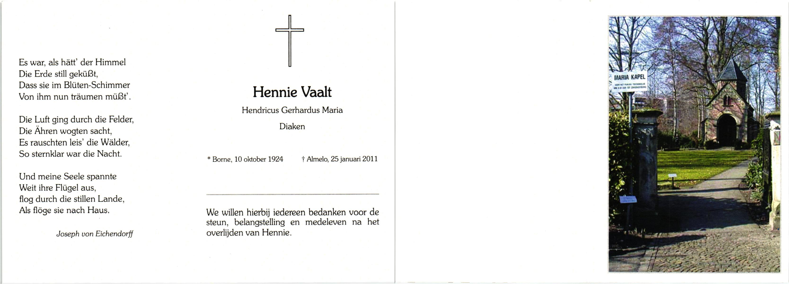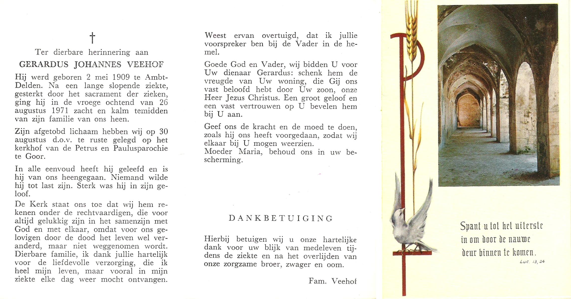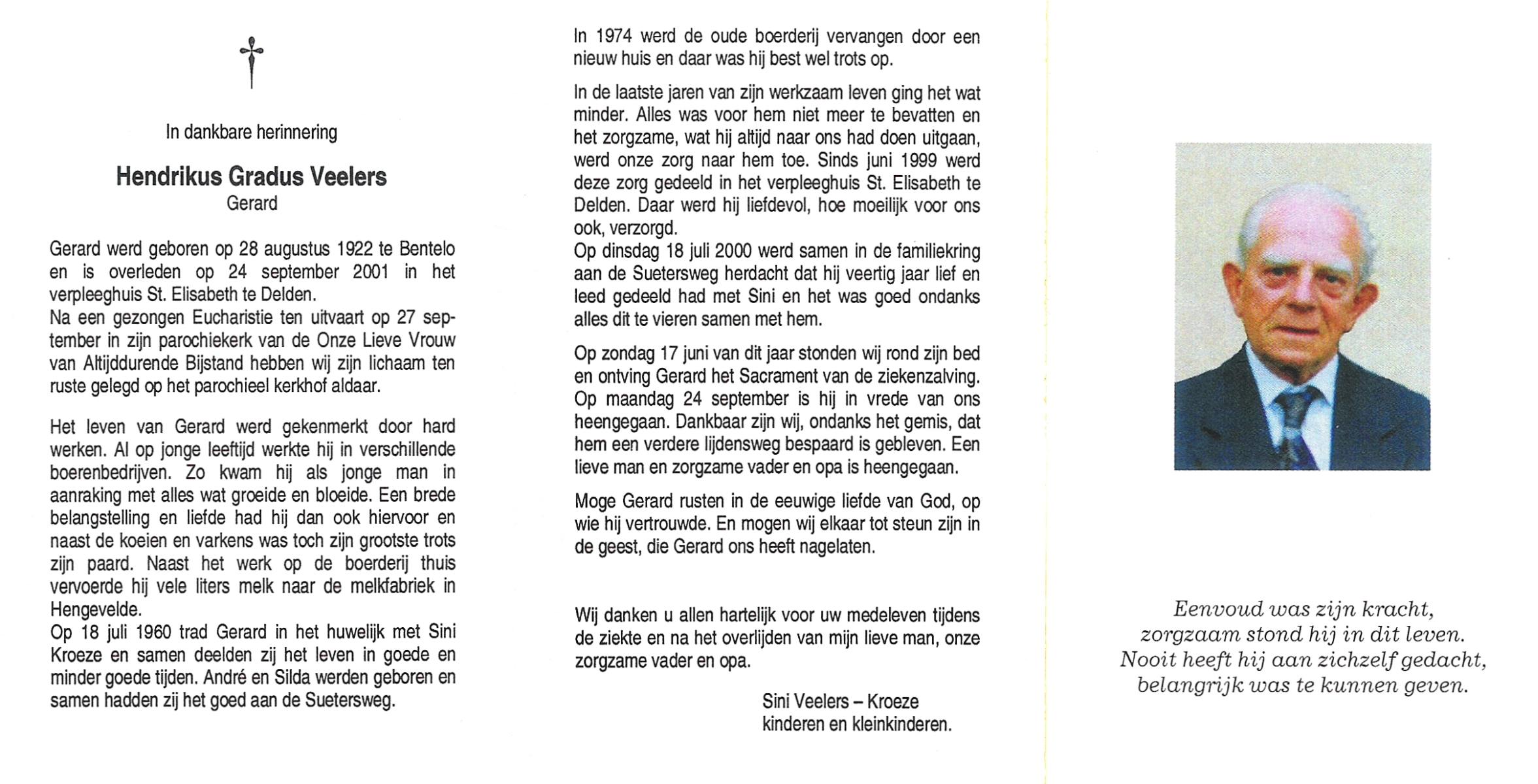 VEELERS, Hendrikus Gradus (Gerard), geboren op 28-8-1922 te Bentelo, overleden op 24-9-2001 te Delden op 79-jarige leeftijd, begraven op 27-9-2001.
