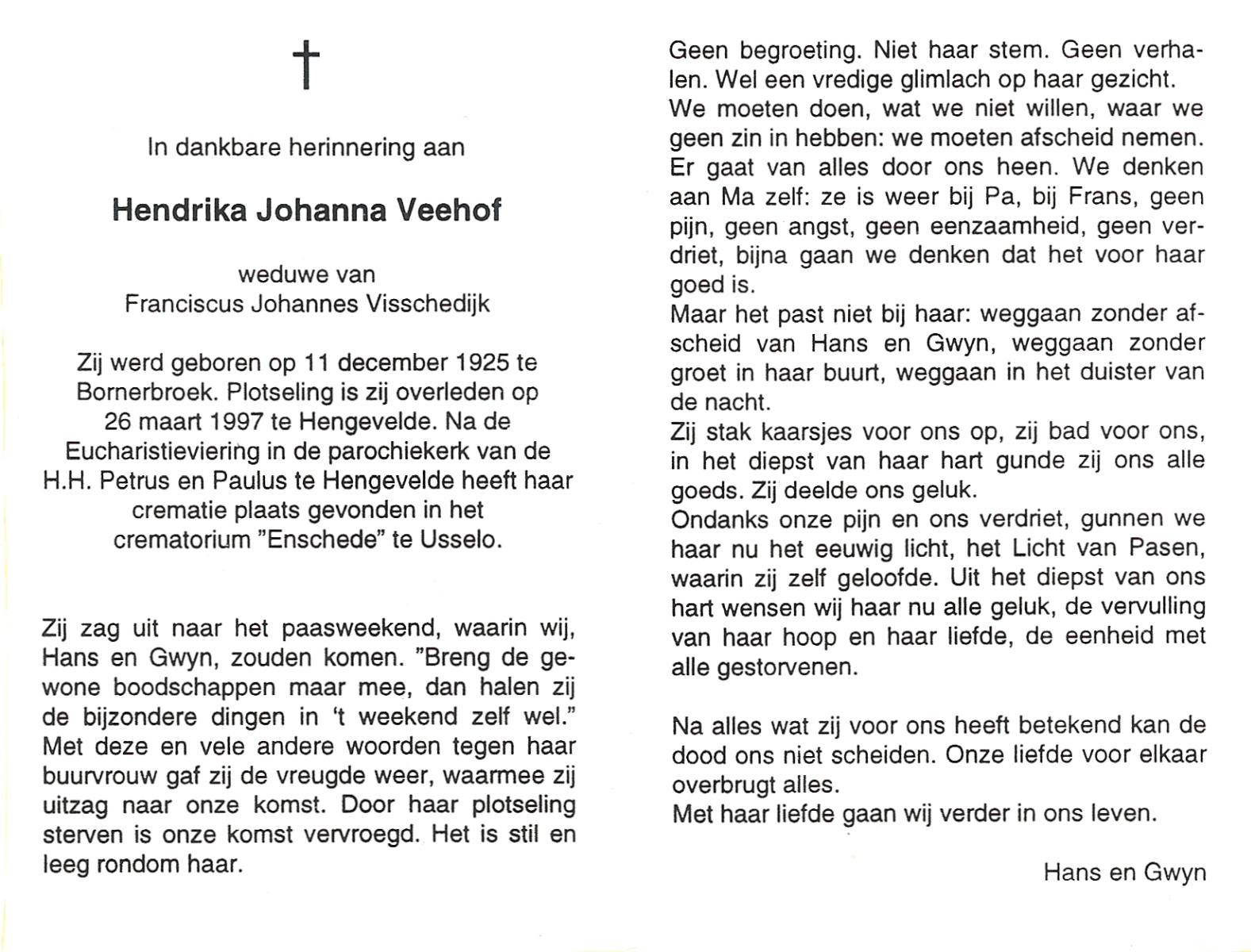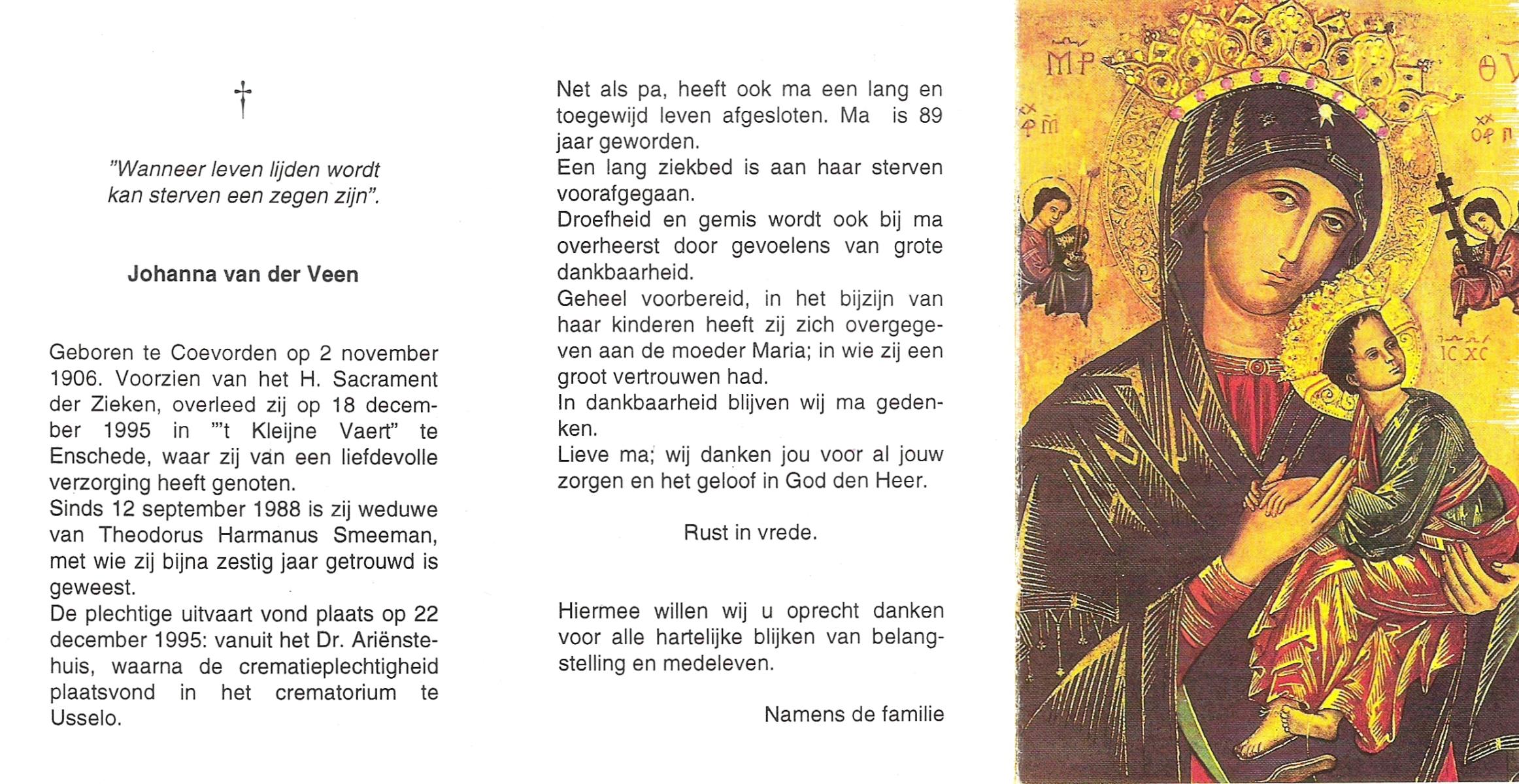 VEEN, van der, Johanna, geboren op 2-11-1906 te Coevorden, overleden op 18-12-1995 te Enschede op 81-jarige leeftijd, gecremeerd op 22-12-1995 te Usselo.