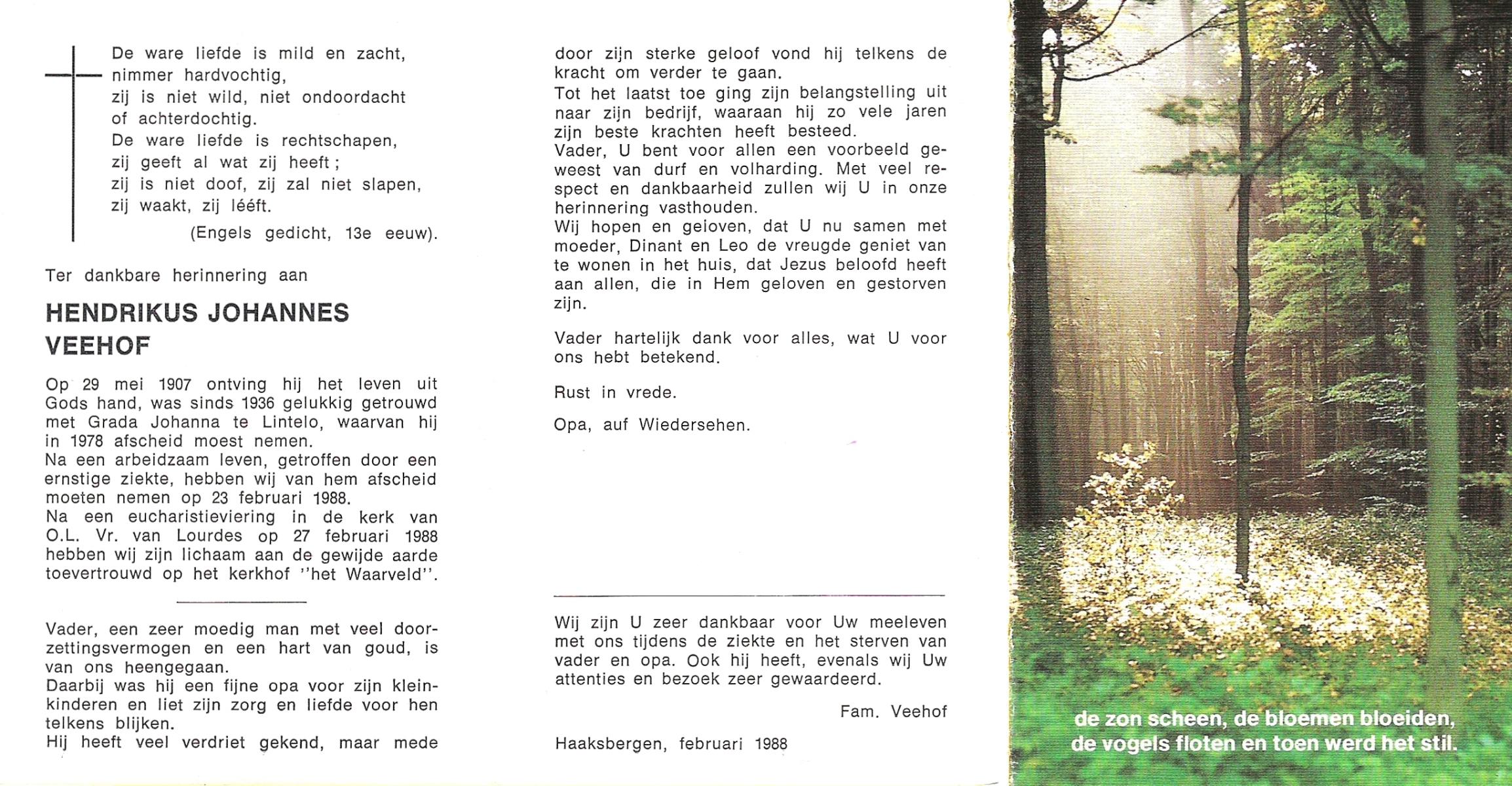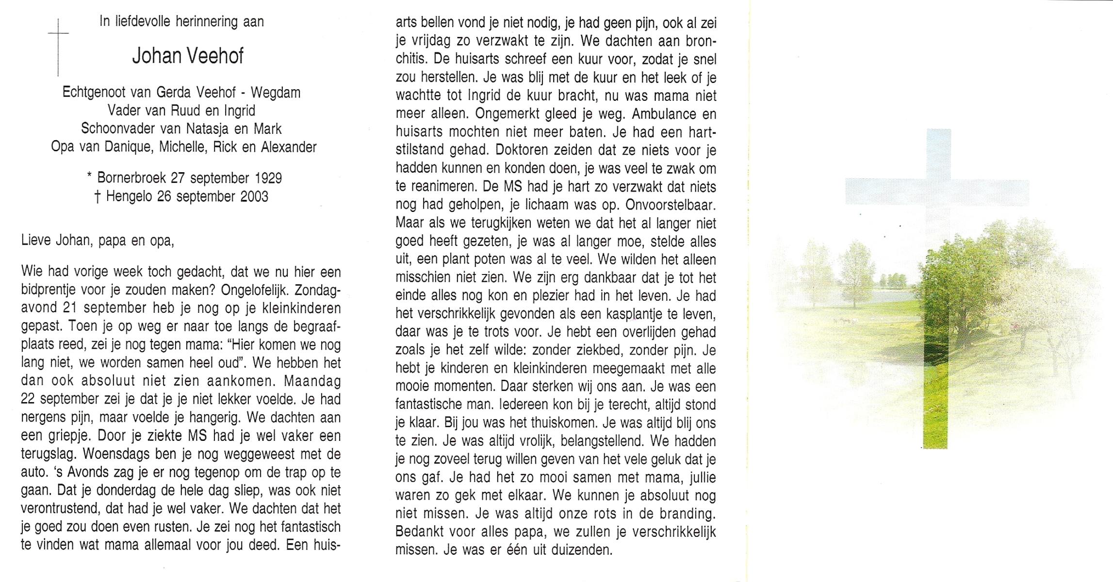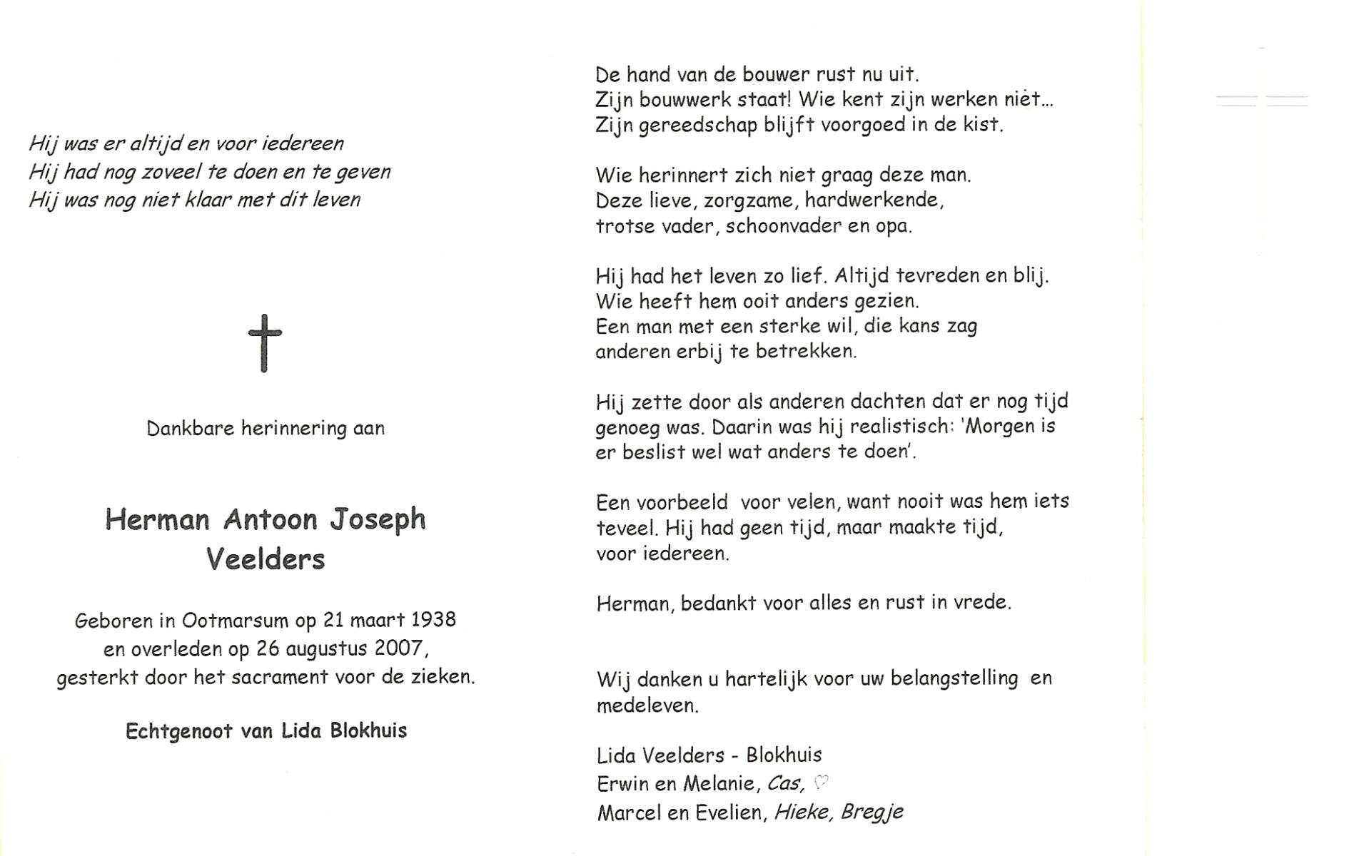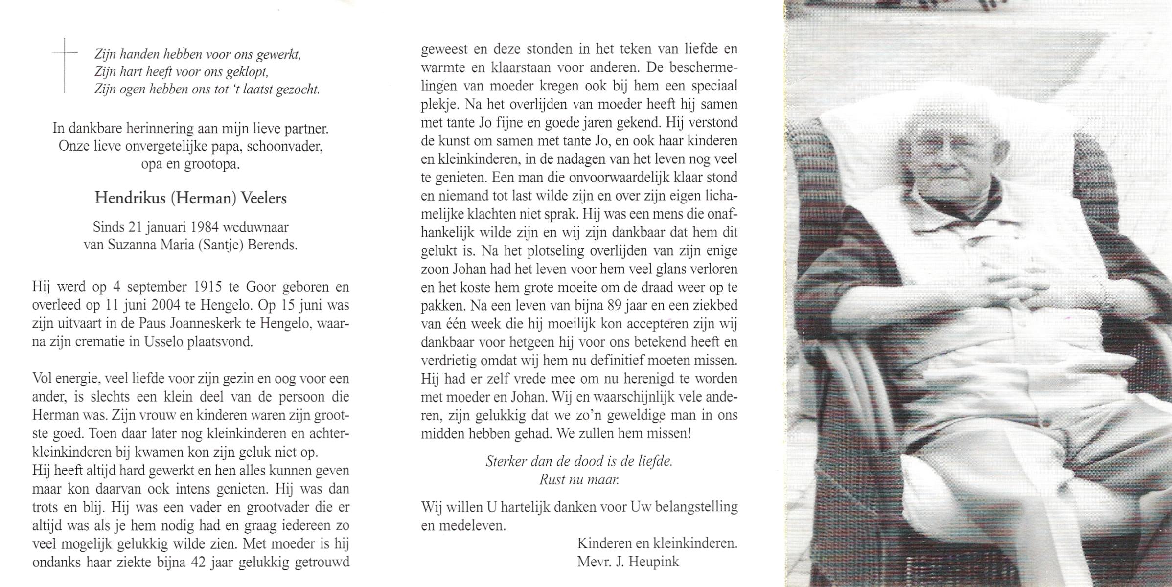 VEELERS, Hendrikus (Herman), geboren op 4-9-1915 te Goor, overleden op 11-6-2004 te Hengelo (Ov.) op 88-jarige leeftijd, gecremeerd op 15-6-2004 te Usselo.