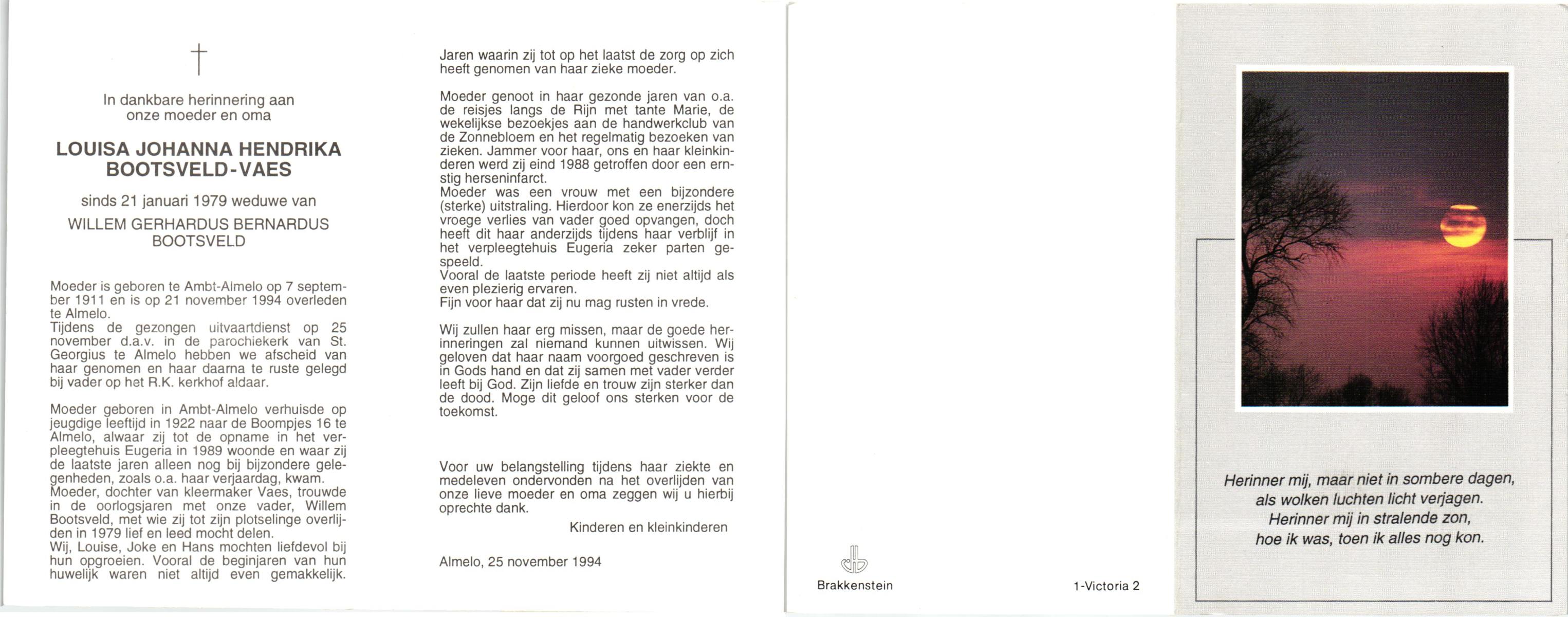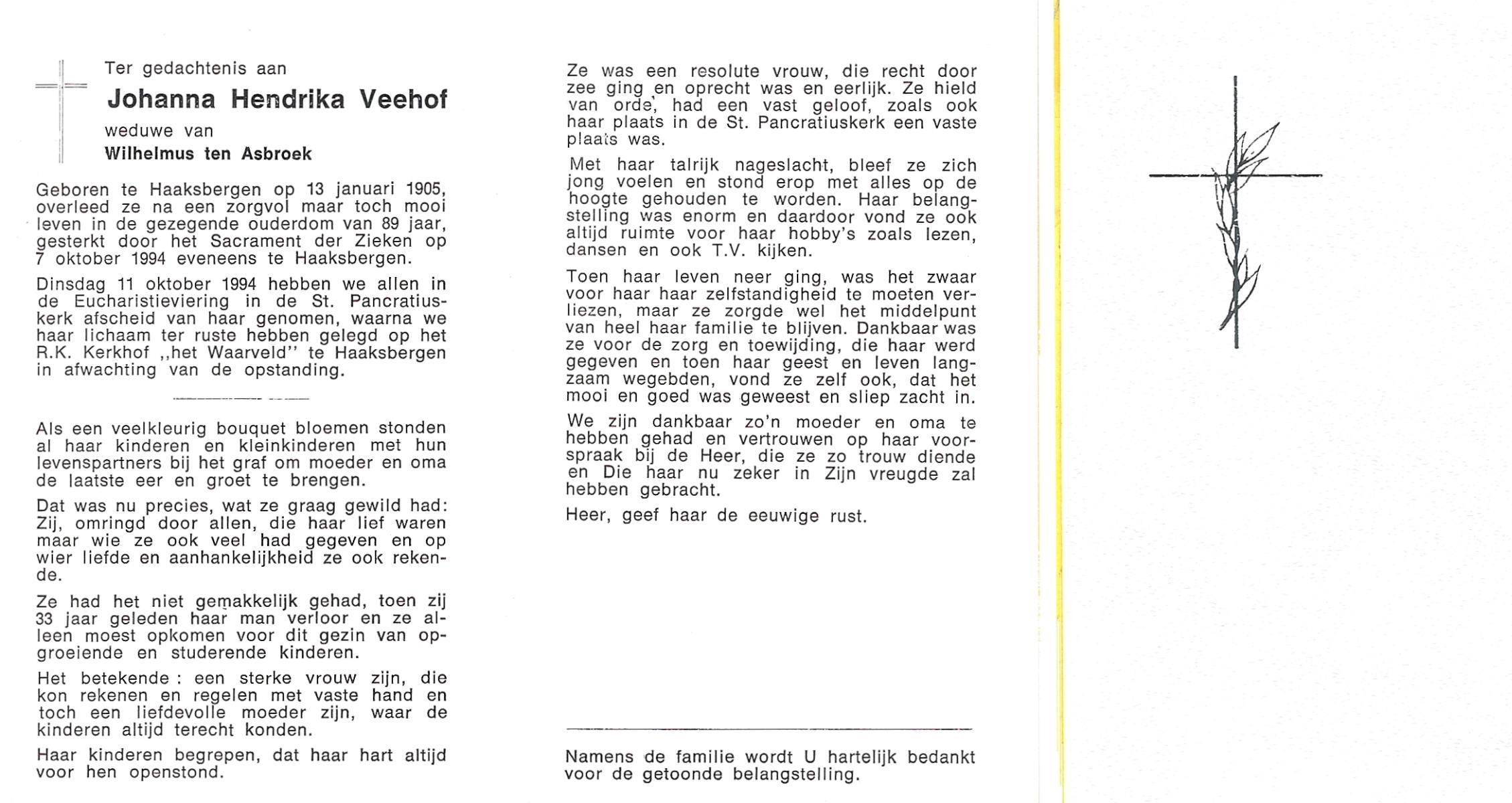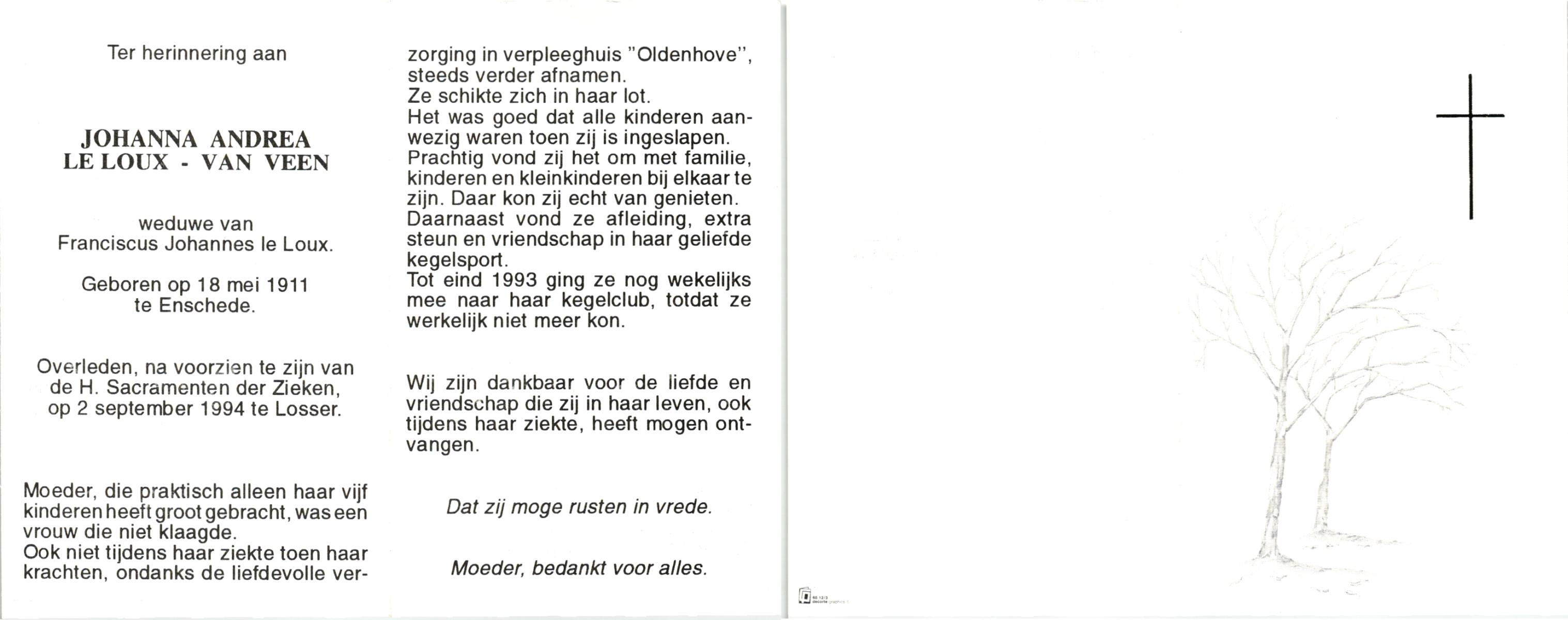 VEEN, van, Johanna Andrea, geboren op 18-5-1911 te Enschede, overleden op 2-9-1994 te Losser op 83-jarige leeftijd.