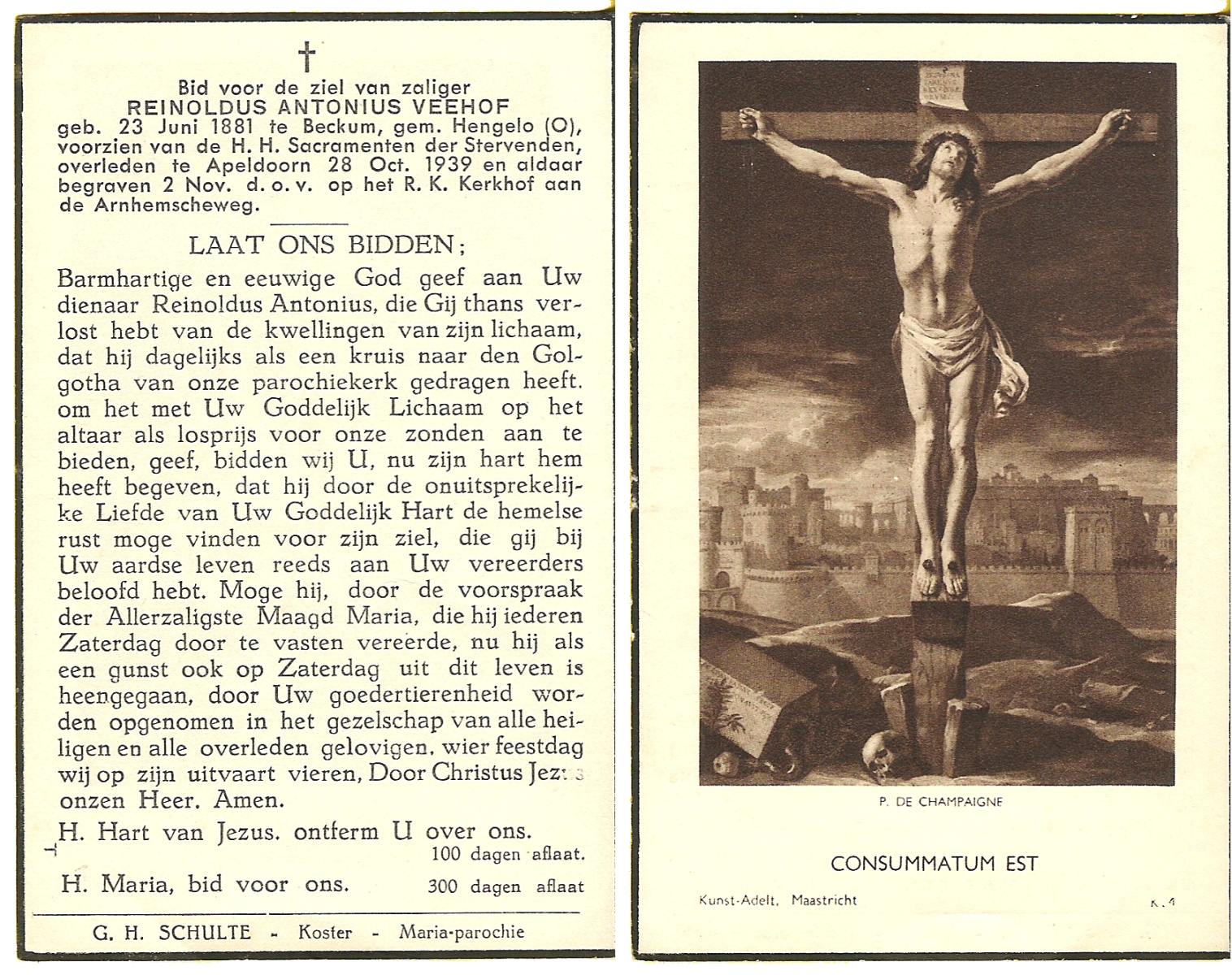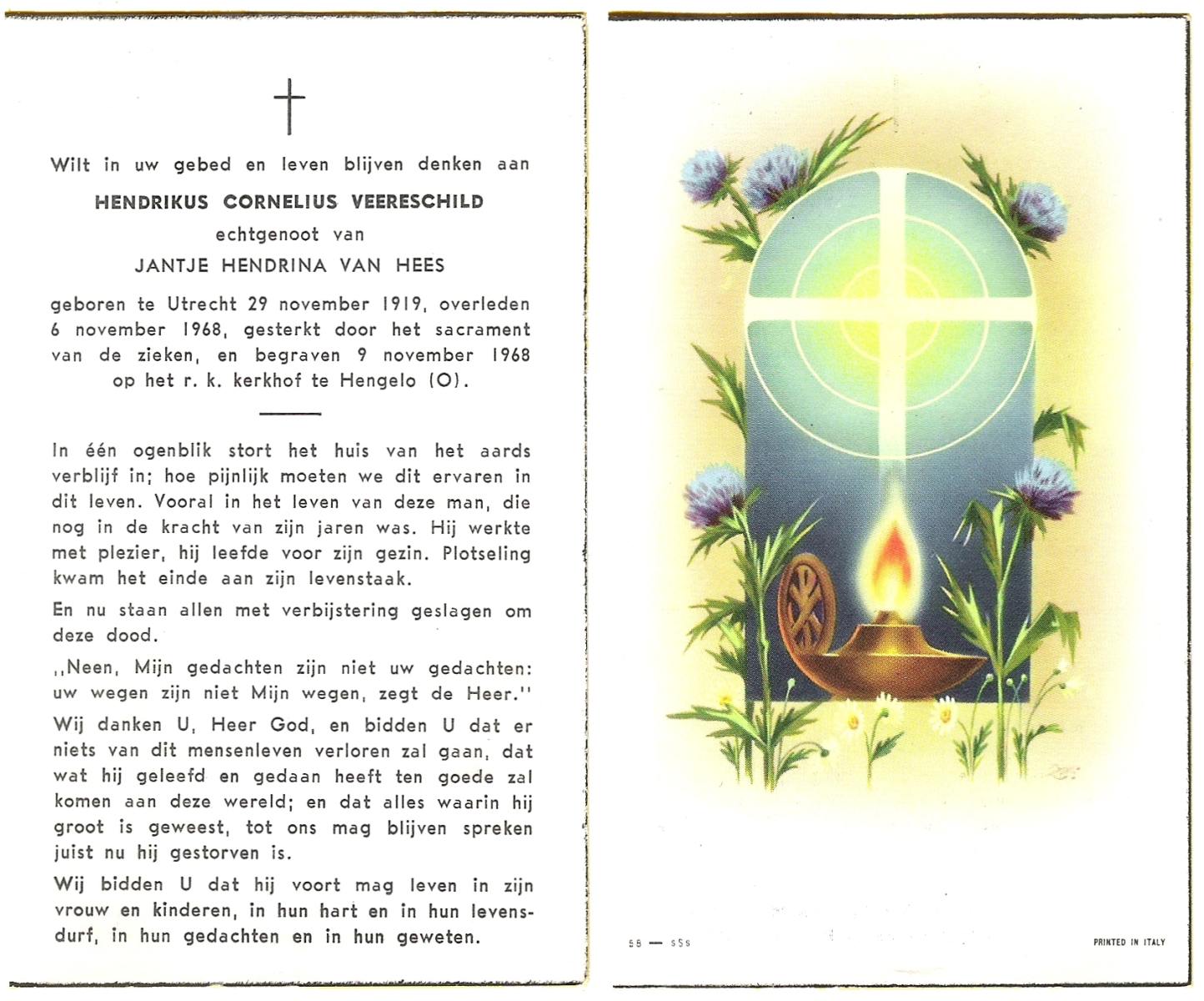 VEERESCHILD, Hendrikus Cornelius, geboren op 29-11-1919 te Utrecht, overleden op 6-11-1968 te Hengelo (Ov.) op 48-jarige leeftijd, begraven op 9-11-1968 te Hengelo (Ov.).