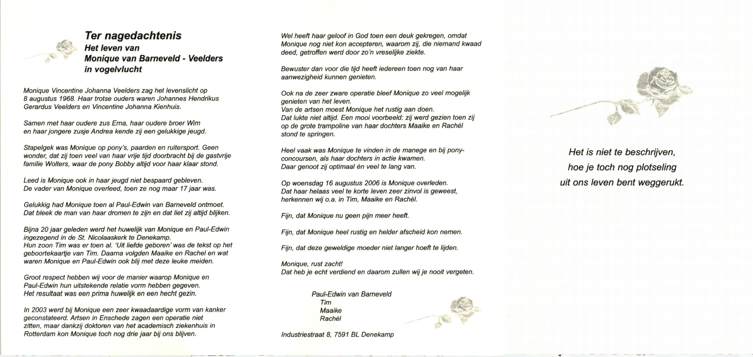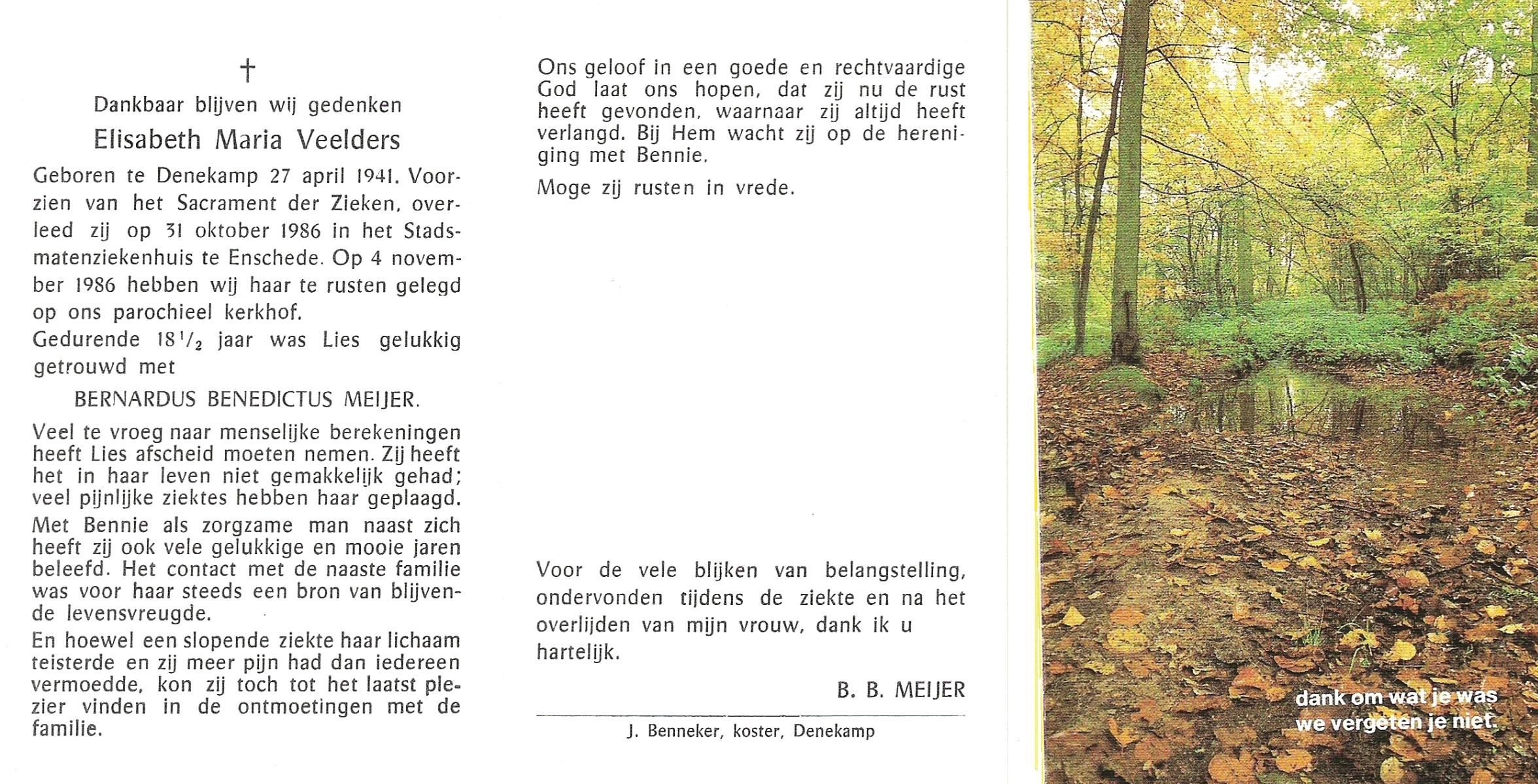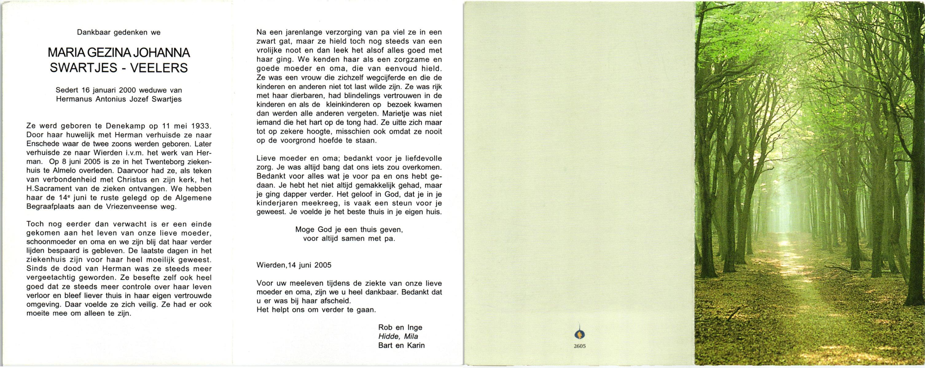 VEELERS, Maria gezina Johanna, geboren op 11-5-1933 te Denekamp, overleden op 8-6-2005 te Almelo, ziekenhuis op 72-jarige leeftijd, begraven op 14-6-2005 te Wierden.