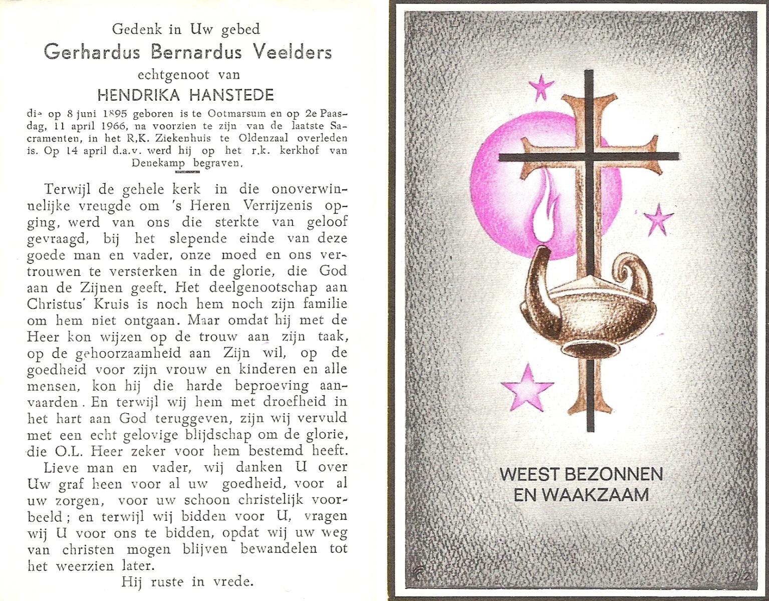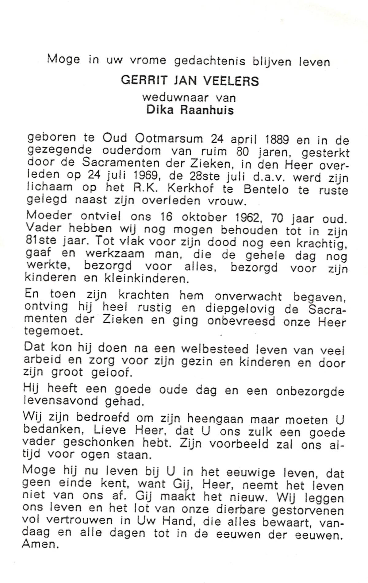 VEELERS, Gerrit Jan, geboren op 24-04-1889 te Oud Ootmarsum, overleden op 24-7-1969 op 80-jarige leeftijd, begraven op 28-7-1969 te Bentelo.