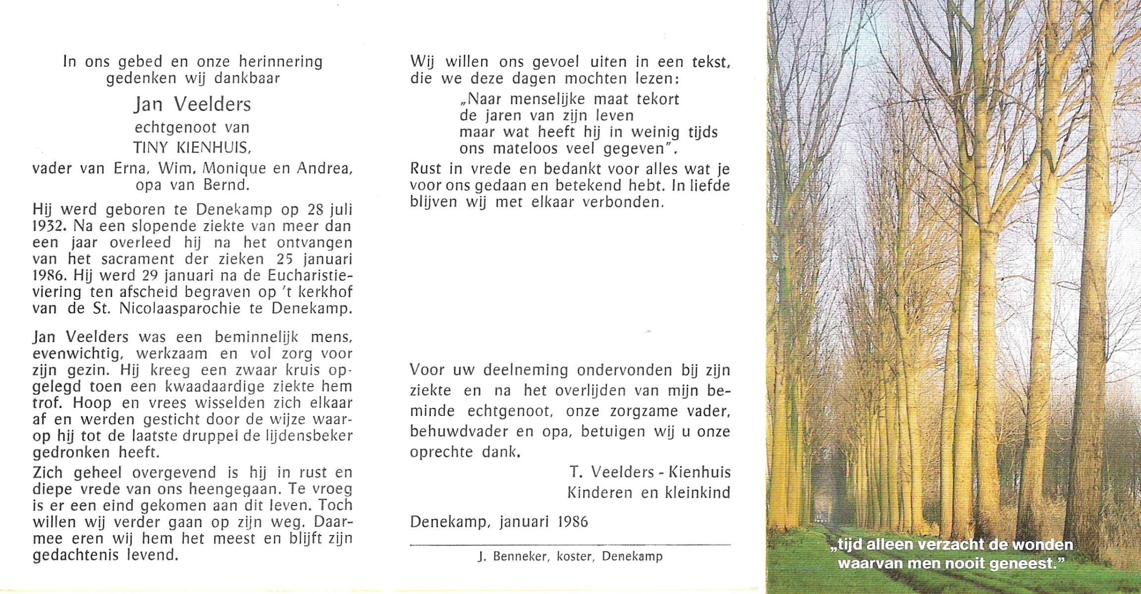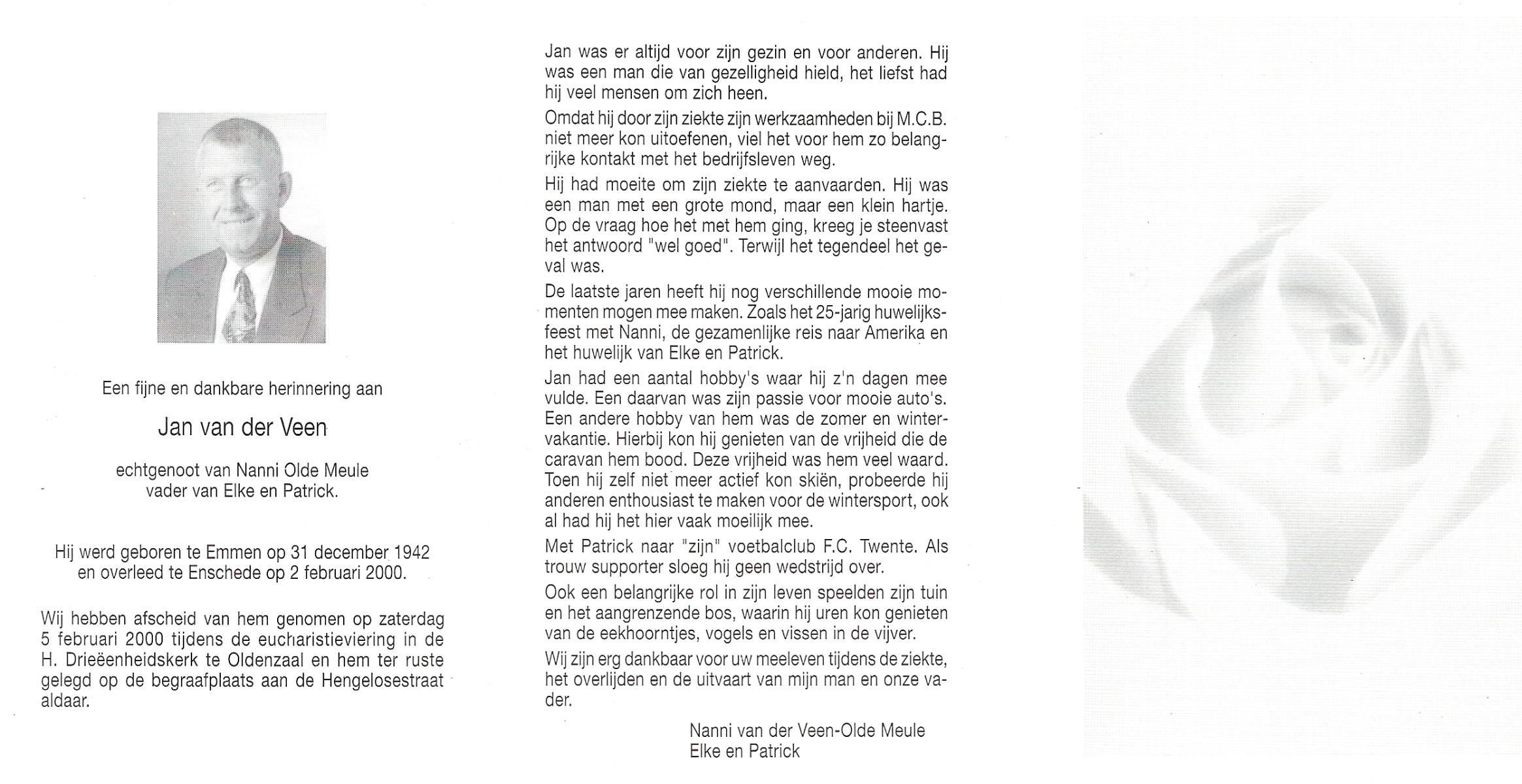 VEEN, van der, Jan, geboren op 31-12-1942 te Emmen, overleden op 2-2-2000 te Enschede op 57-jarige leeftijd, begraven op 5-2-2000 te Oldenzaal.