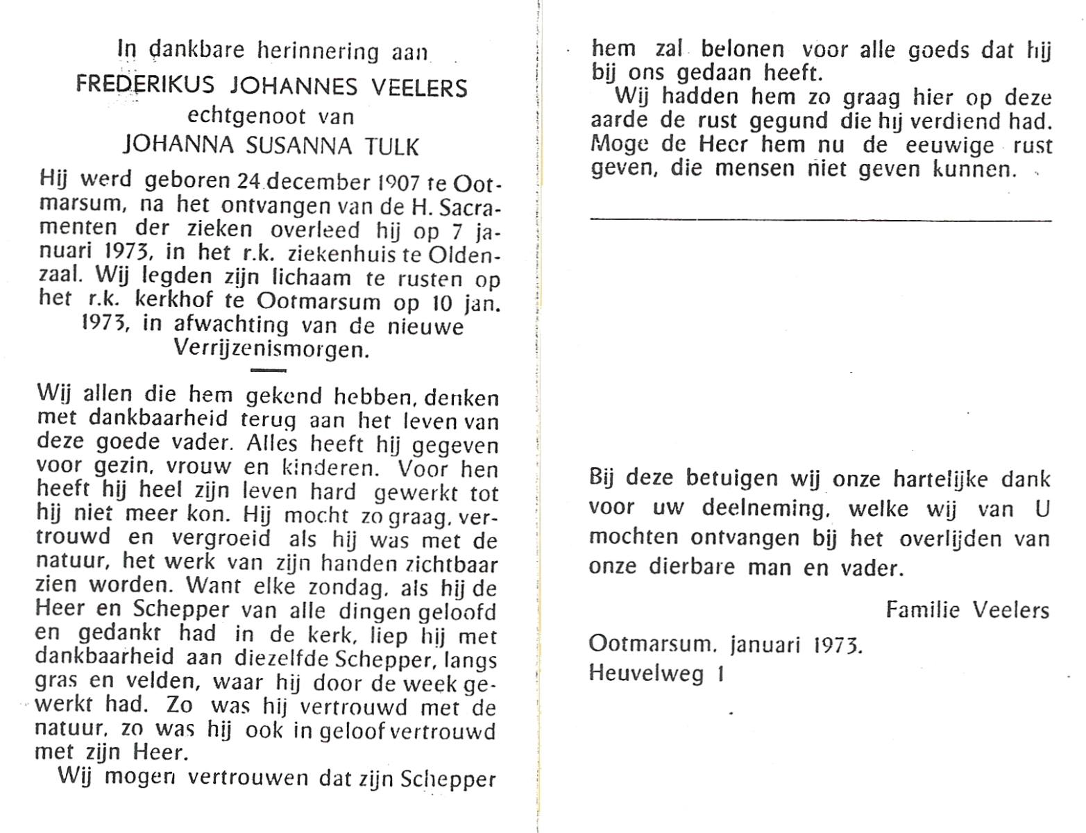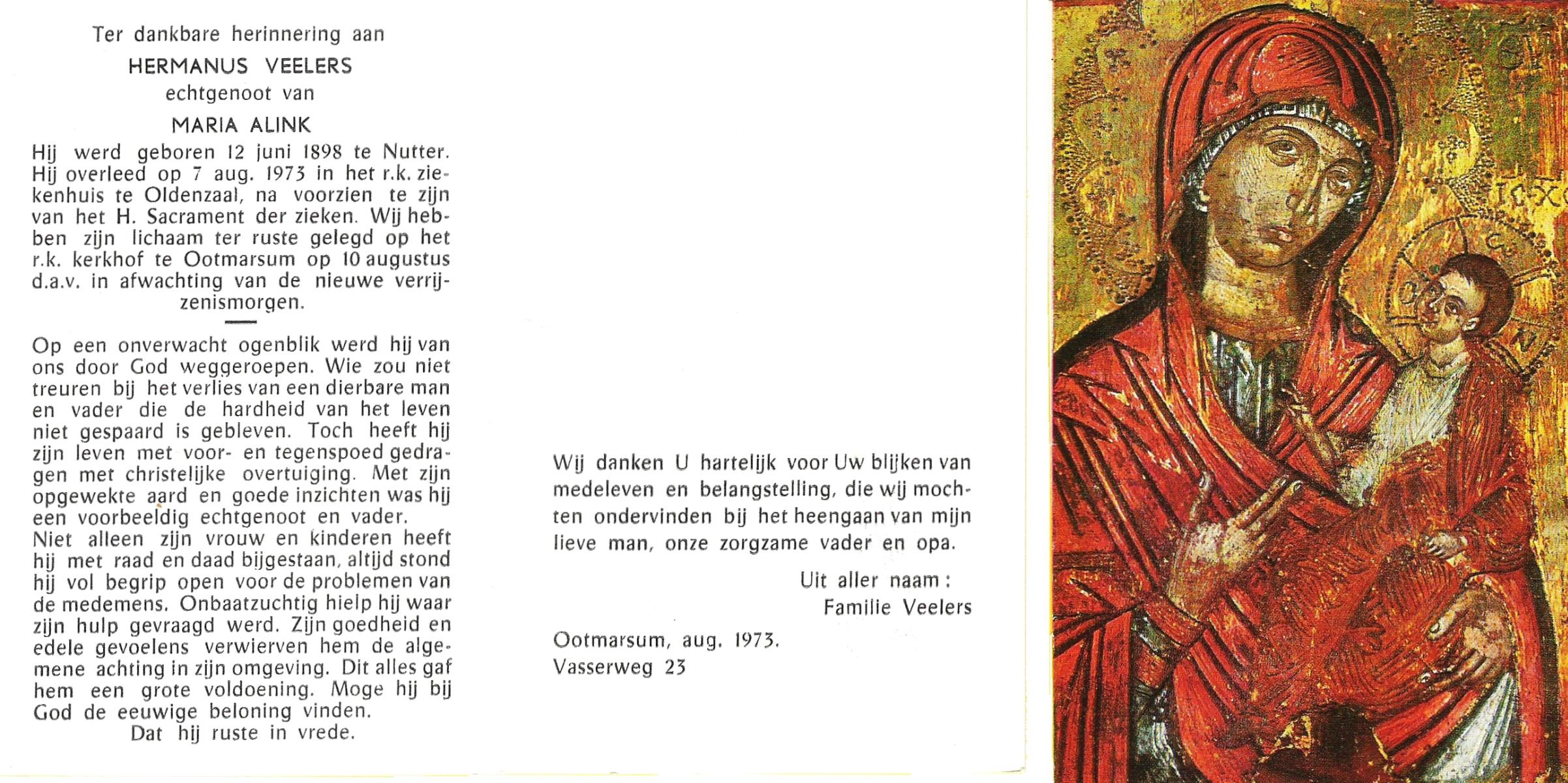VEELERS, Hermanus, geboren op 12-06-1898 te Nutter, overleden op 7-8-1973 te Oldenzaal op 75-jarige leeftijd, begraven op 10-8-1973 te Ootmarsum.