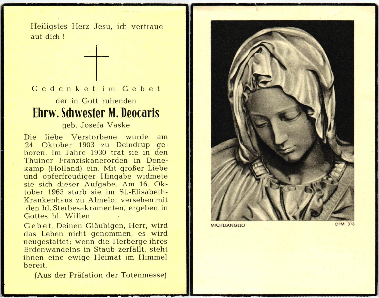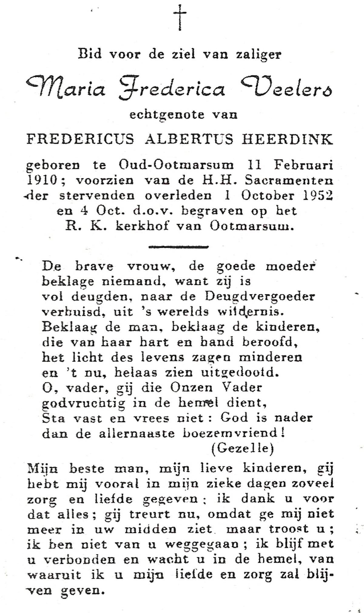 VEELERS, Maria Frederica, geboren op 11-2-1910 te Oud Ootmarsum, overleden op 1-10-1952 op 42-jarige leeftijd, begraven op 4-10-1952 te Ootmarsum.