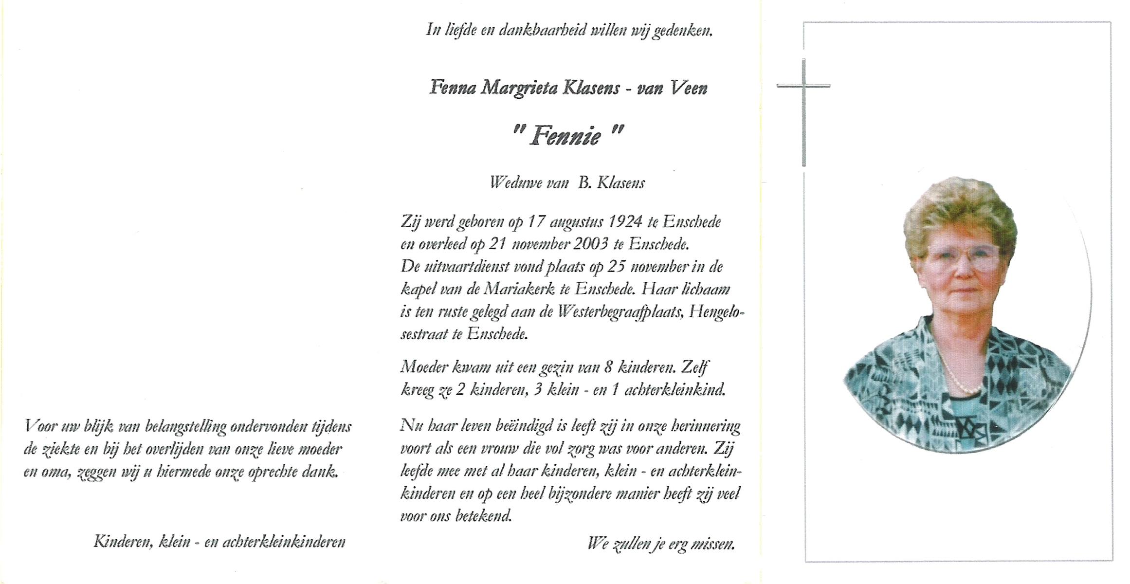 VEEN, van, Fennie (Fenna Margrieta), geboren op 17-8-1924 te Enschede, overleden op 21-11-2003 te Enschede op 75-jarige leeftijd, begraven op 25-11-2003 te Enschede.