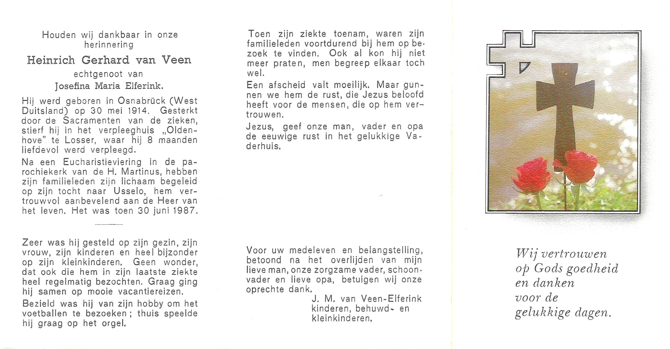 VEEN, van, Heinrich Gerhard, geboren op 30-5-1914 te Osnabrück (Dld.), overleden te Losser op 73-jarige leeftijd, gecremeerd op 30-6-1987 te Usselo.