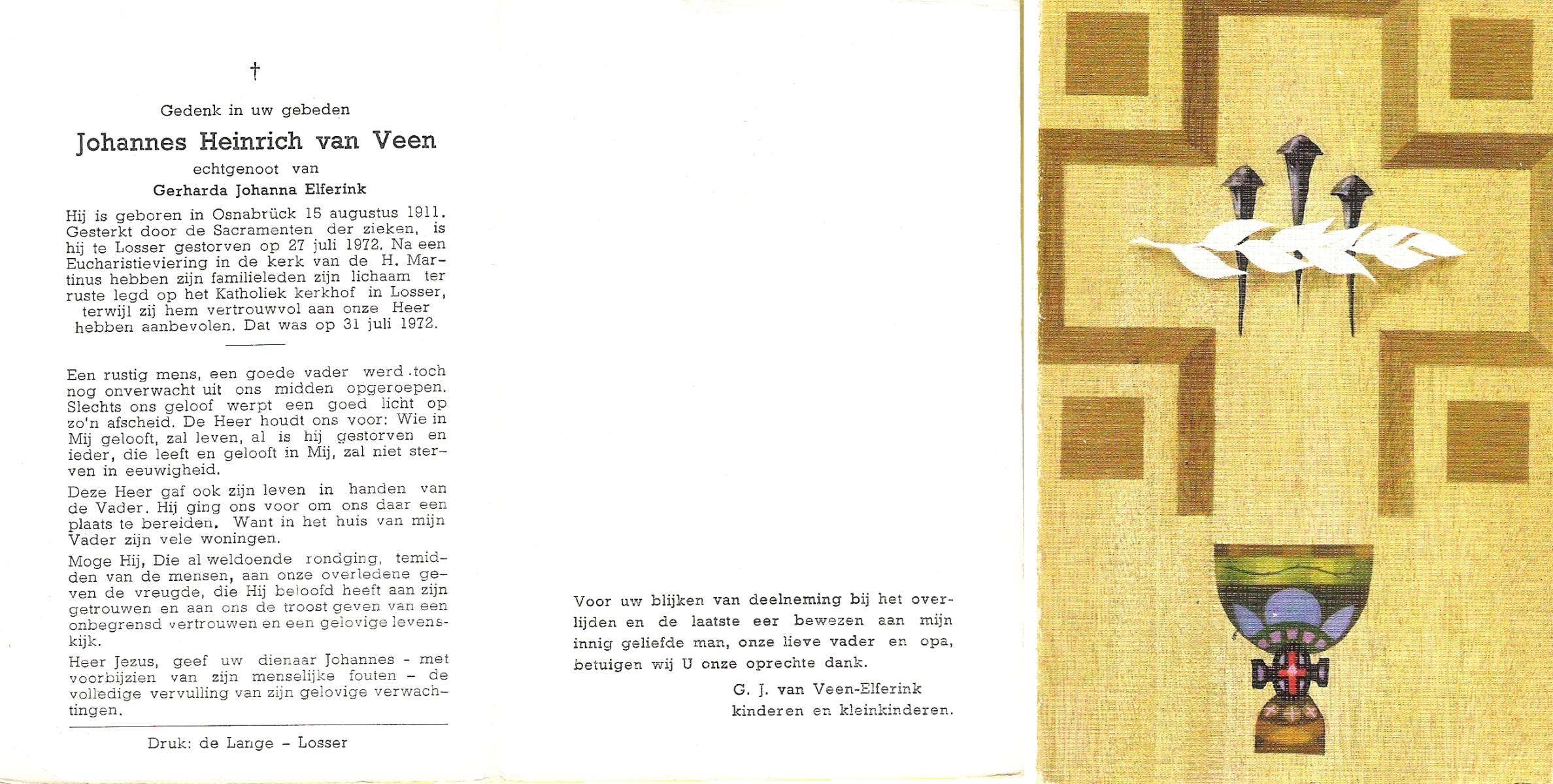VEEN, van, Johannes Heinrich, geboren op 15-8-1911 te Osnabrück (Dld.), overleden op 27-7-1972 te Losser op 60-jarige leeftijd, begraven op 31-7-1972 te Losser.