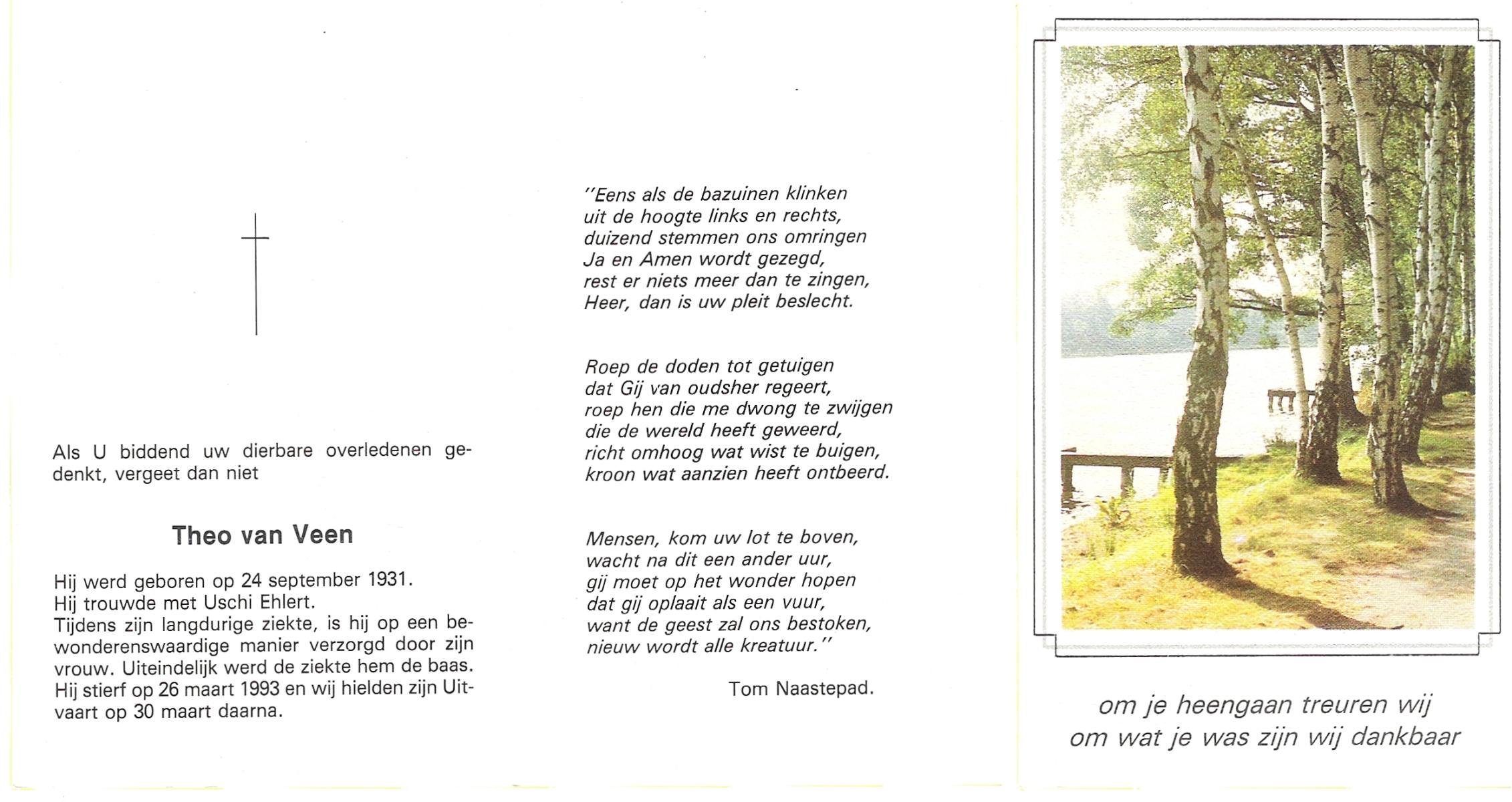VEEN, van, Theo, geboren op 24-9-1931, overleden op 26-3-1993 op 61-jarige leeftijd, begraven op 30-3-1993.