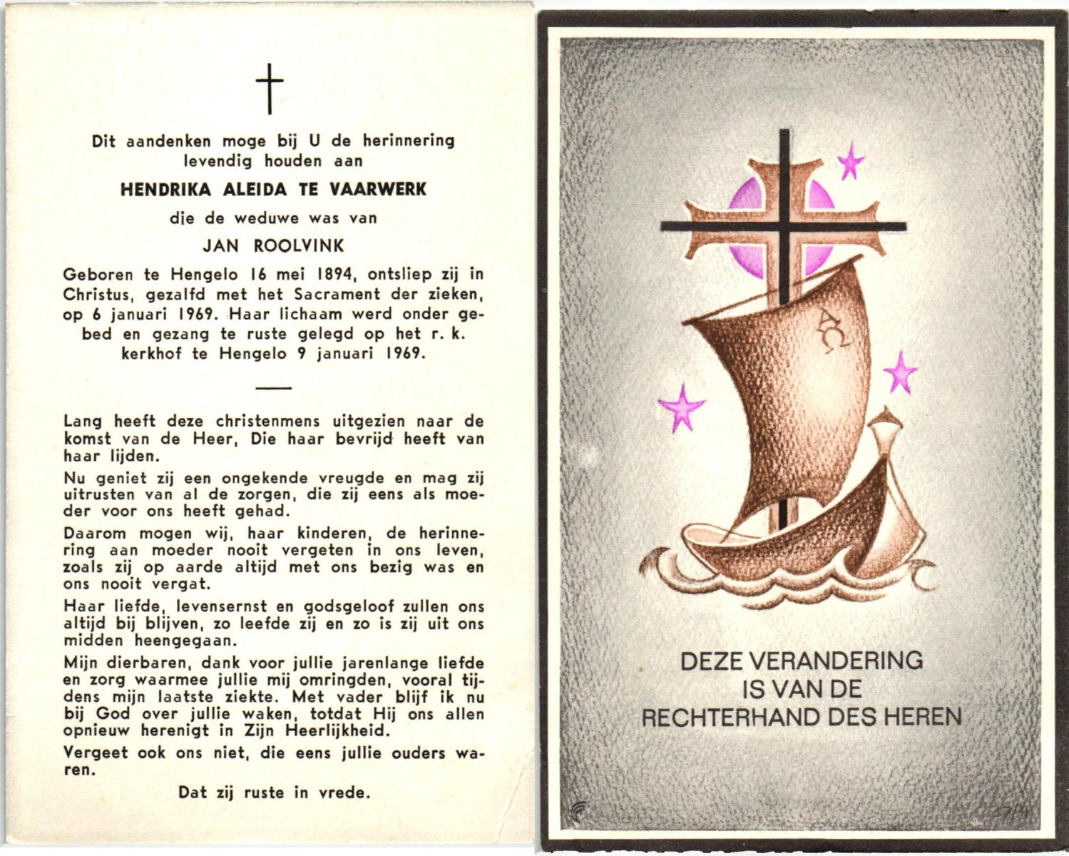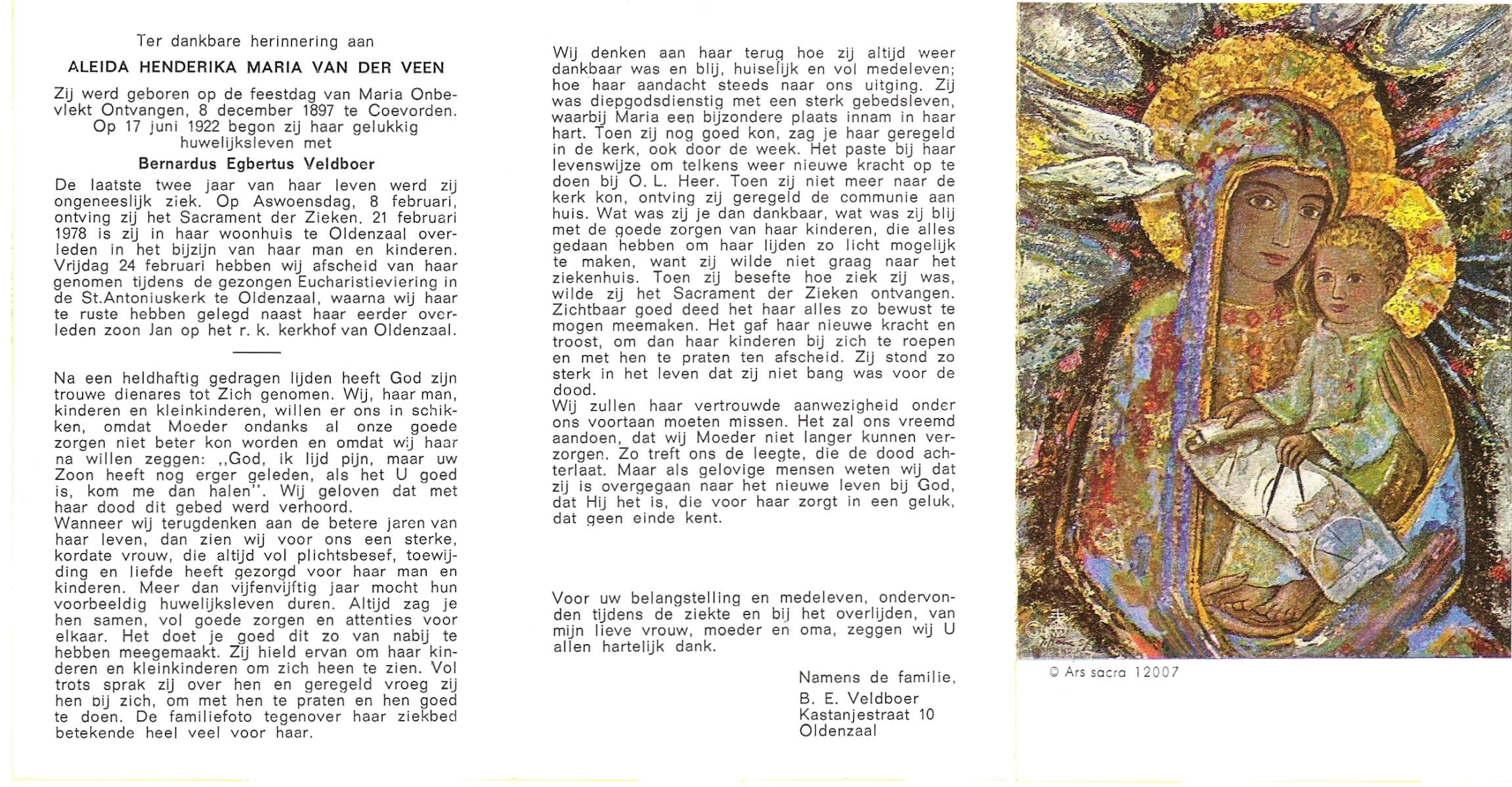 VEEN, van der, Aleida Henderika Maria, geboren op 08-12-1897 te Coevorden, overleden op 21-2-1978 te Oldenzaal op 80-jarige leeftijd, begraven op 24-2-1978 te Oldenzaal.