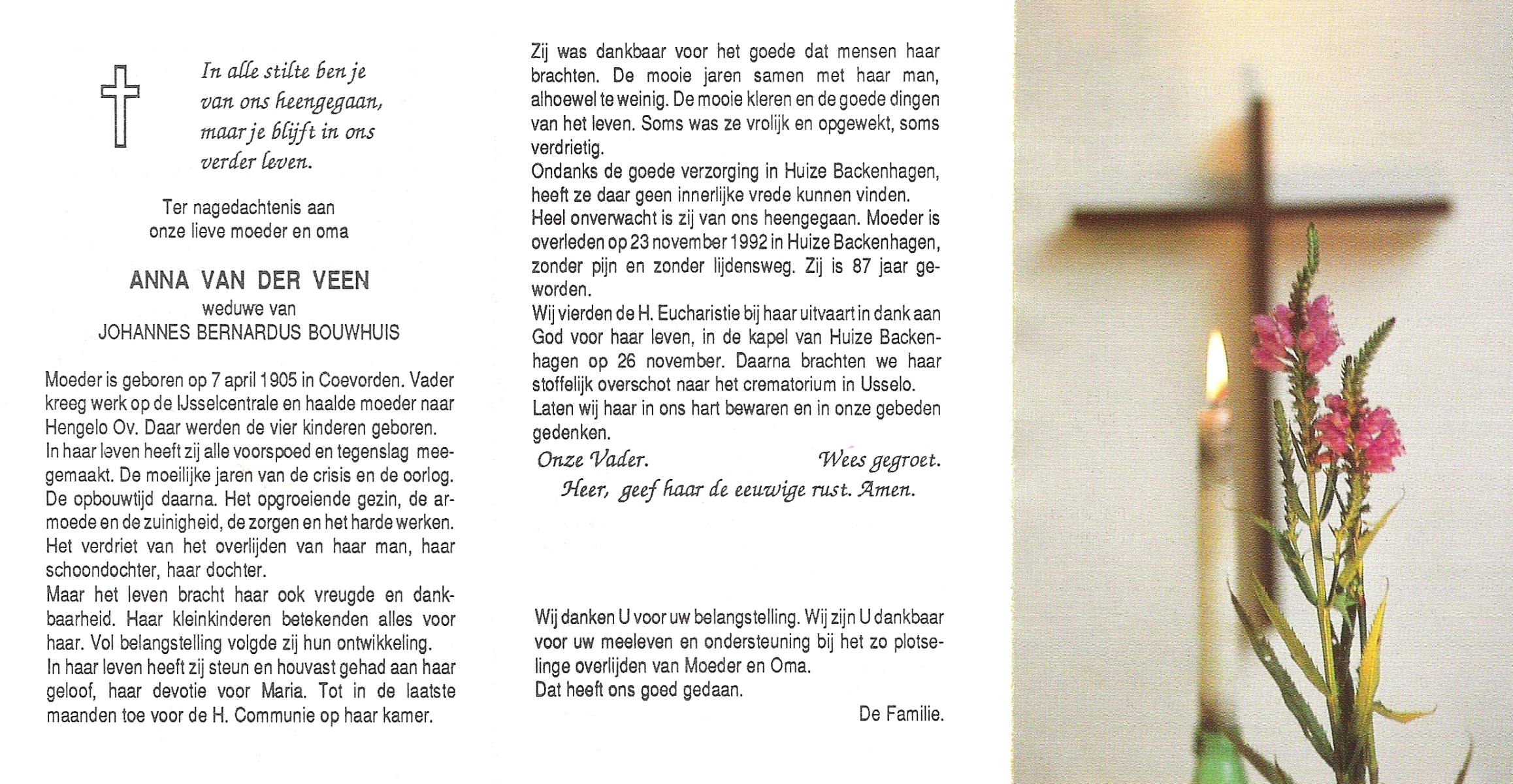VEEN, van der, Anna, geboren op 7-4-1905 te Coevorden, overleden op 23-11-1992 te Hengelo (Ov.) op 87-jarige leeftijd, gecremeerd op 26-11-1992 te Usselo.