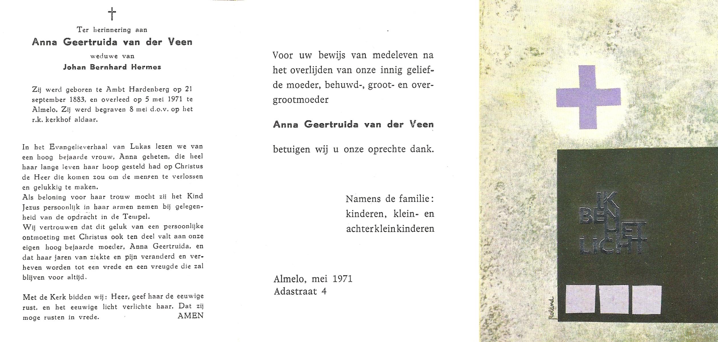 VEEN, van der, Anna Geertruida, geboren op 21-09-1883 te Hardenberg, Ambt, overleden op 5-5-1971 te Almelo op 87-jarige leeftijd, begraven op 8-5-1971 te Almelo.