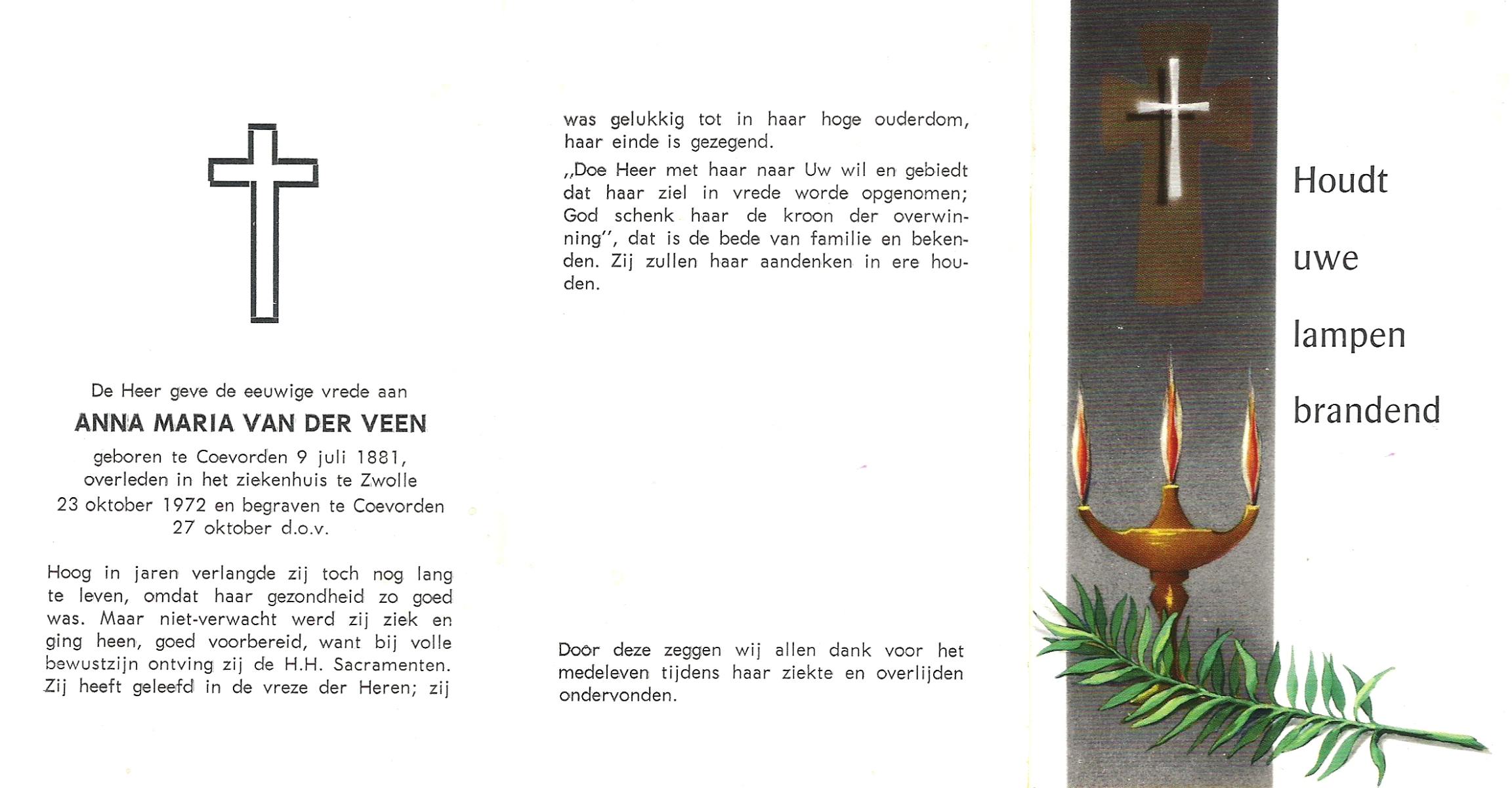 VEEN, van der, Anna Maria, geboren op 09-07-1881 te Coevorden, overleden op 23-10-1972 te Zwolle op 91-jarige leeftijd, begraven op 27-10-1972 te Coevorden.