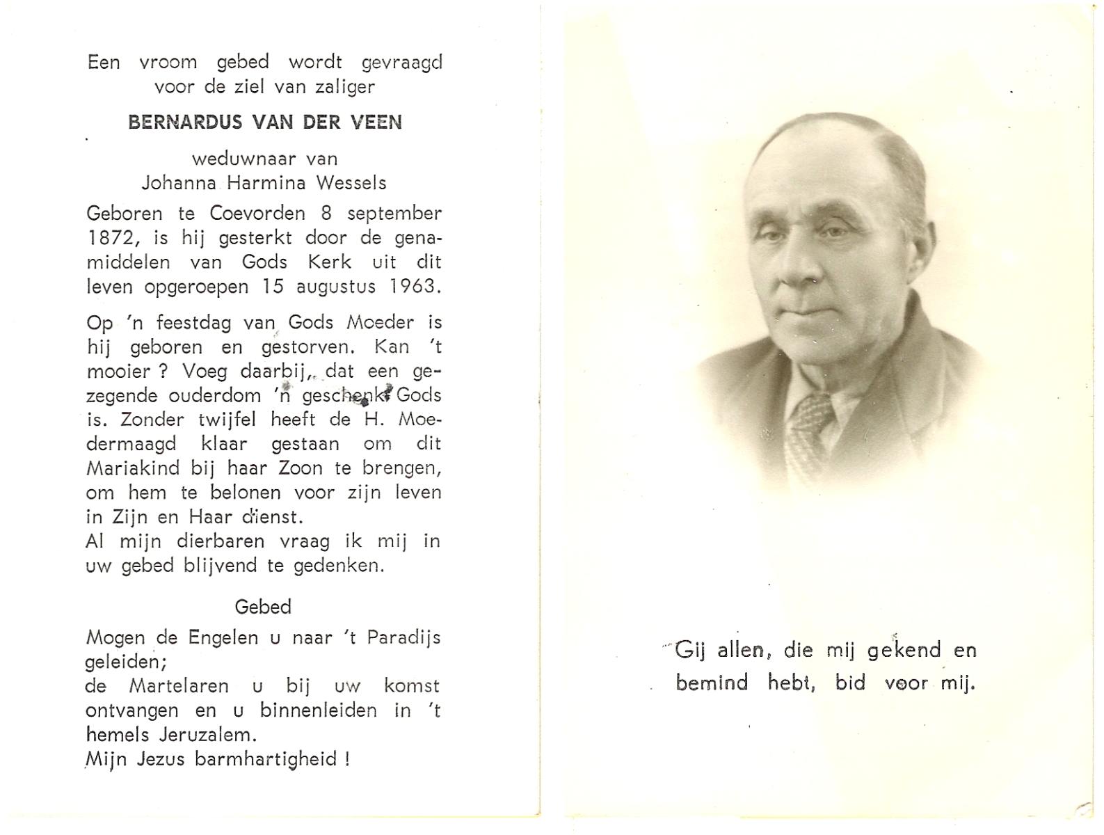 VEEN, van der, Bernardus, geboren op 08-09-1872 te Coevorden, overleden op 15-8-1963 op 90-jarige leeftijd.