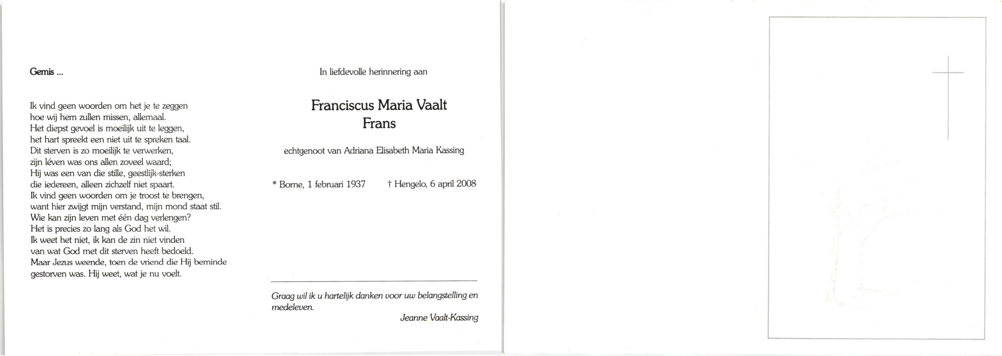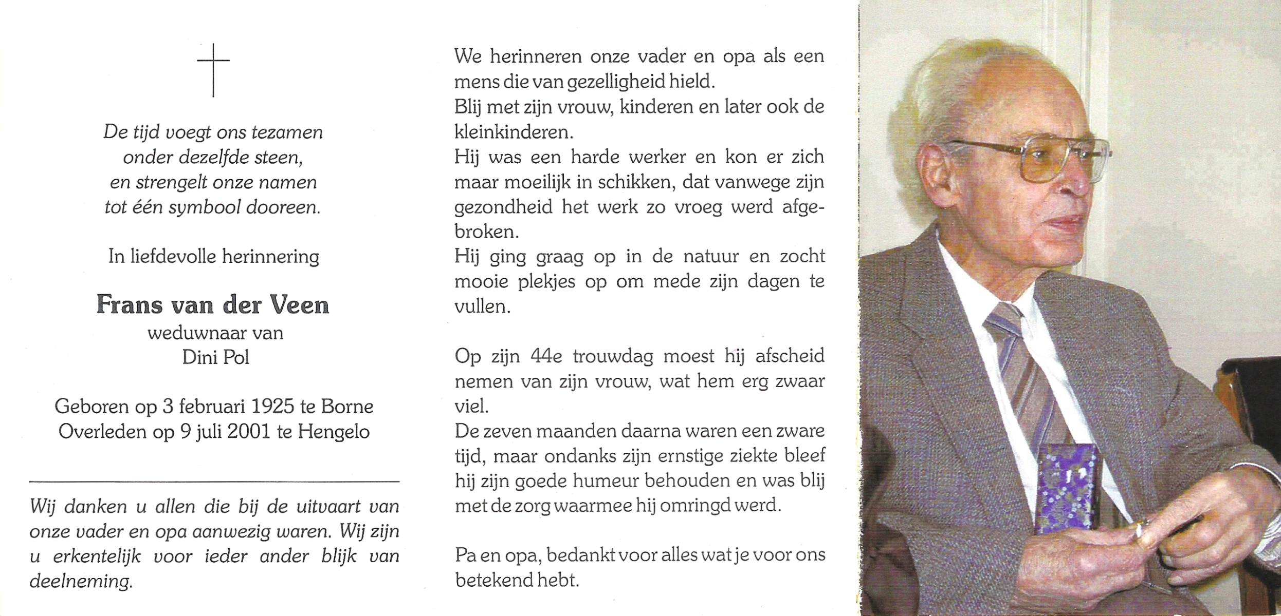 VEEN, van der, Frans, geboren op 3-2-1925 te Borne, overleden op 9-7-2001 te Hengelo (Ov.) op 76-jarige leeftijd.
