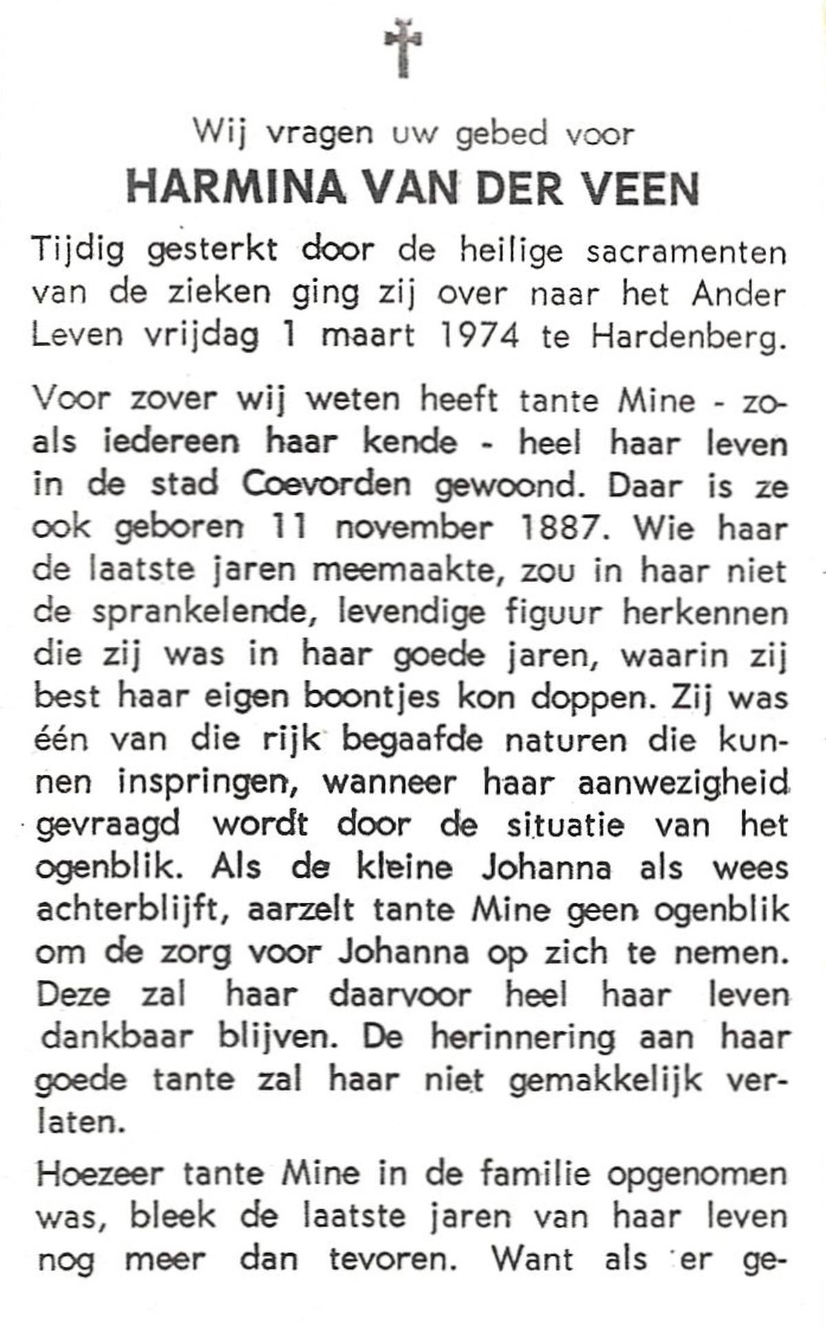 VEEN, van der, Harmina, geboren op 11-11-1887 te Coevorden, overleden op 1-3-1974 te Hardenberg op 86-jarige leeftijd.