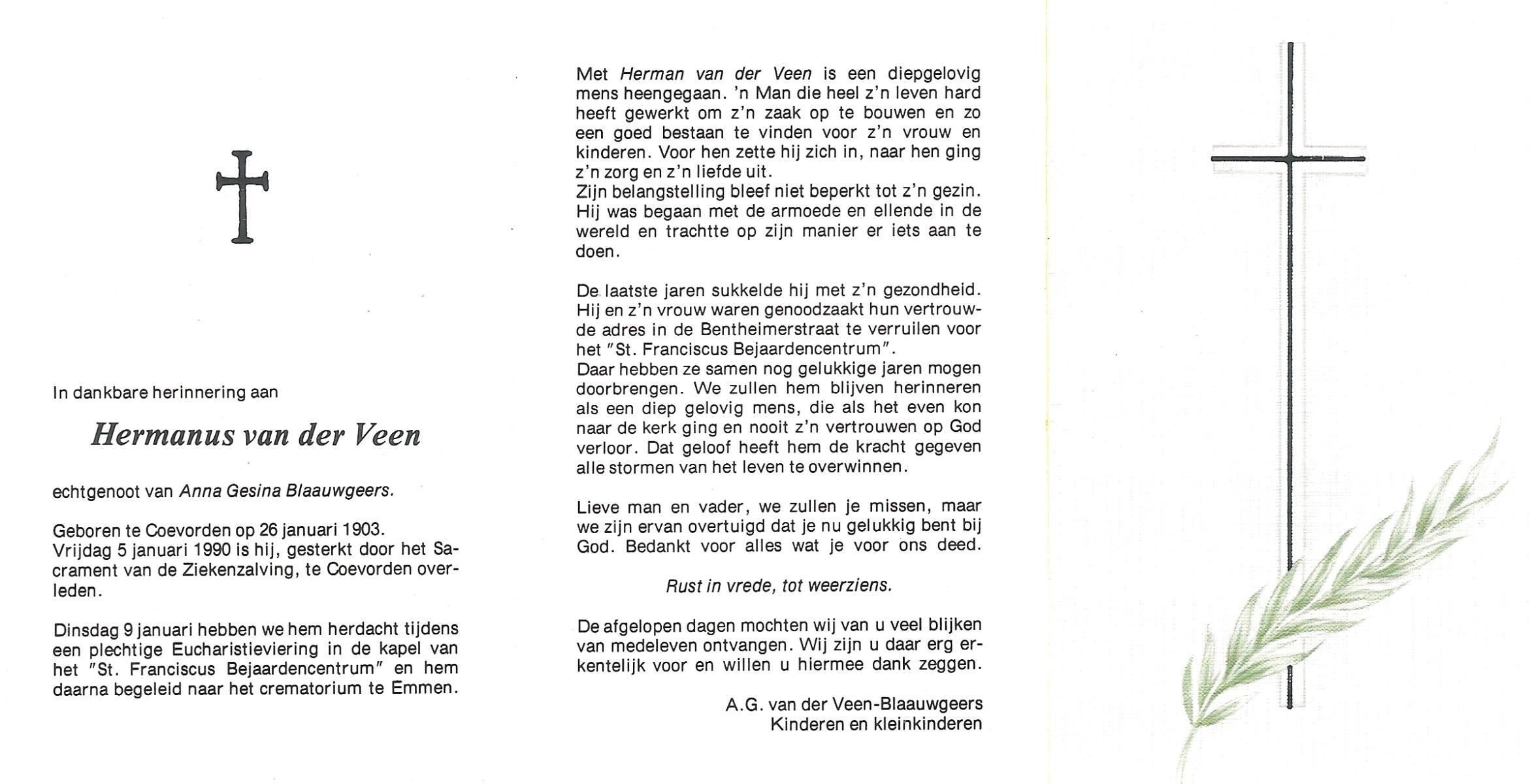 VEEN, van der, Hermanus, geboren op 26-1-1903 te Coevorden, overleden op 5-1-1990 te Coevorden op 86-jarige leeftijd, gecremeerd op 9-1-1990 te Emmen.