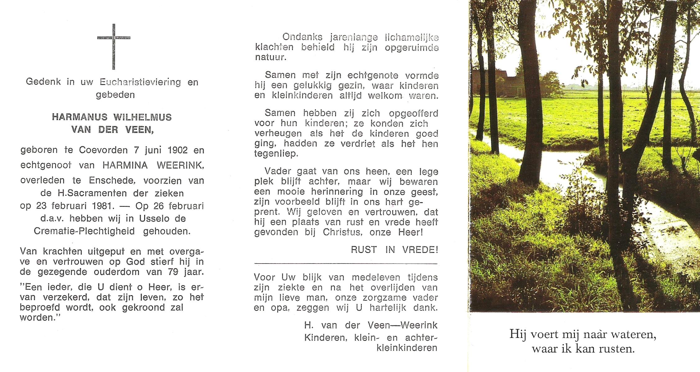 VEEN, van der, Hermanus Wilhelmus, geboren op 7-6-1902 te Coevorden, overleden op 23-2-1981 te Enschede op 79-jarige leeftijd, gecremeerd op 26-2-1981 te Usselo.