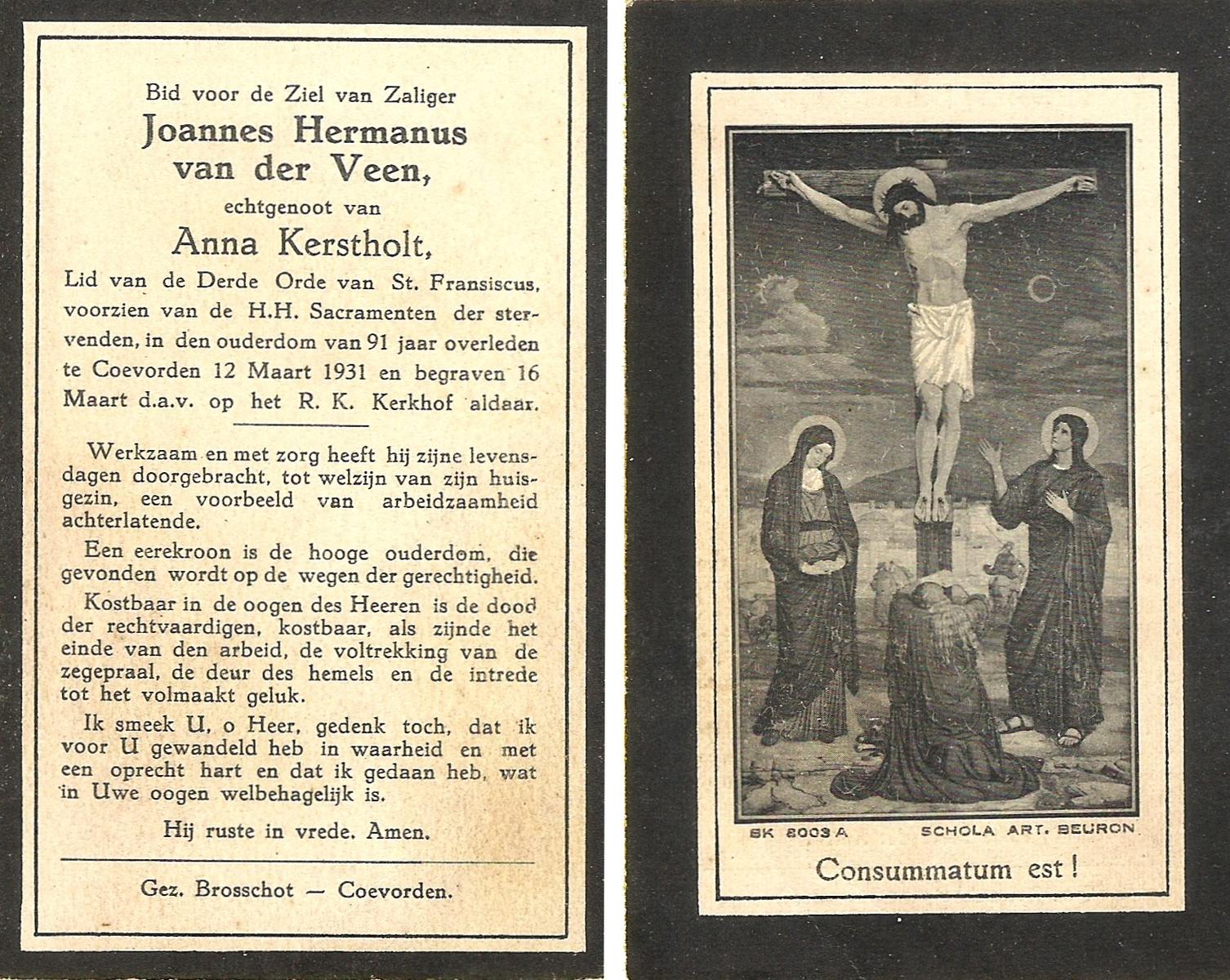 VEEN, van der, Joannes Hermanus, overleden op 12-3-1931 te Coevorden op 91-jarige leeftijd, begraven op 16-3-1931 te Coevorden.