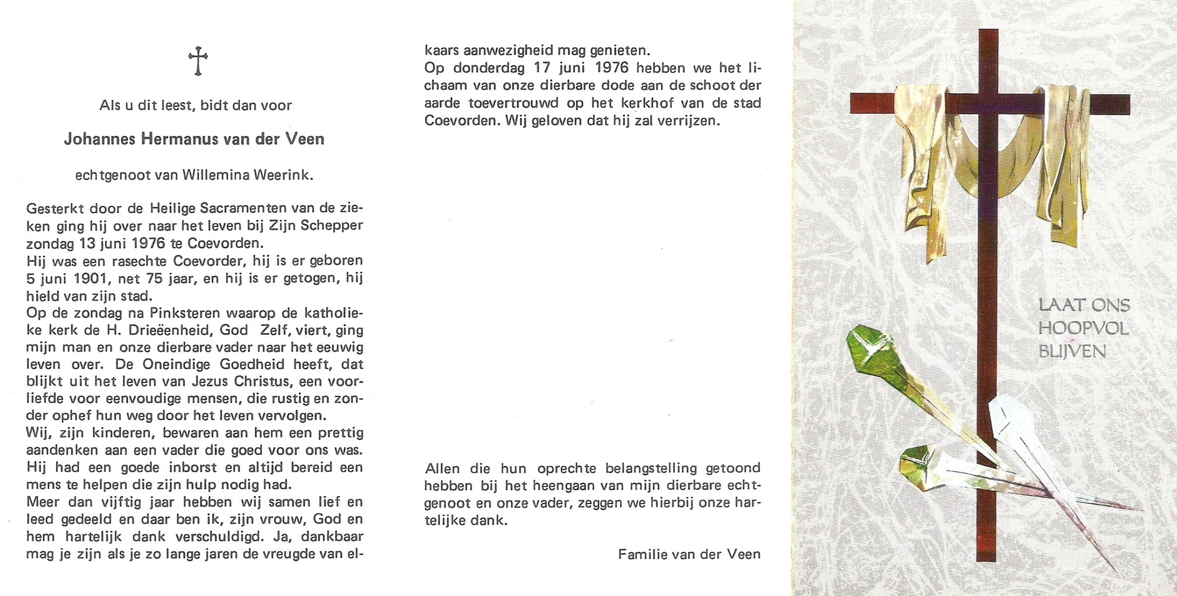 VEEN, van der, Johannes Hermanus, geboren op 5-6-1901 te Coevorden, overleden op 13-6-1976 te Coevorden op 75-jarige leeftijd, begraven op 17-6-1976 te Coevorden.