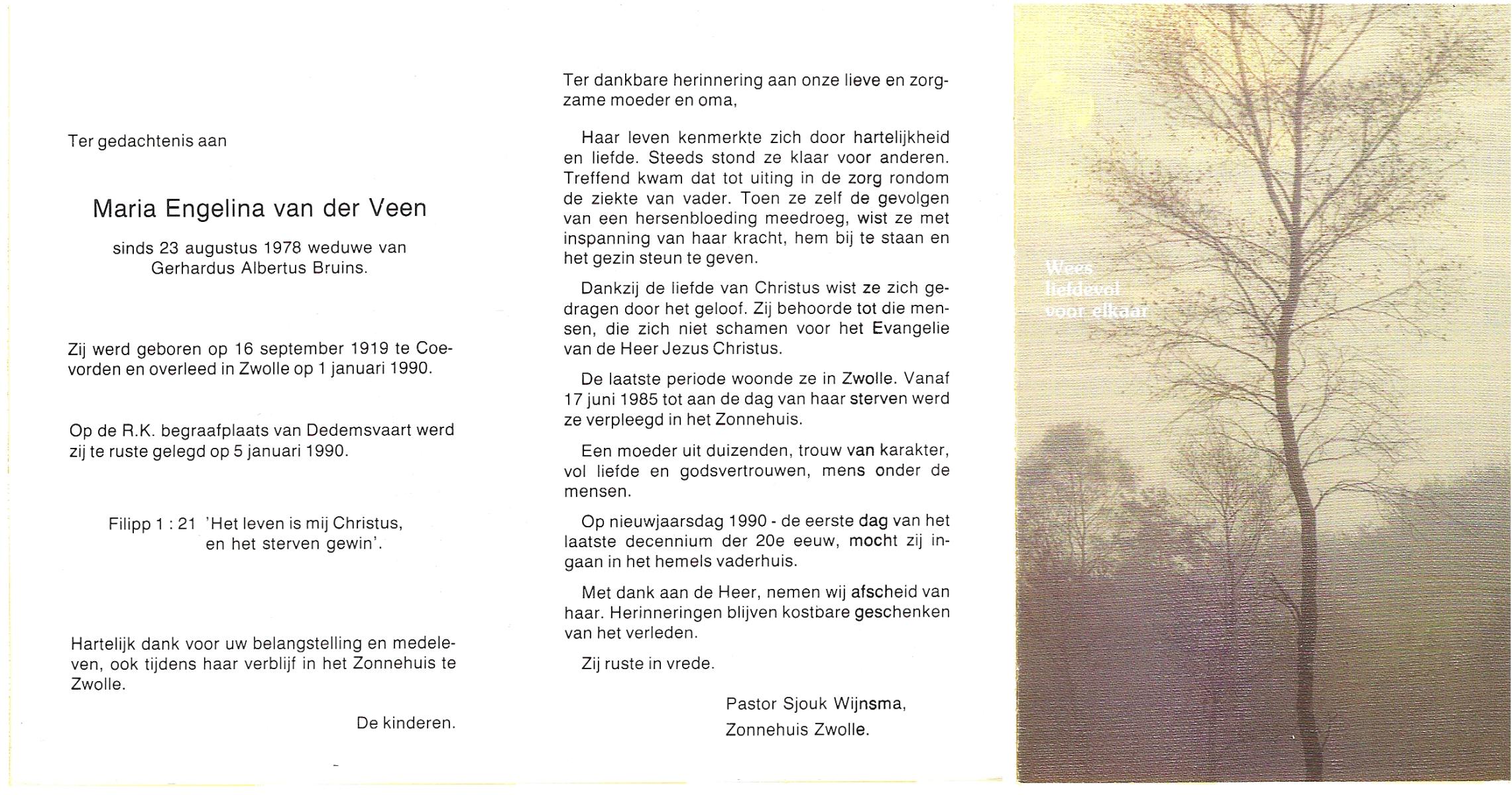 VEEN, van der, Maria Engelina, geboren op 16-9-1919 te Coevorden, overleden op 1-1-1990 te Zwolle op 70-jarige leeftijd, begraven op 5-1-1990 te Dedemsvaart.