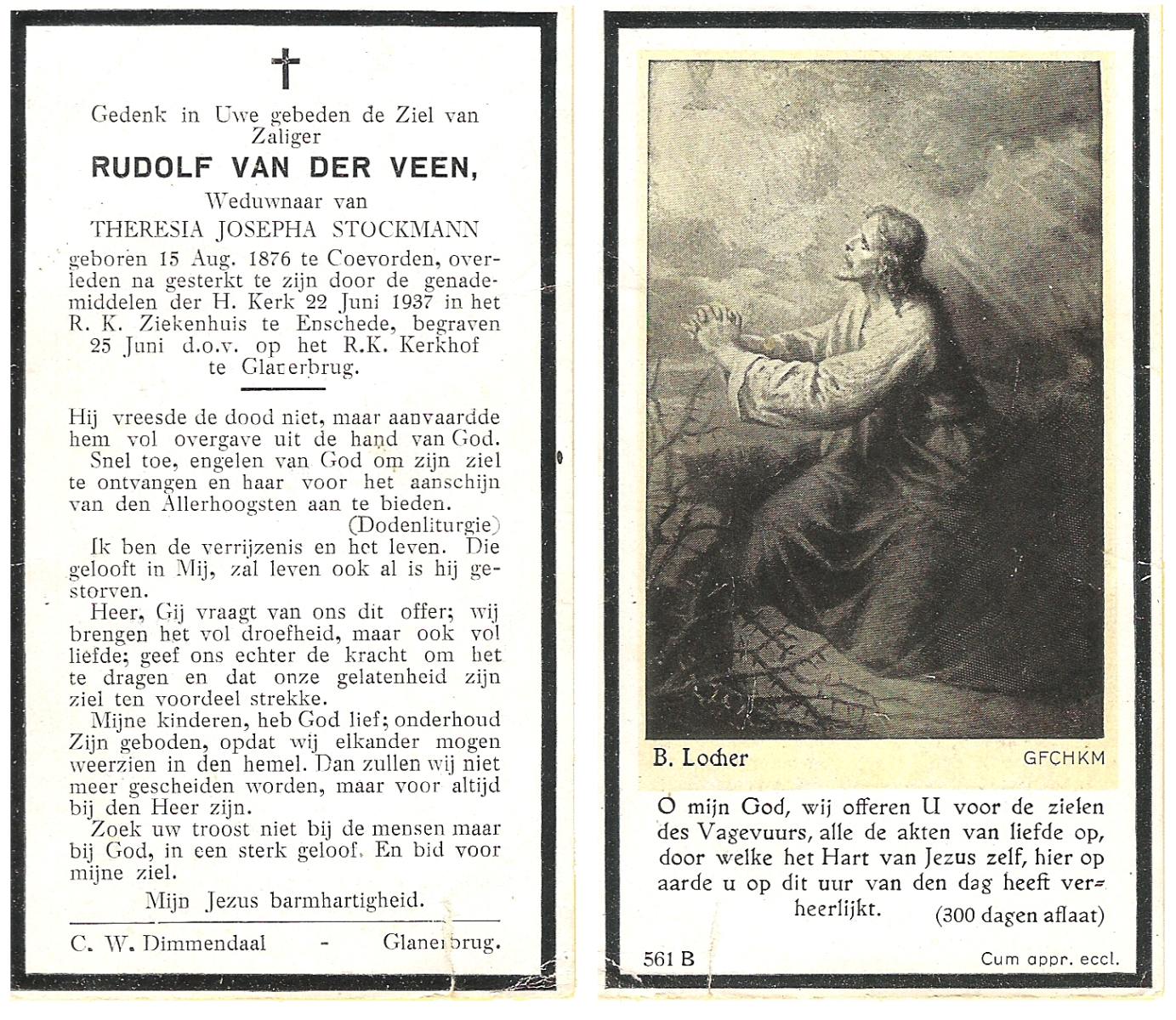 VEEN, Van der, Rudolf, geboren op 15-08-1876 te Coevorden, overleden op 22-6-1937 te Enschede op 60-jarige leeftijd, begraven op 25-6-1937 te Glanerbrug.