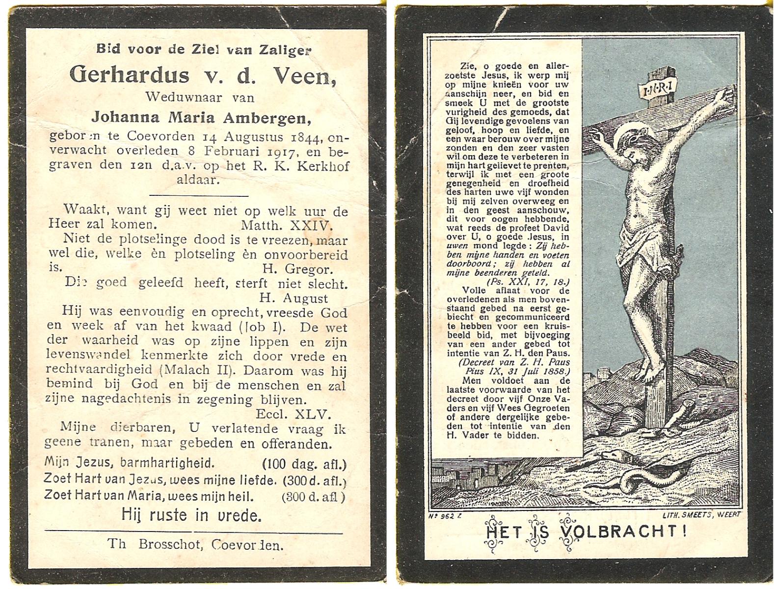 VEEN, v.d., Gerhardus, geboren op 14-08-1844 te Coevorden, overleden op 8-2-1917 te Coevorden op 72-jarige leeftijd, begraven op 12-2-1917 te Coevorden.