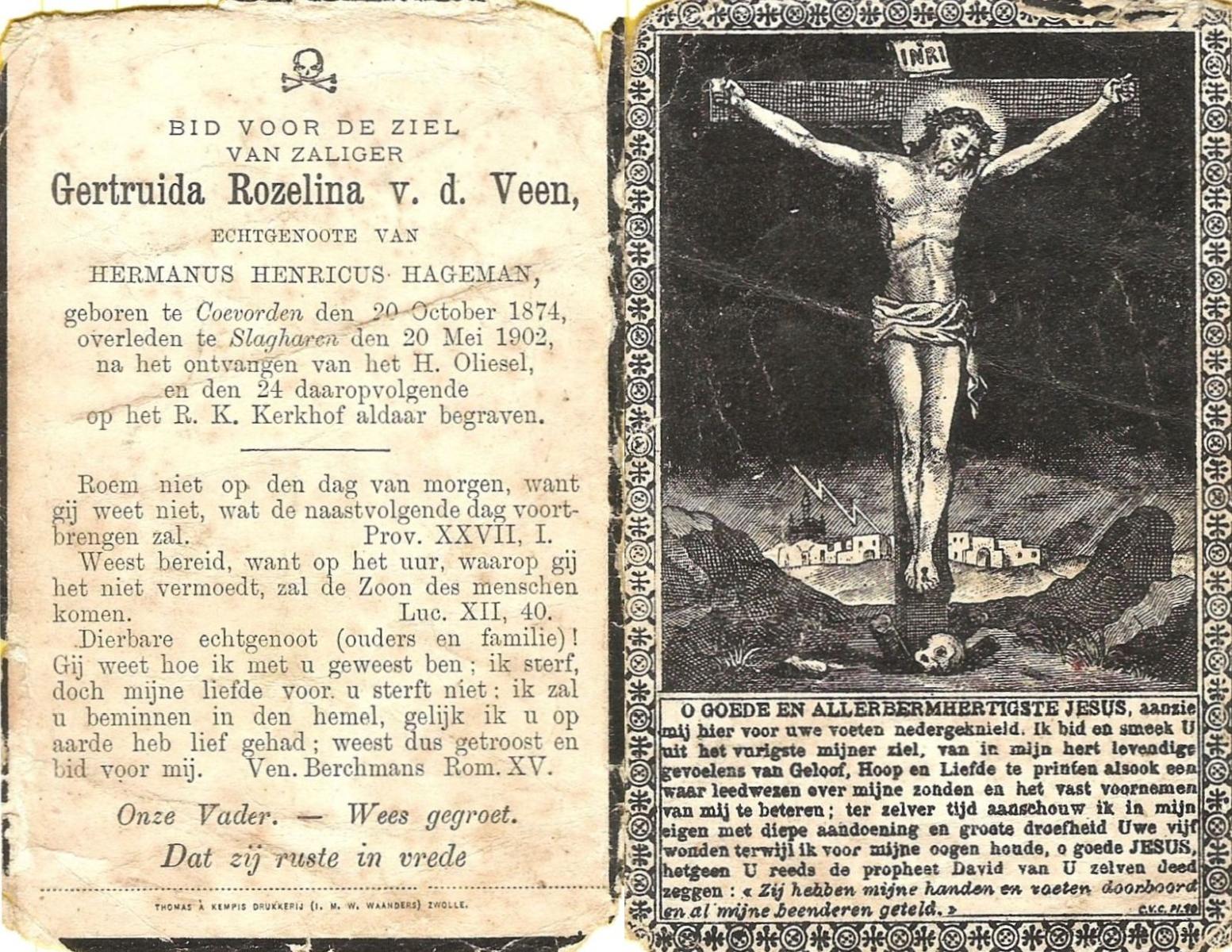 VEEN, v.d., Gertruida Rozelina, geboren op 20-10-1874 te Coevorden, overleden op 20-5-1902 te Slagharen op 27-jarige leeftijd, begraven op 24-5-1902 te Slagharen.