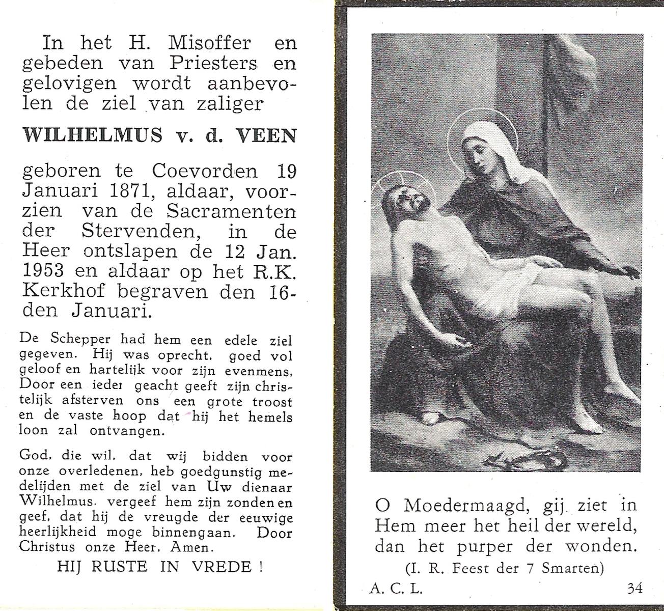 VEEN, v.d., Wilhelmus, geboren op 19-01-1871 te Coevorden, overleden op 12-1-1953 te Coevorden op 81-jarige leeftijd, begraven op 16-1-1953 te Coevorden.