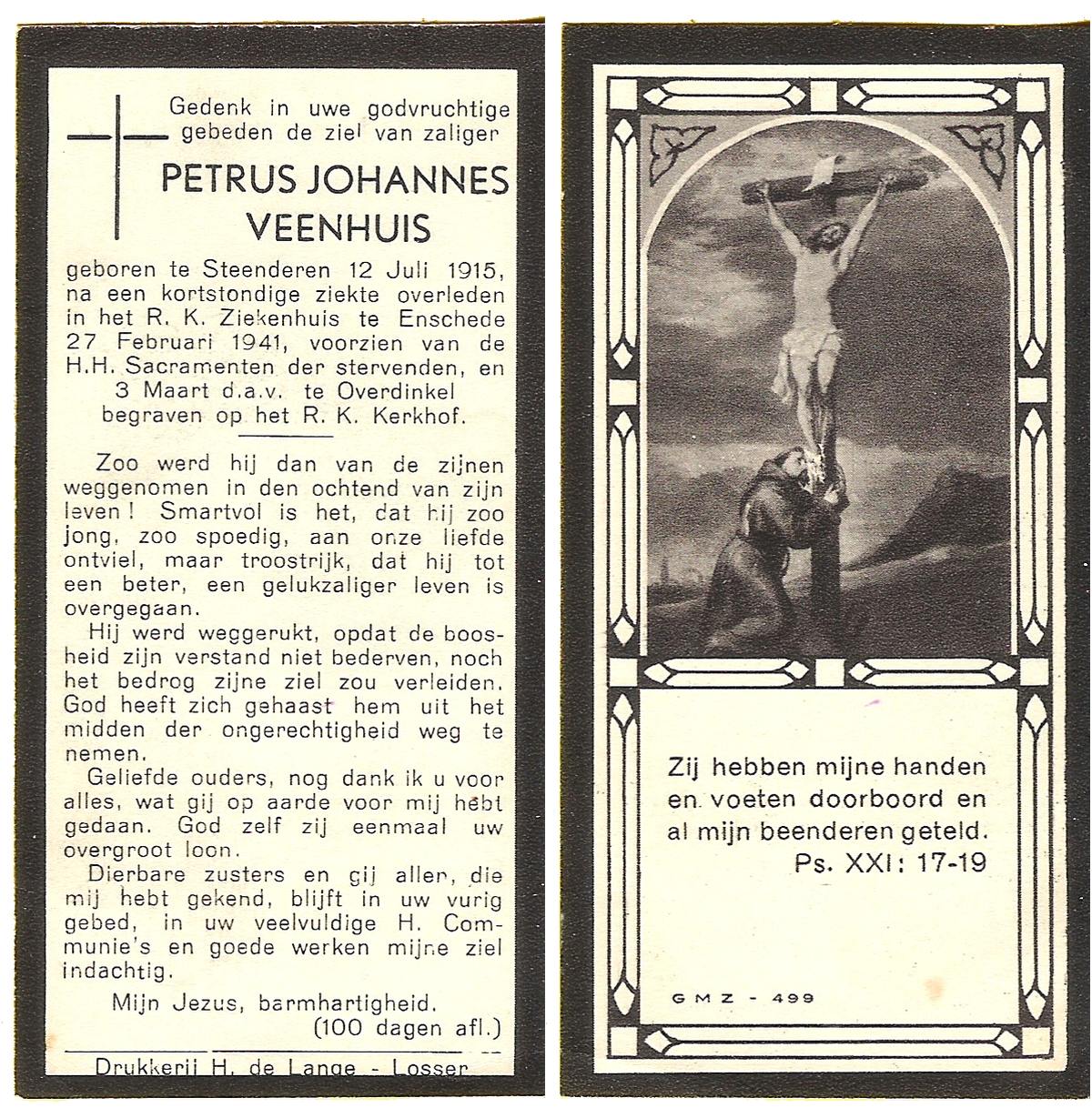 VEENHUIS, Petrus Joannes, geboren op 12-7-1915 te Steenderen, overleden op 27-2-1941 te Enschede op 25-jarige leeftijd, begraven op 3-3-1941 te Overdinkel.