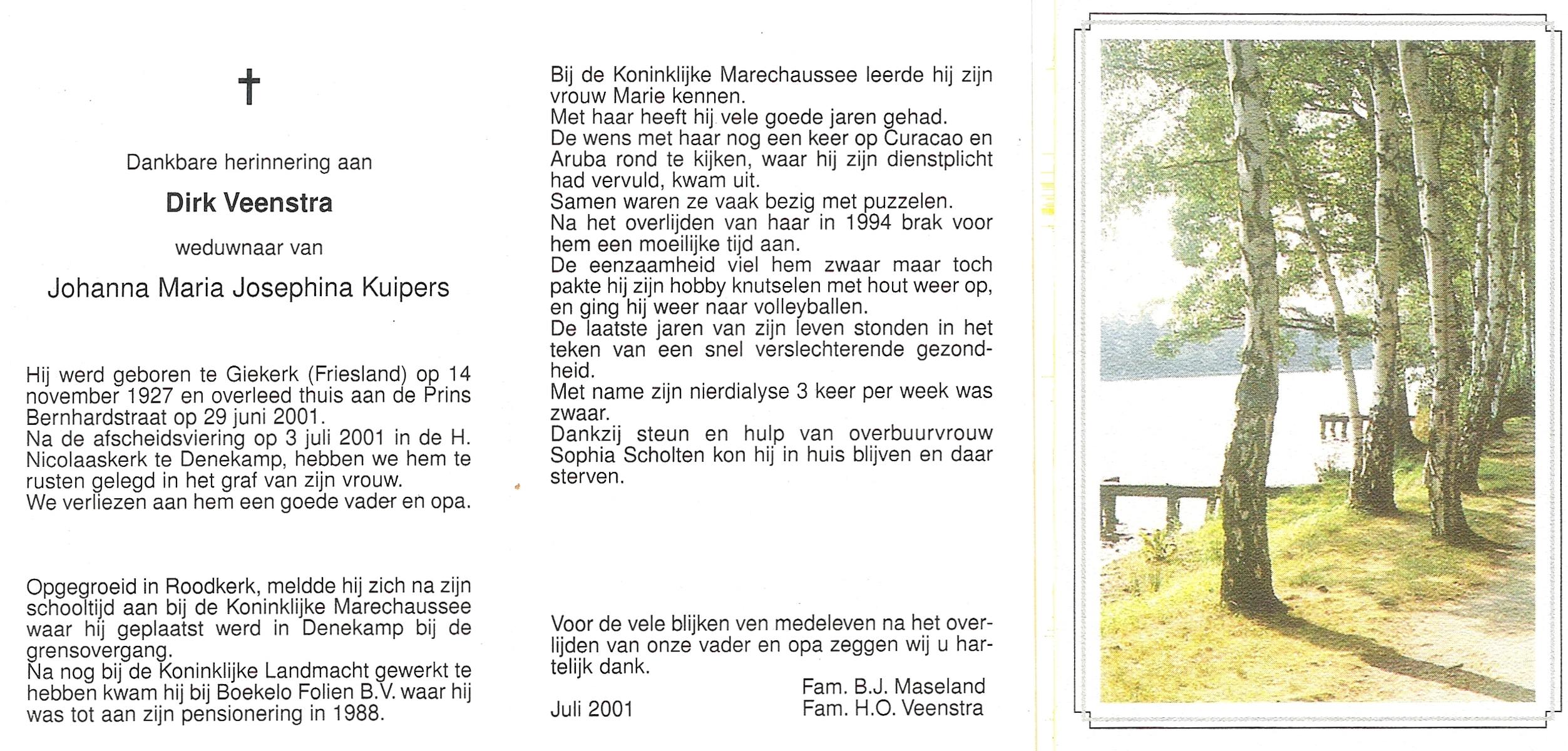 VEENSTRA, Dirk, geboren op 14-11-1927 te Giekerk (Friesland), overleden op 29-6-2001 te Denekamp op 73-jarige leeftijd, begraven op 3-7-2001 te Denekamp R.K.kerkhof.