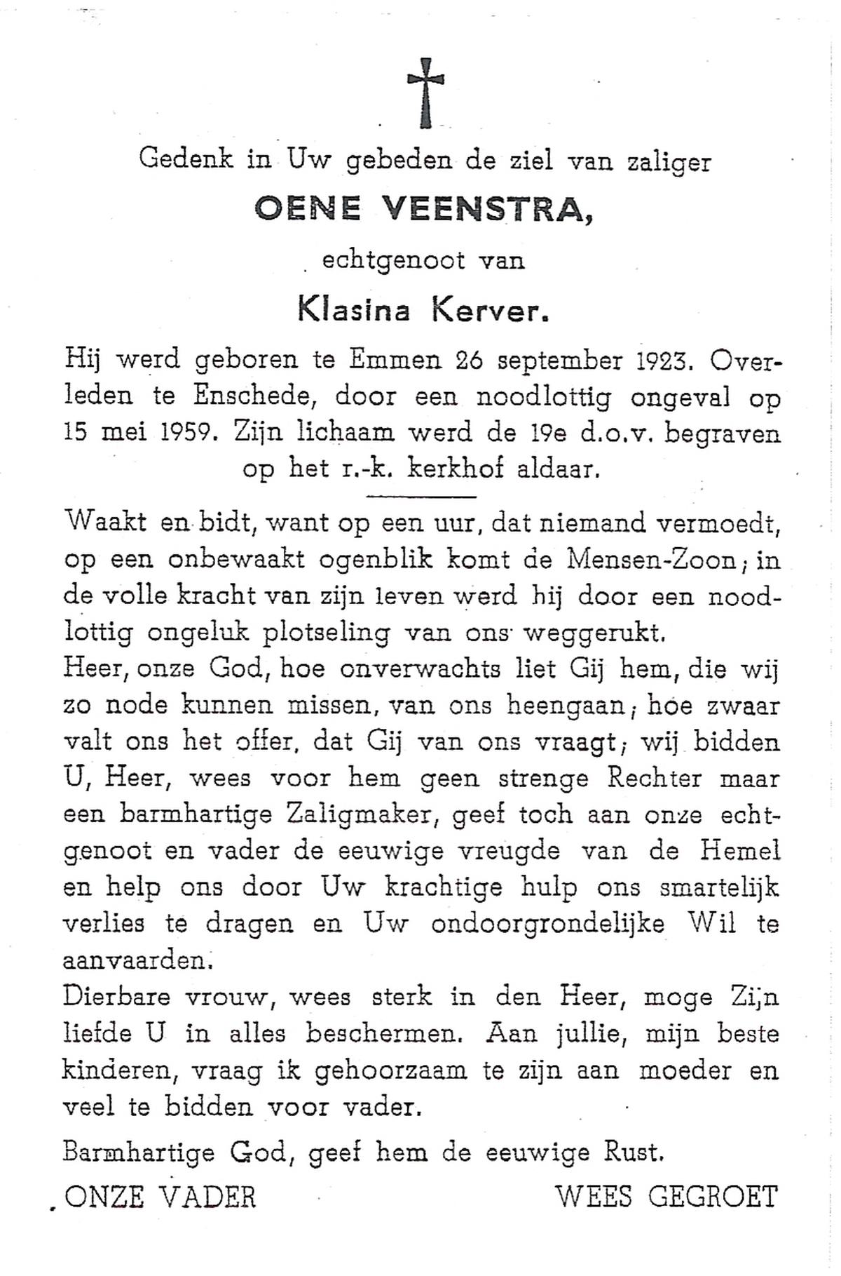 VEENSTRA, Oene, geboren op 26-9-1923 te Emmen, overleden op 15-5-1959 te Enschede op 35-jarige leeftijd, begraven op 19-5-1959 te Enschede.