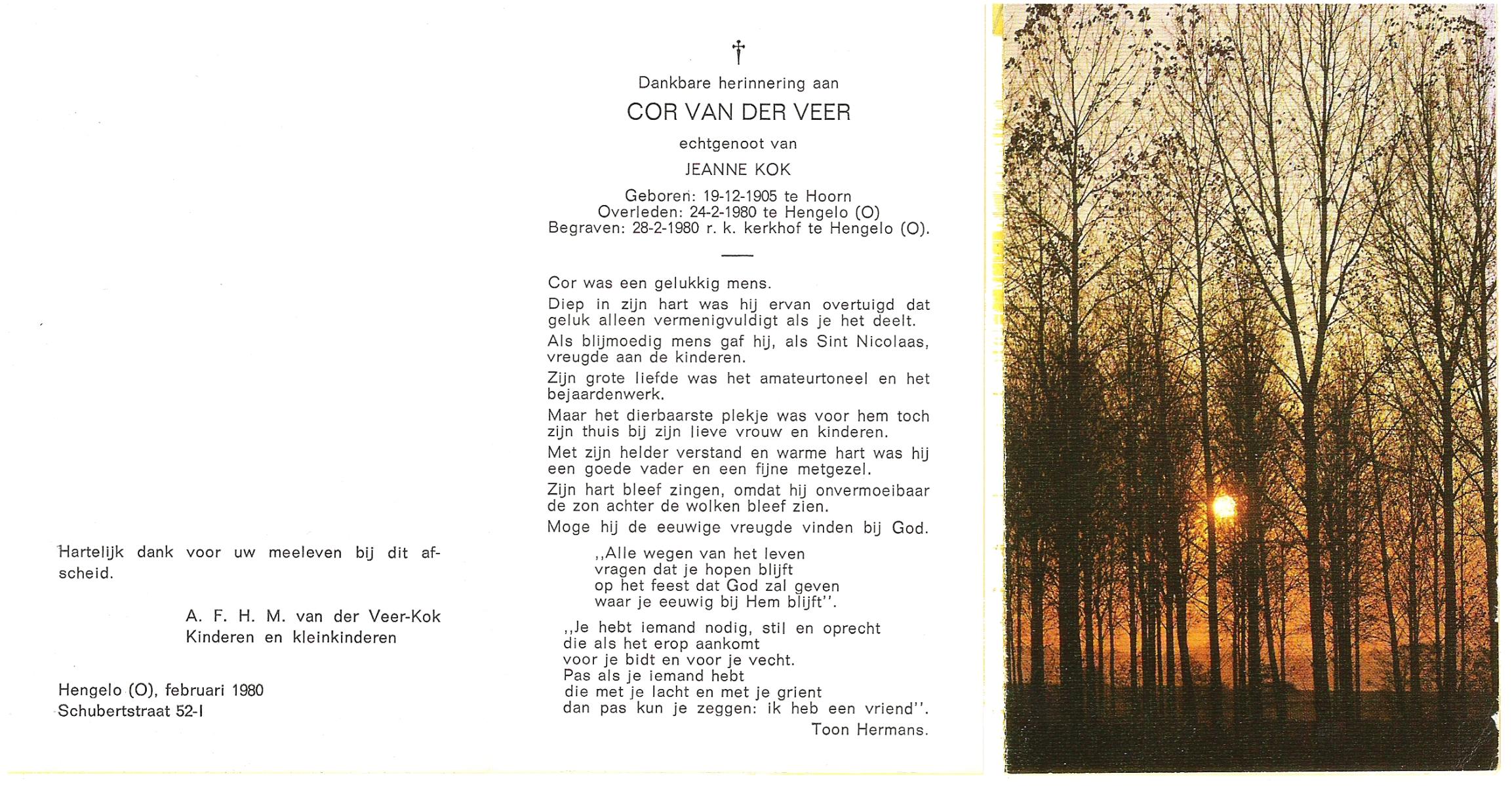 VEER, van der, Cor, geboren op 19-12-1905 te Hoorn, overleden op 24-2-1980 te Hengelo (Ov.) op 74-jarige leeftijd, begraven op 28-2-1980 te Hengelo (Ov.).