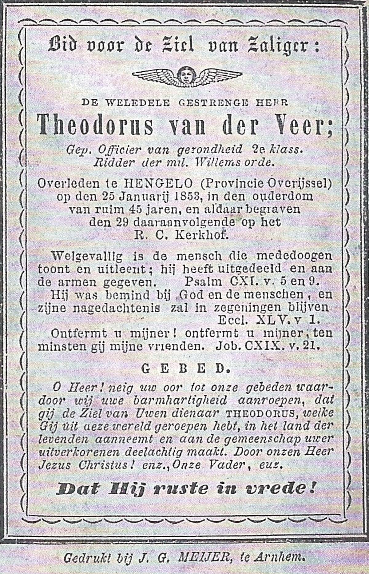 VEER, van der, Theodorus, overleden op 25-01-1853 te Hengelo (Ov.) op 45-jarige leeftijd, begraven op 29-01-1853 te Hengelo (Ov.).